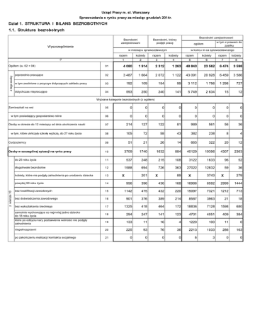 Urząd Pracy m. st. Warszawy Sprawozdanie o rynku pracy za miesiąc grudzień 2014r. Dział 1. STRUKTURA I BILANS BEZROBOTNYCH 1.1. Struktura bezrobotnych Bezrobotni zarejestrowani Bezrobotni, którzy podjęli pracę Bezrobotni zarejestrowani w miesiącu sprawozdawczym 0 z tego osoby Ogółem (w. 02 + 04) w tym z prawem do zasiłku ogółem Wyszczególnienie w końcu m-ca sprawozdawczego razem kobiety razem kobiety razem kobiety razem kobiety 1 2 3 4 5 6 7 8 01 4 080 1 914 2 312 1 263 48 840 23 562 6 474 3 598 poprzednio pracujące 02 3 487 1 664 2 072 1 122 43 091 20 928 6 459 3 586 w tym zwolnione z przyczyn dotyczących zakładu pracy 03 192 109 154 99 3 112 1 756 1 298 727 dotychczas niepracujące 04 593 250 240 141 5 749 2 634 15 12 Wybrane kategorie bezrobotnych (z ogółem) 05 0 0 0 0 0 0 0 0 06 0 0 0 0 0 0 0 0 Osoby w okresie do 12 miesięcy od dnia ukończenia nauki 07 214 127 122 81 989 561 56 36 w tym, które ukńczyły szkołę wyższą, do 27 roku życia 08 105 72 58 43 382 238 8 4 Cudzoziemcy 09 51 21 26 14 665 322 20 12 Osoby w szczególnej sytuacji na rynku pracy 10 3709 1740 1632 884 40129 19396 4307 2363 do 25 roku życia 11 537 248 215 108 3122 1633 96 52 długotrwale bezrobotne 12 1588 694 726 363 27022 12832 59 36 kobiety, które nie podjęły zatrudnienia po urodzeniu dziecka 13 powyżej 50 roku życia 14 956 396 436 168 bez kwalifikacji zawodowych 15 1142 475 432 bez doświadczenia zawodowego 16 901 376 bez wykształcenia średniego 17 1325 samotnie wychowujące co najmniej jedno dziecko do 18 roku życia 18 które po odbyciu kary pozbawienia wolności nie podjęły zatrudnienia Zamieszkali na wsi z wiersza 10 w tym posiadający gospodarstwo rolne 201 3743 X 16986 6592 2999 1444 220 15097 7321 1212 713 389 214 8587 3963 21 18 418 464 172 18836 7128 1598 680 294 247 141 123 4701 4051 409 384 19 133 11 16 4 1220 100 11 0 niepełnosprawni 20 225 93 76 36 2213 1033 286 163 po zakończeniu realizacji kontraktu socjalnego 21 0 0 0 0 6 3 0 0 X 89 X X 279 1.2. Bilans bezrobotnych Wyszczególnienie 0 Ogółem Kobiety 1 2 Z ogółem zamieszkali na wsi razem kobiety 3 4 Z ogółem z prawem do zasiłku razem kobiety 5 6 22 50093 24267 0 0 6576 3677 Bezrobotni zarejestrowani w miesiącu sprawozdawczym (24+25) 23 4080 1914 0 0 902 506 po raz pierwszy 24 1194 606 0 0 390 232 po raz kolejny 25 2886 1308 0 0 512 274 po pracach interwencyjnych 26 2 2 0 0 1 1 po robotach publicznych 27 0 0 0 0 0 0 po stażu 28 165 109 0 0 3 3 po odbyciu przygotowania zawodowego dorosłych 29 0 0 0 0 0 0 po szkoleniu 30 268 137 0 0 41 26 po pracach społecznie użytecznych 31 99 59 0 0 po zakończeniu indywidualnego programu zatrudnienia socjalnego lub kontraktu socjalnego 32 0 0 0 0 33 5333 2619 0 0 34 2312 1263 0 0 35 2124 1163 0 0 36 0 0 0 0 subsydiowanej (w. 38 + 39 do 42) 37 188 100 0 0 prac interwencyjnych 38 19 12 0 0 robót publicznych 39 0 0 0 0 podjęcia działalności gospodarczej 40 69 36 0 0 podjęcia pracy w ramach refundacji kosztów zatrudnienia bezrobotnego 41 88 46 0 0 inne 42 12 6 0 0 rozpoczęcia szkolenia 43 54 33 0 0 rozpoczęcia stażu 44 78 52 0 0 rozpoczęcia przygotowania zawodowego dorosłych 45 0 0 0 0 rozpoczęcia pracy społecznie użytecznej 46 0 0 0 0 rozpoczęcia realizacji indywidualnego programu zatrudnienia socjalnego lub podpisania kontraktu socjalnego 47 0 0 0 0 odmowy bez uzasadnionej przyczyny przyjęcia propozycji odpowiedniej pracy lub innej formy pomocy 48 20 9 0 0 niepotwierdzenia gotowości do pracy 49 2243 901 0 0 dobrowolnej rezygnacji ze statusu bezrobotnego 50 158 95 0 0 podjęcia nauki 51 5 3 0 0 ukończenia 60 / 65 lat i więcej 52 143 94 0 0 nabycia praw emerytalnych lub rentowych 53 65 31 0 0 nabycia praw do świadczenia przedemerytalnego 54 94 66 0 0 innych 55 161 72 0 0 56 48840 23562 0 0 57 15998 8198 0 0 z wiersza 23 z tego Bezrobotni według stanu w końcu m-ca poprzedzającego sprawozdanie Osoby wyłączone z ewidencji bezrobotnych w m-cu sprawozdawczym (w. 34+43 do 55) podjęcia pracy w m-cu sprawozdawczym (w. 35+37) niesubsydiowanej z tego z przyczyn z tego z tego w tym pracy sezonowej Bezrobotni według stanu w końcu m-ca sprawozdawczego (w. 22+23-33) w tym zarejestrowani po raz pierwszy 1.3. Bilans wybranych kategorii bezrobotnych, będących w szczególnej sytuacji na rynku pracy Do 25 roku życia Wyszczególnienie razem 1 0 Powyżej 50 roku życia kobiety 2 razem 3 kobiety 4 Długotrwale bezrobotni razem 5 kobiety 6 58 3316 1762 17235 6700 27762 13243 Bezrobotni zarejestrowani w miesiącu sprawozdawczym (w. 60+61) 59 537 248 956 396 1588 694 po raz pierwszy 60 246 112 202 89 po raz kolejny (od 1990 r.) 61 291 136 754 307 1588 694 po pracach interwencyjnych 62 0 0 1 1 1 1 po robotach publicznych 63 0 0 0 0 0 0 po stażu 64 56 34 35 26 52 33 po odbyciu przygotowania zawodowego dorosłych 65 0 0 0 0 0 0 po szkoleniu 66 34 17 42 20 109 54 po pracach społecznie użytecznych 67 0 0 49 21 87 49 po zakończeniu indywidualnego programu zatrudnienia socjalnego lub kontraktu socjalnego 68 0 0 0 0 0 0 69 663 336 1205 504 2328 1105 70 215 108 436 168 726 363 niesubsydiowanej 71 190 93 410 155 682 338 w tym pracy sezonowej 72 0 0 0 0 0 0 subsydiowanej (w. 74 + 75 do 78) 73 25 15 26 13 44 25 prac interwencyjnych 74 5 3 4 2 5 4 robót publicznych 75 0 0 0 0 0 0 podjęcia działalności gospodarczej 76 7 4 9 4 18 9 podjęcia pracy w ramach refundacji kosztów zatrudnienia bezrobotnego 77 11 6 10 5 17 10 inne 78 2 2 3 2 4 2 rozpoczęcia szkolenia 79 7 5 9 6 22 15 rozpoczęcia stażu 80 42 28 6 4 11 7 rozpoczęcia przygotowania zawodowego dorosłych 81 0 0 0 0 0 0 rozpoczęcia pracy społecznie użytecznej 82 0 0 0 0 0 0 rozpoczęcia realizacji indywidualnego programu zatrudnienia socjalnego lub podpisania kontraktu socjalnego 83 0 0 0 0 0 0 odmowy bez uzasadnionej przyczyny przyjęcia propozycji odpowiedniego pracy lub innej formy pomocy 84 5 4 5 2 11 3 niepotwierdzenia gotowości do pracy 85 360 171 387 110 1294 570 dobrowolnej rezygnacji z statusu bez