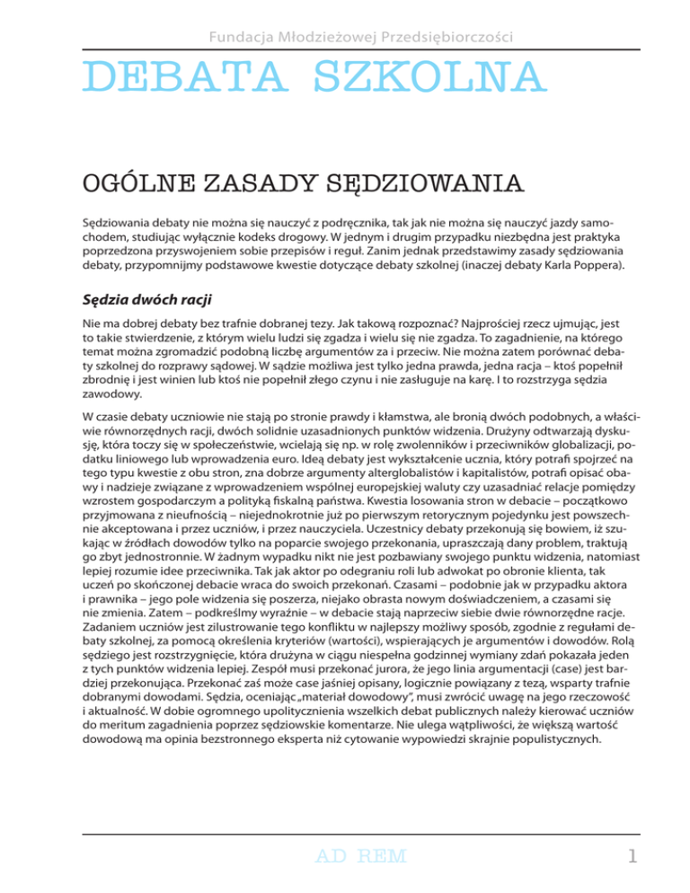 Fundacja Młodzieżowej Przedsiębiorczości DEBATA SZKOLNA OGÓLNE ZASADY SĘDZIOWANIA Sędziowania debaty nie można się nauczyć z podręcznika, tak jak nie można się nauczyć jazdy samochodem, studiując wyłącznie kodeks drogowy. W jednym i drugim przypadku niezbędna jest praktyka poprzedzona przyswojeniem sobie przepisów i reguł. Zanim jednak przedstawimy zasady sędziowania debaty, przypomnijmy podstawowe kwestie dotyczące debaty szkolnej (inaczej debaty Karla Poppera). Sędzia dwóch racji Nie ma dobrej debaty bez trafnie dobranej tezy. Jak takową rozpoznać? Najprościej rzecz ujmując, jest to takie stwierdzenie, z którym wielu ludzi się zgadza i wielu się nie zgadza. To zagadnienie, na którego temat można zgromadzić podobną liczbę argumentów za i przeciw. Nie można zatem porównać debaty szkolnej do rozprawy sądowej. W sądzie możliwa jest tylko jedna prawda, jedna racja – ktoś popełnił zbrodnię i jest winien lub ktoś nie popełnił złego czynu i nie zasługuje na karę. I to rozstrzyga sędzia zawodowy. W czasie debaty uczniowie nie stają po stronie prawdy i kłamstwa, ale bronią dwóch podobnych, a właściwie równorzędnych racji, dwóch solidnie uzasadnionych punktów widzenia. Drużyny odtwarzają dyskusję, która toczy się w społeczeństwie, wcielają się np. w rolę zwolenników i przeciwników globalizacji, podatku liniowego lub wprowadzenia euro. Ideą debaty jest wykształcenie ucznia, który potrafi spojrzeć na tego typu kwestie z obu stron, zna dobrze argumenty alterglobalistów i kapitalistów, potrafi opisać obawy i nadzieje związane z wprowadzeniem wspólnej europejskiej waluty czy uzasadniać relacje pomiędzy wzrostem gospodarczym a polityką fiskalną państwa. Kwestia losowania stron w debacie – początkowo przyjmowana z nieufnością – niejednokrotnie już po pierwszym retorycznym pojedynku jest powszechnie akceptowana i przez uczniów, i przez nauczyciela. Uczestnicy debaty przekonują się bowiem, iż szukając w źródłach dowodów tylko na poparcie swojego przekonania, upraszczają dany problem, traktują go zbyt jednostronnie. W żadnym wypadku nikt nie jest pozbawiany swojego punktu widzenia, natomiast lepiej rozumie idee przeciwnika. Tak jak aktor po odegraniu roli lub adwokat po obronie klienta, tak uczeń po skończonej debacie wraca do swoich przekonań. Czasami – podobnie jak w przypadku aktora i prawnika – jego pole widzenia się poszerza, niejako obrasta nowym doświadczeniem, a czasami się nie zmienia. Zatem – podkreślmy wyraźnie – w debacie stają naprzeciw siebie dwie równorzędne racje. Zadaniem uczniów jest zilustrowanie tego konfliktu w najlepszy możliwy sposób, zgodnie z regułami debaty szkolnej, za pomocą określenia kryteriów (wartości), wspierających je argumentów i dowodów. Rolą sędziego jest rozstrzygnięcie, która drużyna w ciągu niespełna godzinnej wymiany zdań pokazała jeden z tych punktów widzenia lepiej. Zespół musi przekonać jurora, że jego linia argumentacji (case) jest bardziej przekonująca. Przekonać zaś może case jaśniej opisany, logicznie powiązany z tezą, wsparty trafnie dobranymi dowodami. Sędzia, oceniając „materiał dowodowy”, musi zwrócić uwagę na jego rzeczowość i aktualność. W dobie ogromnego upolitycznienia wszelkich debat publicznych należy kierować uczniów do meritum zagadnienia poprzez sędziowskie komentarze. Nie ulega wątpliwości, że większą wartość dowodową ma opinia bezstronnego eksperta niż cytowanie wypowiedzi skrajnie populistycznych. AD REM 1 Fundacja Młodzieżowej Przedsiębiorczości Sędzia merytoryczny Z tego, iż prezentowana metoda nauczania opiera się na konflikcie dwóch idei, wynika jeszcze jeden wniosek, a mianowicie: debatę wygra ta drużyna, która daną rację wzmocni mądrzejszymi argumentami i lepszymi dowodami, a nie ta, która zrobi lepsze wrażenie za pomocą swojego wyglądu lub wyszukanych manier. Nauczyciel musi oczywiście dopilnować, by w czasie debaty publicznej uczestnicy byli schludnie ubrani i niebanalnie się wysławiali. Nie będzie jednak dobrym sędzią osoba, która oceniając debatę między uczniami świetnie przygotowanymi merytorycznie i ubranymi „nieodświętnie” a takimi, którzy temat rozumieją powierzchownie, lecz pozawerbalnie wywierają na widzach oszałamiające wrażenie, przyzna zwycięstwo tym drugim. Zdarza się, iż juror uwiedziony urodą występujących lub ich krasomówczą swadą lekceważy treść analizowanych argumentów i dowodów. Sędzia obiektywny Bardzo istotną cechą sędziego jest jego obiektywizm. Obserwując różne zawody sportowe, skupiamy się na rywalizacji zawodników, natomiast od jurora oczekujemy bezstronności i niefaworyzowania żadnej ze stron. Oczywiste jest, że podczas debat pokazowych lub konkursowych sędzia w żaden sposób nie może być związany z członkami drużyn, które ocenia. Tylko na pierwszym etapie uczenia dyskusji nauczyciel, prowadząc lekcje metodą debat, automatycznie staje się i trenerem, i sędzią. Obiektywizm, którego oczekujemy od oceniającego debatę, ma także inny wymiar. Każdy z nas przychodząc na debatę ekonomiczną, ma określone zdanie na temat zasadności wprowadzenia euro w 2012 roku lub zmiany systemu podatkowego. Sędzia, który ma rozstrzygnąć ten spór, na czas trwania debaty musi jednak zapomnieć o swoich przekonaniach. Musi je pozostawić przed salą, w której odbywa się retoryczny pojedynek. Juror jest zobowiązany skupić się wyłącznie na tym, co stanie się w sali w ciągu najbliższej godziny. W przeciwnym razie sędzia, prywatnie zwolennik podatku liniowego, będzie czwartym członkiem zespołu popierającego takie rozwiązanie. Trudno uznać taką postawę za sprawiedliwą. Istotna kwestia to także ocenianie debaty w kontekście wyłącznie tych stwierdzeń, które padają w sali. Może się bowiem zdarzyć, że juror konfrontuje wygłaszane mowy 