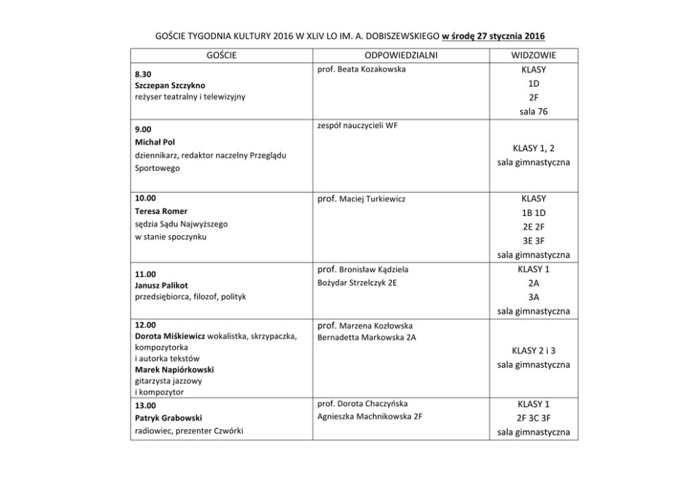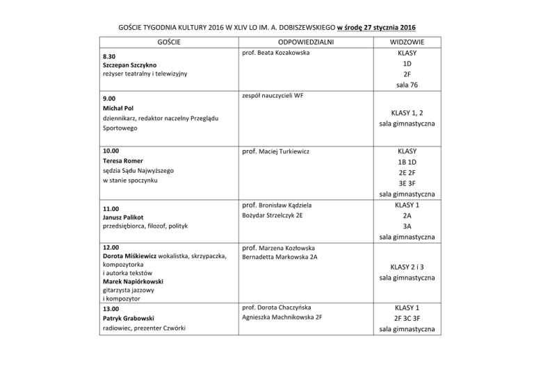 GOŚCIETYGODNIAKULTURY2016WXLIVLOIM.A.DOBISZEWSKIEGOwśrodę27stycznia2016 GOŚCIE 8.30 SzczepanSzczykno reżyserteatralnyitelewizyjny 9.00 MichałPol dziennikarz,redaktornaczelnyPrzeglądu Sportowego 10.00 TeresaRomer sędziaSąduNajwyższego wstaniespoczynku ODPOWIEDZIALNI prof.BeataKozakowska zespółnauczycieliWF KLASY1,2 salagimnastyczna prof.MaciejTurkiewicz 11.00 JanuszPalikot przedsiębiorca,filozof,polityk WIDZOWIE KLASY 1D 2F sala76 prof.BronisławKądziela BożydarStrzelczyk2E KLASY 1B1D 2E2F 3E3F salagimnastyczna KLASY1 2A 3A salagimnastyczna 12.00 DorotaMiśkiewiczwokalistka,skrzypaczka, kompozytorka iautorkatekstów MarekNapiórkowski gitarzystajazzowy ikompozytor prof.MarzenaKozłowska KLASY2i3 salagimnastyczna 13.00 PatrykGrabowski radiowiec,prezenterCzwórki prof.DorotaChaczyńska AgnieszkaMachnikowska2F KLASY1 2F3C3F salagimnastyczna BernadettaMarkowska2A