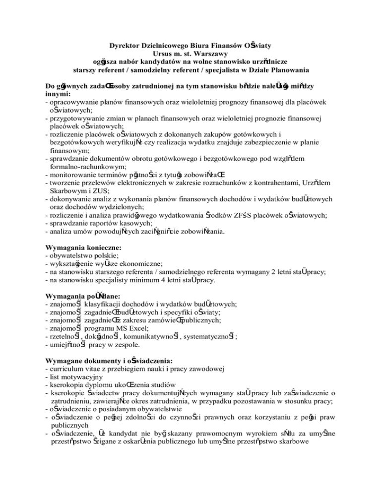 Dyrektor Dzielnicowego Biura Finansów Oświaty Ursus m. st. Warszawy ogłasza nabór kandydatów na wolne stanowisko urzędnicze starszy referent / samodzielny referent / specjalista w Dziale Planowania Do głównych zadań osoby zatrudnionej na tym stanowisku będzie należało między innymi: - opracowywanie planów finansowych oraz wieloletniej prognozy finansowej dla placówek oświatowych; - przygotowywanie zmian w planach finansowych oraz wieloletniej prognozie finansowej placówek oświatowych; - rozliczenie placówek oświatowych z dokonanych zakupów gotówkowych i bezgotówkowych weryfikując czy realizacja wydatku znajduje zabezpieczenie w planie finansowym; - sprawdzanie dokumentów obrotu gotówkowego i bezgotówkowego pod względem formalno-rachunkowym; - monitorowanie terminów płatności z tytułu zobowiązań; - tworzenie przelewów elektronicznych w zakresie rozrachunków z kontrahentami, Urzędem Skarbowym i ZUS; - dokonywanie analiz z wykonania planów finansowych dochodów i wydatków budżetowych oraz dochodów wydzielonych; - rozliczenie i analiza prawidłowego wydatkowania środków ZFŚS placówek oświatowych; - sprawdzanie raportów kasowych; - analiza umów powodujących zaciągnięcie zobowiązania. Wymagania konieczne: - obywatelstwo polskie; - wykształcenie wyższe ekonomiczne; - na stanowisku starszego referenta / samodzielnego referenta wymagany 2 letni staż pracy; - na stanowisku specjalisty minimum 4 letni staż pracy. Wymagania pożądane: - znajomość klasyfikacji dochodów i wydatków budżetowych; - znajomość zagadnień budżetowych i specyfiki oświaty; - znajomość zagadnień z zakresu zamówień publicznych; - znajomość programu MS Excel; - rzetelność, dokładność, komunikatywność, systematyczność; - umiejętność pracy w zespole. Wymagane dokumenty i oświadczenia: - curriculum vitae z przebiegiem nauki i pracy zawodowej - list motywacyjny - kserokopia dyplomu ukończenia studiów - kserokopie świadectw pracy dokumentujących wymagany staż pracy lub zaświadczenie o zatrudnieniu, zawierające okres zatrudnienia, w przypadku pozostawania w stosunku pracy; - oświadczenie o posiadanym obywatelstwie - oświadczenie o pełnej zdolności do czynności prawnych oraz korzystaniu z pełni praw publicznych - oświadczenie, że kandydat nie był skazany prawomocnym wyrokiem sądu za umyślne przestępstwo ścigane z oskarżenia publicznego lub umyślne przestępstwo skarbowe - zgoda na przetwarzanie danych osobowych o treści: „Wyrażam zgodę na przetwarzanie moich danych osobowych zawartych w ofercie pracy dla potrzeb tej rekrutacji, zgodnie z ustawą z dnia 29.08.1997 r. o ochronie danych osobowych (Dz. U. z 2016.poz.922) Osoby zainteresowane prosimy o przesłanie pocztą kompletu dokumentów do dnia 30.12.2016r. (decyduje data stempla pocztowego) na adres: Dzielnicowe Biuro Finansów Oświaty Ursus m. st. Warszawy Plac Czerwca 1976 rok Nr 1 02-495 Warszawa Z dopiskiem na kopercie „Starszy referent / samodzielny referent / specjalista w Dziale Planowania”. Oferty odrzucone zostaną komisyjnie zniszczone.