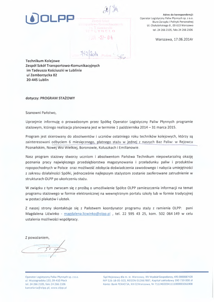 Adres do korespondencji: iXlOLPP ikaryjn ych im. 1. Kościuszki V P Ł Y N Ę Ł O : 3ft -07- 0 ^ 3 ^ o lk Operator Logistyczny Paliw Płynnych sp. z o.o. Biuro Zarządu i Polityki Personalnej Ul. Chałubińskiego 8 , 00-613 Warszawa tel. 24 266 2105, faks 24 266 2106 Warszawa, 17.06.2014r -'Podpis. Technikum Kolejowe Zespół Szkół Transportowo-Komunikacyjnych im Tadeusza Kościuszki w Lublinie ul Zemborzycka 82 20-445 Lublin dotyczy: PROGRAM STAŻOWY Szanowni Państwo, Uprzejmie informuję o prowadzonym przez Spółkę Operator Logistyczny Paliw Płynnych programie stażowym, którego realizacja planowana jest w terminie 1 października 2014 - 31 marca 2015. Program jest skierowany do absolwentów i uczniów ostatniego roku techników kolejowych, którzy są zainteresowani odbyciem 6 miesięcznego, płatnego stażu w jednej z naszych Baz Paliw: w Rejowcu Poznańskim, Nowej Wsi Wielkiej, Boronowie, Koluszkach i Emilianowie. Nasz program stażowy stworzy uczniom i absolwentom Państwa Technikum niepowtarzalną okazję poznania pracy największego przedsiębiorstwa magazynowania i przeładunku paliw i produktów ropopochodnych w Polsce oraz możliwość zdobycia doświadczenia zawodowego i nabycia umiejętności z zakresu działalności Spółki, jednocześnie najlepszym stażystom zostanie zaoferowane zatrudnienie w strukturach OLPP po ukończeniu stażu. W związku z tym zwracam się z prośbą o umożliwienie Spółce OLPP zamieszczenia informacji na temat programu stażowego w formie elektronicznej na wewnętrznym portalu szkoły lub w formie tradycyjnej w postaci plakatów i ulotek. Z naszej strony skontaktuje się z Państwem koordynator programu staży z ramienia OLPP: pani Magdalena Lićwinko - m ag d a le n a.licw in ko @ o lp p .p l , tel. 22 595 43 25, kom. 502 064 149 w celu ustalenia możliwości współpracy. Z poważaniem, Operator Logistyczny Paliw Płynnych sp. z o.o. ul. Wyszogrodzka 133, 09-410 Płock tel. 24 266 2105, faks 24 266 2106 kancelaria@ olpp.pl, www.olpp.pl Sąd Rejonowy dla m. st. Warszawy, XIV Wydział Gospodarczy, KRS 0000087428 NIP 526-18-05-923, REGON 012667887, Kapitał zakładowy 390 739 000 zł Konto: Bank PEKAO SA, XIII O/Warszawa, Nr 71124020341111000003066908 Operator Logistyczny Paliw Płynnych Sp. z o.o. jest największą na polskim rynku firmą oferującą usługi magazynowania zapasów i rezerw produktów ropopochodnych, a także obsługi logistycznej bieżącej konsumpcji paliw. Obecnie poszukujemy kandydatów na stanowisko: Stażysta w wybranych Bazach Paliw na terenie Polski Nr ref: STAŻ/BP/2014 Oczekiwania: • Status studenta ostatniego roku / absolwenta studiów technicznych lub technikum kolejowego. • Odpowiedzialność, sumienność i silna motywacja do rozwoju. • Zaangażowanie oraz otwartość na zdobywanie nowych umiejętności zawodowych. • Umiejętność działania w zespole i organizacji własnego czasu. • Dyspozycyjność i gotowość do relokacji na terenie kraju. Oferujemy: • • Możliwość rozwoju zawodowego poprzez uczestnictwo w 6-miesięcznym programie stażowym w jednej z wymienionych Baz Paliw: 4- Baza Paliw w Nowej Wsi Wielkiej (okolice Bydgoszczy), 4- Baza Paliw w Rejowcu Poznańskim (okolice Poznania), 4- Baza Paliw w Emilianowie (okolice Warszawy), i- Baza Paliw w Koluszkach (okolice Łodzi), 4- Baza Paliw w Boronowie (okolice Częstochowy) Zdobycie unikalnych umiejętności potwierdzonych zaświadczeniem odbycia stażu oraz referencjami. • Dla najlepszych możliwość zatrudnienia po ukończeniu stażu w jednym z trzech obszarów: automatyki, elektroenergetyki lub kolejowym. Osoby zainteresowane prosimy o przesłanie swojego CV i listu motywacyjnego do 31 lipca 2014 r. na adres: staz.pracv(S)olpp.pl W tytule maila prosimy podać numer referencyjny: STAŻ/BP/2014 oraz preferowaną Bazę Paliw. Prosimy o dopisanie następującej klauzuli „Wyrażam zgodę na przetwarzanie moich danych osobowych dla potrzeb obecnych oraz przyszłych procesów rekrutacyjnych prowadzonych przez spółkę „Operator Logistyczny Paliw Płynnych" sp. z o.o., zgodnie z postanowieniami ustawy z 29 sierpnia 1997 r. o ochronie danych osobowych (t.j. Dz. U. z 2002 r., nr. 101, poz. 926 z późń. zm.). Przekazuję moje dane dobrowolnie mając świadomość, że w każdej ch wili przysługuje mi prawo wglądu do moich danych oraz ich poprawiania lub usunięcia. Żądanie usunięcia danych oznacza rezygnację z dalszego udziału w procesach rekrutacyjnych i spowoduje niezwłoczne usunięcie moich danych". Uprzejmie informujemy, że skontaktujemy się wyłącznie z wybranymi kandydatami.