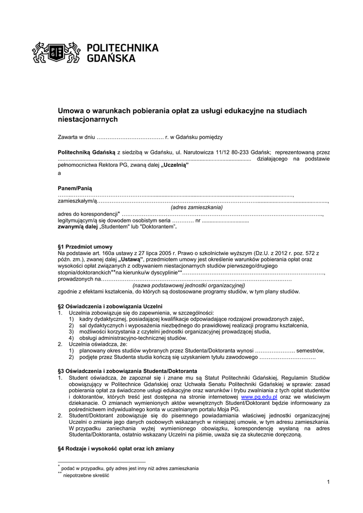 Umowa o warunkach pobierania opłat za usługi edukacyjne na studiach niestacjonarnych Zawarta w dniu ………………………………. r. w Gdańsku pomiędzy Politechniką Gdańską z siedzibą w Gdańsku, ul. Narutowicza 11/12 80-233 Gdańsk; reprezentowaną przez ............................................................................................................................... działającego na podstawie pełnomocnictwa Rektora PG, zwaną dalej „Uczelnią” a Panem/Panią ……..………………………………….................................................................................................., zamieszkałym/ą……………………………………………………………………………..............................................., (adres zamieszkania) adres do korespondencji* ……………………………………………………………………………………………….., legitymującym/ą się dowodem osobistym seria ………… nr ............................... zwanym/ą dalej „Studentem" lub "Doktorantem”. §1 Przedmiot umowy Na podstawie art. 160a ustawy z 27 lipca 2005 r. Prawo o szkolnictwie wyższym (Dz.U. z 2012 r. poz. 572 z późn. zm.), zwanej dalej „Ustawą”, przedmiotem umowy jest określenie warunków pobierania opłat oraz wysokości opłat związanych z odbywaniem niestacjonarnych studiów pierwszego/drugiego stopnia/doktoranckich**na kierunku/w dyscyplinie**………………………………………..………………….………, prowadzonych na…………………………………………..………………………………………….…… (nazwa podstawowej jednostki organizacyjnej) zgodnie z efektami kształcenia, do których są dostosowane programy studiów, w tym plany studiów. §2 Oświadczenia i zobowiązania Uczelni 1. Uczelnia zobowiązuje się do zapewnienia, w szczególności: 1) kadry dydaktycznej, posiadającej kwalifikacje odpowiadające rodzajowi prowadzonych zajęć, 2) sal dydaktycznych i wyposażenia niezbędnego do prawidłowej realizacji programu kształcenia, 3) możliwości korzystania z czytelni jednostki organizacyjnej prowadzącej studia, 4) obsługi administracyjno-technicznej studiów. 2. Uczelnia oświadcza, że: 1) planowany okres studiów wybranych przez Studenta/Doktoranta wynosi …………………. semestrów, 2) podjęte przez Studenta studia kończą się uzyskaniem tytułu zawodowego …………………………. §3 Oświadczenia i zobowiązania Studenta/Doktoranta 1. Student oświadcza, że zapoznał się i znane mu są Statut Politechniki Gdańskiej, Regulamin Studiów obowiązujący w Politechnice Gdańskiej oraz Uchwała Senatu Politechniki Gdańskiej w sprawie: zasad pobierania opłat za świadczone usługi edukacyjne oraz warunków i trybu zwalniania z tych opłat studentów i doktorantów, których treść jest dostępna na stronie internetowej www.pg.edu.pl oraz we właściwym dziekanacie. O zmianach wymienionych aktów wewnętrznych Student/Doktorant będzie informowany za pośrednictwem indywidualnego konta w uczelnianym portalu Moja PG. 2. Student/Doktorant zobowiązuje się do pisemnego powiadamiania właściwej jednostki organizacyjnej Uczelni o zmianie jego danych osobowych wskazanych w niniejszej umowie, w tym adresu zamieszkania. W przypadku zaniechania wyżej wymienionego obowiązku, korespondencję wysłaną na adres Studenta/Doktoranta, ostatnio wskazany Uczelni na piśmie, uważa się za skutecznie doręczoną. §4 Rodzaje i wysokość opłat oraz ich zmiany * podać w przypadku, gdy adres jest inny niż adres zamieszkania niepotrzebne skreślić ** 1 1. 2. 3. 4. 5. 6. 7. 8. 9. Student zobowiązuje się wnosić opłaty za: 1) kształcenie na studiach niestacjonarnych, 2) zajęcia nieobjęte planem studiów, w tym zajęcia uzupełniające efekty kształcenia niezbędne do podjęcia studiów drugiego stopnia na określonym kierunku. 3) przeprowadzanie potwierdzania efektów uczenia się. Doktorant zobowiązuje się wnosić opłaty za: 1) kształcenie na studiach niestacjonarnych, 2) prowadzenia zajęć nieobjętych planem studiów. Student/Doktorant zobowiązuje się ponadto do wnoszenia opłat związanych ze studiami wynikających z obowiązujących przepisów prawa powszechnego, w szczególności określanych w rozporządzeniach ministra właściwego do spraw szkolnictwa wyższego. Opłaty, o których mowa w ust.1, określa załącznik do niniejszej umowy, a opłaty, o których mowa w ust. 2, określa załącznik 2 do niniejszej umowy. Informację o wysokości opłat za usługi edukacyjne oraz wysokości kosztów ponoszonych w zakresie niezbędnym do świadczenia tych usług uczelnia zamieszcza na stronie internetowej www.pg.edu.pl . Wysokości opłat, o których mowa w ust. 1 pkt. 1 i 2 oraz w ust. 2, nie mogą przekraczać kosztów ponoszonych w zakresie niezbędnym do uruchomienia i prowadzenia w Uczelni przedmiotowych studiów oraz zajęć na tych studiach, z uwzględnieniem kosztów przygotowania i wdrażania strategii rozwoju Uczelni, w szczególności rozwoju kadr naukowych i infrastruktury dydaktyczno-naukowej, w tym amortyzacji i remontów. Zmiana wysokości opłat może nastąpić wyłącznie w przypadku wzrostu kosztów niezbędnych do uruchomienia i prowadzenia przez Politechnikę Gdańską danych studiów oraz zajęć na tych studiach stosownie do przepisu art. 99 ust. 2 Ustawy i dopuszczalna jest wyłącznie w drodze aneksu do umowy. O zmianie wysokości opłat Student/Doktorant będzie informowany za pośrednictwem indywidualnego konta email w uczelnianym portalu Moja PG nie później niż na 30 dni przed rozpoczęciem roku akademickiego, którego zmiany dotyczą z zastrzeżeniem postanowień ustępu 9. Student lub Doktorant, w terminie 14 dni od dnia odebrania wiadomości o zmianie wysokości opłat z załączonym aneksem do umowy, może zrezygnować z dalszej nauki, składając pisemne oświadczeni