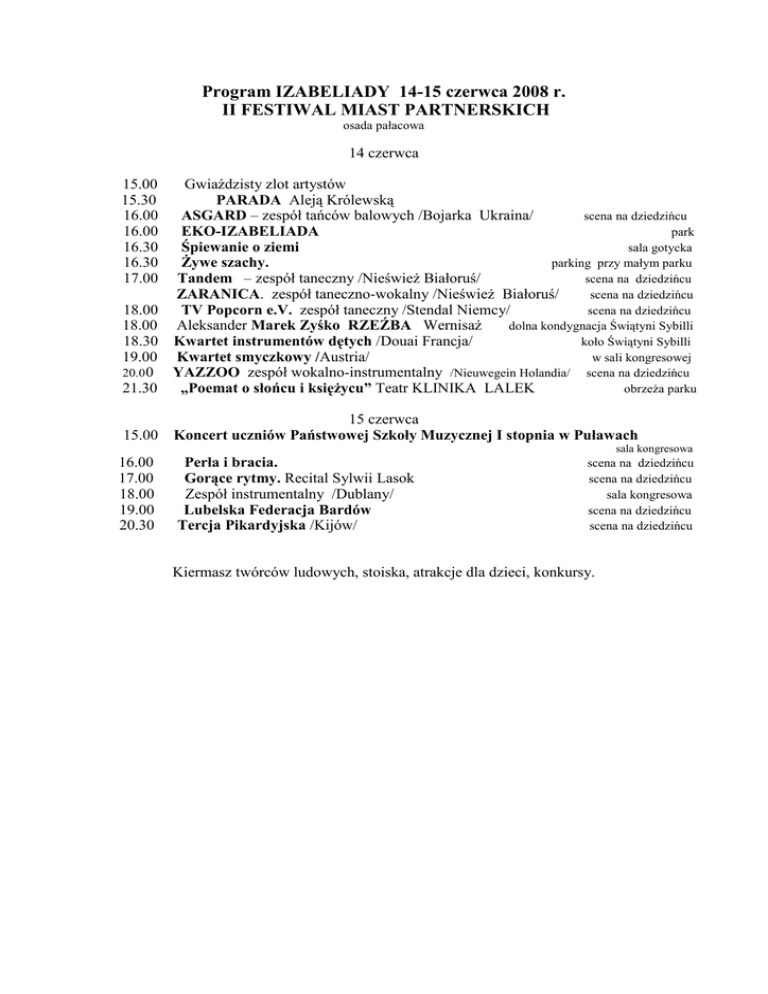 Program IZABELIADY 14-15 czerwca 2008 r. II FESTIWAL MIAST PARTNERSKICH osada pałacowa 14 czerwca 15.00 15.30 16.00 16.00 16.30 16.30 17.00 Gwiaździsty zlot artystów PARADA Aleją Królewską ASGARD – zespół tańców balowych /Bojarka Ukraina/ scena na dziedzińcu EKO-IZABELIADA park Śpiewanie o ziemi sala gotycka śywe szachy. parking przy małym parku Tandem – zespół taneczny /NieświeŜ Białoruś/ scena na dziedzińcu ZARANICA. zespół taneczno-wokalny /NieświeŜ Białoruś/ scena na dziedzińcu 18.00 TV Popcorn e.V. zespół taneczny /Stendal Niemcy/ scena na dziedzińcu 18.00 Aleksander Marek Zyśko RZEŹBA WernisaŜ dolna kondygnacja Świątyni Sybilli 18.30 Kwartet instrumentów dętych /Douai Francja/ koło Świątyni Sybilli 19.00 Kwartet smyczkowy /Austria/ w sali kongresowej 20.0 0 YAZZOO zespół wokalno-instrumentalny /Nieuwegein Holandia/ scena na dziedzińcu 21.30 „Poemat o słońcu i księŜycu” Teatr KLINIKA LALEK obrzeŜa parku 15.00 15 czerwca Koncert uczniów Państwowej Szkoły Muzycznej I stopnia w Puławach sala kongresowa 16.00 17.00 18.00 19.00 20.30 Perła i bracia. Gorące rytmy. Recital Sylwii Lasok Zespół instrumentalny /Dublany/ Lubelska Federacja Bardów Tercja Pikardyjska /Kijów/ scena na dziedzińcu scena na dziedzińcu sala kongresowa scena na dziedzińcu scena na dziedzińcu Kiermasz twórców ludowych, stoiska, atrakcje dla dzieci, konkursy.