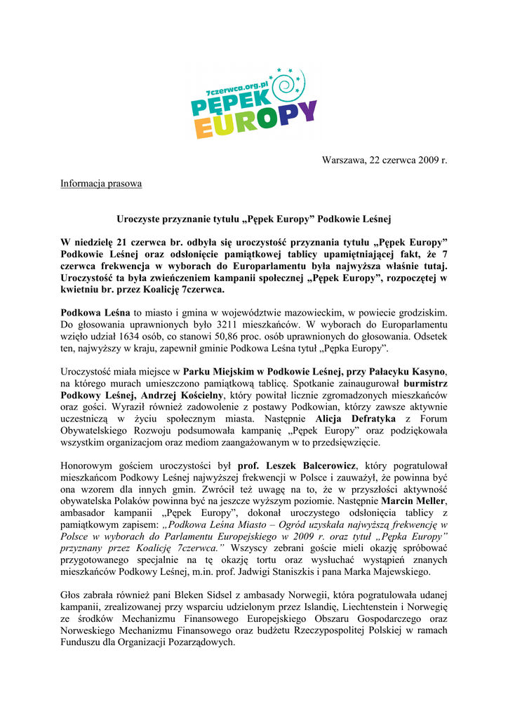 Warszawa, 22 czerwca 2009 r. Informacja prasowa Uroczyste przyznanie tytułu „Pępek Europy” Podkowie Leśnej W niedzielę 21 czerwca br. odbyła się uroczystość przyznania tytułu „Pępek Europy” Podkowie Leśnej oraz odsłonięcie pamiątkowej tablicy upamiętniającej fakt, Ŝe 7 czerwca frekwencja w wyborach do Europarlamentu była najwyŜsza właśnie tutaj. Uroczystość ta była zwieńczeniem kampanii społecznej „Pępek Europy”, rozpoczętej w kwietniu br. przez Koalicję 7czerwca. Podkowa Leśna to miasto i gmina w województwie mazowieckim, w powiecie grodziskim. Do głosowania uprawnionych było 3211 mieszkańców. W wyborach do Europarlamentu wzięło udział 1634 osób, co stanowi 50,86 proc. osób uprawnionych do głosowania. Odsetek ten, najwyŜszy w kraju, zapewnił gminie Podkowa Leśna tytuł „Pępka Europy”. Uroczystość miała miejsce w Parku Miejskim w Podkowie Leśnej, przy Pałacyku Kasyno, na którego murach umieszczono pamiątkową tablicę. Spotkanie zainaugurował burmistrz Podkowy Leśnej, Andrzej Kościelny, który powitał licznie zgromadzonych mieszkańców oraz gości. Wyraził równieŜ zadowolenie z postawy Podkowian, którzy zawsze aktywnie uczestniczą w Ŝyciu społecznym miasta. Następnie Alicja Defratyka z Forum Obywatelskiego Rozwoju podsumowała kampanię „Pępek Europy” oraz podziękowała wszystkim organizacjom oraz mediom zaangaŜowanym w to przedsięwzięcie. Honorowym gościem uroczystości był prof. Leszek Balcerowicz, który pogratulował mieszkańcom Podkowy Leśnej najwyŜszej frekwencji w Polsce i zauwaŜył, Ŝe powinna być ona wzorem dla innych gmin. Zwrócił teŜ uwagę na to, Ŝe w przyszłości aktywność obywatelska Polaków powinna być na jeszcze wyŜszym poziomie. Następnie Marcin Meller, ambasador kampanii „Pępek Europy”, dokonał uroczystego odsłonięcia tablicy z pamiątkowym zapisem: „Podkowa Leśna Miasto – Ogród uzyskała najwyŜszą frekwencję w Polsce w wyborach do Parlamentu Europejskiego w 2009 r. oraz tytuł „Pępka Europy” przyznany przez Koalicję 7czerwca.” Wszyscy zebrani goście mieli okazję spróbować przygotowanego specjalnie na tę okazję tortu oraz wysłuchać wystąpień znanych mieszkańców Podkowy Leśnej, m.in. prof. Jadwigi Staniszkis i pana Marka Majewskiego. Głos zabrała równieŜ pani Bleken Sidsel z ambasady Norwegii, która pogratulowała udanej kampanii, zrealizowanej przy wsparciu udzielonym przez Islandię, Liechtenstein i Norwegię ze środków Mechanizmu Finansowego Europejskiego Obszaru Gospodarczego oraz Norweskiego Mechanizmu Finansowego oraz budŜetu Rzeczypospolitej Polskiej w ramach Funduszu dla Organizacji Pozarządowych. Inicjatorami Koalicji 7czerwca są: Fundacja im. Stefana Batorego, Instytut Spraw Publicznych, Stowarzyszenie Projekt: Polska, Centrum Edukacji Obywatelskiej, Fundacja FOR, PKPP Lewiatan, Stowarzyszenie Komunikacji Marketingowej SAR, Stowarzyszenie Szkoła Liderów, Stowarzyszenie Przyjaciół Integracji, Fundacja im. Roberta Schumana, Związek Firm Public Relations, Mediacom, agencja Saatchi & Saatchi, agencja PZL. Więcej informacji udzielają: Alicja Defratyka Koordynator kampanii Fundacja FOR tel. 022 558 067, 0601 717 192 e-mail: [email protected] Emilia Legieta Młodszy Specjalista ds. Public Relations Fundacja FOR tel. 022 558 74, 0691 232 993 email: [email protected]