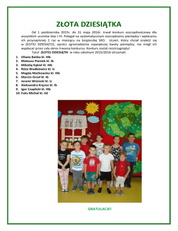 ZŁOTA DZIESIĄTKA Od 1 października 2015r. do 31 maja 2016r. trwał konkurs oszczędnościowy dla wszystkich uczniów klas I-VI. Polegał na systematycznym oszczędzaniu pieniędzy i wpłacaniu ich przynajmniej 2 raz w miesiącu na książeczkę SKO. Uczeń, który chciał znaleźć się w ZŁOTEJ DZIESIĄTCE, oprócz zgromadzenia największej kwoty pieniędzy, nie mógł ich wypłacać przez cały okres trwania konkursu. Konkurs został rozstrzygnięty! Tytuł ZŁOTEJ DZIESIĄTKI w roku szkolnym 2015/2016 otrzymali: 1. Oliwia Bańka kl. IIIb 2. Mateusz Pieniek kl. Ib 3. Mikołaj Kąkiel kl. IIIb 4. Róża Wudkiewicz kl. Ic 5. Magda Maćkowska kl. IIIb 6. Marcin Orzoł kl. Ib 7. Jeremi Wiśnicki kl. Ic 8. Aleksandra Kręcisz kl. Ib 9. Igor Czaplicki kl. IIIb 10. Fuks Michał kl. IId GRATULACJE!