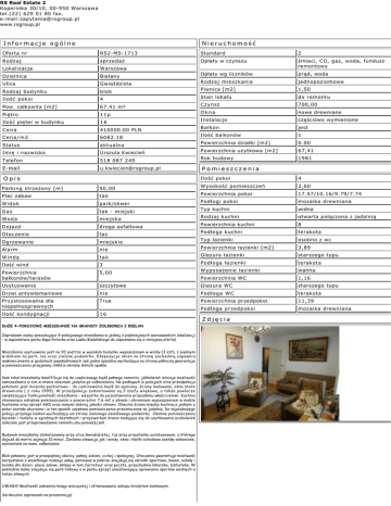 RS Real Estate 2 Kopernika 30/10, 00-950 Warszawa tel.(22) 629 01 80 fax. e-mail:[email protected] www.rsgroup.pl Informacje ogólne Nieruchomość Oferta nr RS2-MS-1713 Standard 2 Rodzaj sprzedaż Opłaty w czynszu Lokalizacja Warszawa śmieci, CO, gaz, woda, fundusz remontowy Dzielnica Bielany Opłaty wg liczników prąd, woda Gwiaździsta Rodzaj mieszkania jednopoziomowe Rodzaj budynku blok Piwnica [m2] 1,50 Ilość pokoi 4 Stan lokalu do remontu 67.41 m² Czynsz 700,00 11p Okna nowe drewniane 16 Instalacje częściowo wymienione 410000.00 PLN Balkon jest Cena/m2 6082.18 Ilość balkonów 1 Status aktualna Powierzchnia działki [m2] 0.00 Urszula Kwiecień Powierzchnia użytkowa [m2] 67,41 Telefon 518 087 249 Rok budowy 1981 E-mail [email protected] Ulica Pow. całkowita [m2] Piętro Ilość pięter w budynku Cena Imię i nazwisko Opis Pomieszczenia Ilość pokoi 4 50,00 Wysokość pomieszczeń 2,60 tak Powierzchnia pokoi 17.57/10.16/9.79/7.74 park/skwer Podłogi pokoi mozaika drewniana tak - miejski Typ kuchni widna Woda miejska Rodzaj kuchni otwarta połączona z jadalnią Dojazd droga asfaltowa Powierzchnia kuchni 8 las Podłoga kuchni terakota miejskie Typ łazienki osobno z wc nie Powierzchnia łazienki [m2] 3,89 Winda tak Glazura łazienki starszego typu Ilość wind 3 Podłoga łazienki terakota Powierzchnia balkonów/tarasów 5,00 Wyposażenie łazienki wanna Powierzchnia WC 1,16 Usytuowanie szczytowe Glazura WC starszego typu Drzwi antywłamaniowe nie Podłoga WC terakota Przystosowania dla niepełnosprawnych True Powierzchnia przedpokoi 11,39 Podłoga przedpokoi mozaika drewniana Ilość kondygnacji 16 Parking strzeżony [m] Plac zabaw Widok Gaz Otoczenie Ogrzewanie Alarm Zdjęcia DUŻE 4-POKOJOWE MIESZKANIE NA GRANICY ŻOLIBORZA I BIELAN Zapraszam osoby poszukujące 4-pokojowego mieszkania w jednej z piękniejszych warszawskich lokalizacji - w sąsiedztwie parku Kępa Potocka oraz Lasku Bielańskiego do zapoznania się z niniejszą ofertą! Mieszkanie usytuowane jest na XI piętrze w wysokim budynku wyposażonym w windy (3 szt), z pięknym widokiem na park, las oraz zielone podwórko. Ekspozycja okien na stronę zachodnią zapewnia nasłonecznienie w godzinach popołudniowych zaś jedna sypialnia wychodząca na stronę północną gwarantuje w pomieszczeniu przyjemny chłód w okresie letnich upałów. Sam lokal mieszkalny kwalifikuje się do częściowego bądź pełnego remontu, jakkolwiek istnieje możliwość zamieszkania w nim w stanie obecnym jedynie po odświeżeniu. Na podłogach w pokojach oraz przedpokoju położona jest mozaika parkietowa - do cyklinowania bądź do wymiany, ściany malowane, okna stare drewniane ( z roku 1999). W przedpokoju zamontowane są 3 szafy wnękowe, a także pawlacze zwiększające funkcjonalność mieszkania - wszystko do pozostawienia przyszłemu właścicielowi. Kuchnia stanowiąca odrębne pomieszczenie o powierzchni 7,6 m2 z oknem i skromnym wyposażeniem w meble kuchenne oraz sprzęt AGD oraz nowymi dobrej jakości oknami. Obecnie ściana między kuchnią a jednym z pokoi została zburzona i w ten sposób uzyskano pomieszczenie przeznaczone na jadalnię. Do największego pokoju przylega balkon wychodzący od strony zielonego osiedlowego podwórka. Osobne pomieszczenia łazienki i toalety w zgrabnych kształtach i przyzwoitym stanie nadające się do użytkowania aczkolwiek zalecane jest przeprowadzenie remontu obu pomieszczeń. Budynek mieszkalny zlokalizowany przy ulicy Gwiaździstej, tuż przy przystanku autobusowym, z którego dojazd do metra zajmuje 10 minut. Zarówno elewacja jak i windy, okna i klatki schodowe zostały odnowione, wymienione na nowe, odświeżone. Blok położony jest w przepięknej okolicy, pełnej zieleni, cichej i spokojnej. Otoczenie gwarantuje możliwość korzystania z wszelkiego rodzaju usług, ponieważ w pobliżu znajdują się ośrodki sportowe, basen, szkoły i boiska dla dzieci, place zabaw, sklepy w tym Carrefour oraz poczta, przychodnia lekarska, biblioteka. W pobliskim lasku znajduje się park linkowy a w parku sprzęt umożliwiający uprawianie sportów wodnych a także siłowych. UWAGA! Możliwość założenia księgi wieczystej i sfinansowania zakupu kredytem bankowym. Serdecznie zapraszam na prezentację! Urszula Kwiecień tel. 518 087 249 [email protected] © Wszelkie prawa zastrzeżone - RS Real Estate