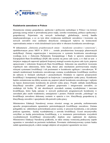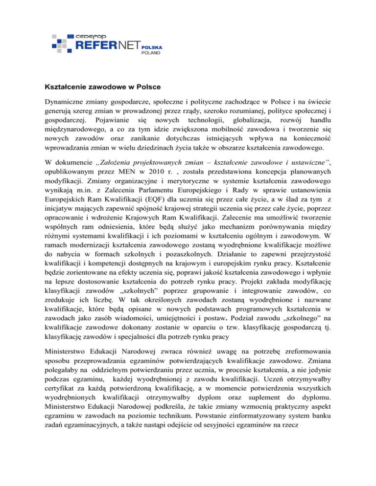 Kształcenie zawodowe w Polsce Dynamiczne zmiany gospodarcze, społeczne i polityczne zachodzące w Polsce i na świecie generują szereg zmian w prowadzonej przez rządy, szeroko rozumianej, polityce społecznej i gospodarczej. Pojawianie się nowych technologii, globalizacja, rozwój handlu międzynarodowego, a co za tym idzie zwiększona mobilność zawodowa i tworzenie się nowych zawodów oraz zanikanie dotychczas istniejących wpływa na konieczność wprowadzania zmian w wielu dziedzinach życia także w obszarze kształcenia zawodowego. W dokumencie „Założenia projektowanych zmian – kształcenie zawodowe i ustawiczne”, opublikowanym przez MEN w 2010 r. , została przedstawiona koncepcja planowanych modyfikacji. Zmiany organizacyjne i merytoryczne w systemie kształcenia zawodowego wynikają m.in. z Zalecenia Parlamentu Europejskiego i Rady w sprawie ustanowienia Europejskich Ram Kwalifikacji (EQF) dla uczenia się przez całe życie, a w ślad za tym z inicjatyw mających zapewnić spójność krajowej strategii uczenia się przez całe życie, poprzez opracowanie i wdrożenie Krajowych Ram Kwalifikacji. Zalecenie ma umożliwić tworzenie wspólnych ram odniesienia, które będą służyć jako mechanizm porównywania między różnymi systemami kwalifikacji i ich poziomami w kształceniu ogólnym i zawodowym. W ramach modernizacji kształcenia zawodowego zostaną wyodrębnione kwalifikacje możliwe do nabycia w formach szkolnych i pozaszkolnych. Działanie to zapewni przejrzystość kwalifikacji i kompetencji dostępnych na krajowym i europejskim rynku pracy. Kształcenie będzie zorientowane na efekty uczenia się, poprawi jakość kształcenia zawodowego i wpłynie na lepsze dostosowanie kształcenia do potrzeb rynku pracy. Projekt zakłada modyfikację klasyfikacji zawodów „szkolnych” poprzez grupowanie i integrowanie zawodów, co zredukuje ich liczbę. W tak określonych zawodach zostaną wyodrębnione i nazwane kwalifikacje, które będą opisane w nowych podstawach programowych kształcenia w zawodach jako zasób wiadomości, umiejętności i postaw. Podział zawodu „szkolnego” na kwalifikacje zawodowe dokonany zostanie w oparciu o tzw. klasyfikację gospodarczą tj. klasyfikację zawodów i specjalności dla potrzeb rynku pracy Ministerstwo Edukacji Narodowej zwraca również uwagę na potrzebę zreformowania sposobu przeprowadzania egzaminów potwierdzających kwalifikacje zawodowe. Zmiana polegałaby na oddzielnym potwierdzaniu przez ucznia, w procesie kształcenia, a nie jedynie podczas egzaminu, każdej wyodrębnionej z zawodu kwalifikacji. Uczeń otrzymywałby certyfikat za każdą potwierdzoną kwalifikację, a w momencie potwierdzenia wszystkich wyodrębnionych kwalifikacji otrzymywałby dyplom oraz suplement do dyplomu. Ministerstwo Edukacji Narodowej podkreśla, że takie zmiany wzmocnią praktyczny aspekt egzaminu w zawodach na poziomie technikum. Powstanie zinformatyzowany system banku zadań egzaminacyjnych, a także nastąpi odejście od sesyjności egzaminów na rzecz przeprowadzania ich w trybie całorocznym. Dostrzeżono także istotną rolę jaką powinni odegrać pracodawcy, stowarzyszenia zawodowe , organizacje samorządowe w tworzeniu i funkcjonowaniu ośrodków egzaminacyjnych, co zapewniłoby rzeczywiste warunki środowiska pracy. Proponowane zmiany w sposobie potwierdzania wyodrębnionych kwalifikacji przyczynią się do likwidacji systemu egzaminów na tytuły zawodowe, prowadzonych przez państwowe komisje egzaminacyjne, a sam system egzaminów zawodowych zostanie ujednolicony bez względu na formę uczenia się – szkolną czy pozaszkolną. Autor: Izabela Kowalska, Biuro Koordynacji Kształcenia Kadr, Fundacja “Fundusz Współpracy” Źródło: „ Założenia projektowanych zmian – Kształcenie zawodowe i ustawiczne” Informator, MEN, Warszawa 2010.