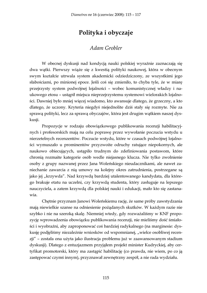 Diametros nr 16 (czerwiec 2008): 115 – 117 Polityka i obyczaje Adam Grobler W obecnej dyskusji nad kondycją nauki polskiej wyraźnie zaznaczają się dwa wątki. Pierwszy wiąŜe się z kwestią polityki naukowej, która w obecnym swym kształcie utrwala system akademicki odziedziczony, ze wszystkimi jego słabościami, po minionej epoce. Jeśli coś się zmieniło, to chyba tyle, Ŝe w miarę przejrzysty system podwójnej lojalności – wobec komunistycznej władzy i naukowego etosu – ustąpił miejsca nieprzejrzystemu systemowi wielorakich lojalności. Dawniej było mniej więcej wiadomo, kto awansuje dlatego, Ŝe grzeczny, a kto dlatego, Ŝe uczony. Kryteria niegdyś niejednolite dziś stały się rozmyte. Nie za sprawą polityki, lecz za sprawą obyczajów, która jest drugim wątkiem naszej dyskusji. Propozycje w rodzaju obowiązkowego publikowania recenzji habilitacyjnych i profesorskich mają na celu poprawę przez wywołanie poczucia wstydu u nierzetelnych recenzentów. Poczucie wstydu, które w czasach podwójnej lojalności wymuszało u prominentów przyzwoite odruchy ratujące niepokornych, ale naukowo obiecujących, ustąpiło trudnym do zdefiniowania postawom, które chronią rozmaite kategorie osób wedle niejasnego klucza. Nie tylko zwolnienie osoby z grupy nazwanej przez Jana Woleńskiego nieudacznikami, ale nawet zaniechanie zawarcia z nią umowy na kolejny okres zatrudnienia, postrzegane są jako jej „krzywda”. Nad krzywdą bardziej utalentowanego kandydata, dla którego brakuje etatu na uczelni, czy krzywdą studenta, który zasługuje na lepszego nauczyciela, a zatem krzywdą dla polskiej nauki i edukacji, mało kto się zastanawia. Chętnie przyznam Janowi Woleńskiemu rację, Ŝe same próby zawstydzania mają niewielkie szanse na odniesienie poŜądanych skutków. W kaŜdym razie nie szybko i nie na szeroką skalę. Niemniej wtedy, gdy rozwaŜaliśmy w KNF propozycję wprowadzenia obowiązku publikowania recenzji, nie mieliśmy dość śmiałości i wyobraźni, aby zaproponować coś bardziej radykalnego (na marginesie: dyskusję podjęliśmy niezaleŜnie wniosków od wspomnianej, „wielce osobliwej recenzji” – została ona uŜyta jako ilustracja problemu juŜ w zaawansowanym stadium dyskusji). Dlatego z entuzjazmem przyjąłem projekt minister Kudryckiej, aby certyfikat promotorski, który ma zastąpić habilitację (co prawda, nie wiem, po co ją zastępować czymś innym), przyznawał zewnętrzny zespół, a nie rada wydziału. 115 Adam Grobler Polityka i obyczaje No bo proszę: słucham kolokwium habilitacyjnego, dajmy na to, z historii. W dyskusji mówię, Ŝe wydaje mi się, iŜ kandydatka odpowiada niezupełnie na temat. Na to wstaje Naczelny Historyk Wydziału i mówi, Ŝe na temat i wyczerpująco. Jaki sens ma moje głosowanie? Nie znam się na problematyce rozprawy. Mój głos zatem nie jest wyrazem opinii w przedmiocie głosowania, lecz wyrazem zaufania lub jego braku do ekspertów uczestniczących w przewodzie. Czy zatem nie byłoby lepiej, aby decyzję podejmowało konsylium złoŜone z samych ekspertów, do tego ekspertów z natury mniej stronniczych od kolegów kandydatki z tego samego wydziału? Lepiej dla sprawy i lepiej dla mnie, bo mógłbym kilka godzin spędzić bardziej produktywnie. Generalnie, projekt ministerialny mi się podoba. Oczywiście, jest on na razie bardzo ogólnikowy i póki kurtyna się nie odsłoni do końca, za wcześnie na brawa. Nie widzę jednak powodu, aby z góry podchodzić do niego nieufnie, na przykład obawiać się dalszej inflacji profesur. Obecna ustawa równieŜ dopuszcza nadawanie tytułu z pominięciem habilitacji. Nie sądzę zatem, aby coś miało się w tym zakresie pogorszyć. Przeciwnie, dostrzegam w projekcie liczne sygnały intencji projektodawców zmierzających do obiektywizacji procedur. MoŜe to nic nie da, ale jeśli to nic nie da, to co coś da? śeby jednak zmiana procedur mogła coś dać, potrzebne są równoległe działania w sferze obyczaju. Jan Woleński słusznie zaznaczył, Ŝe najbliŜszym celem propozycji obowiązku publikowania recenzji było nie podniesienie moralności, ale zwykłej praworządności. Plagą jest bowiem uchylanie się recenzentów od orzekania, na czym polega wymagany ustawą wkład kandydata do dyscypliny. Kiedyś na posiedzeniu CK domagałem się, aby wystosować upomnienie pod adresem rady wydziału, która przyjęła recenzje ograniczające się do komplementów w rodzaju „głęboko rozwaŜa”, „szeroko analizuje”, bez Ŝadnej wzmianki na temat wytworów tych ambitnych czynności. Argumentowałem, Ŝe rada popełniła nie zwykły błąd proceduralny, lecz zaniechała ustalenia materialnej podstawy wniosku, nad którym głosowała. Bezskutecznie. Tymczasem – przynajmniej w moim poczuciu praworządności – uchwała rady była nielegalna, poniewaŜ podjęła ją bez sprawdzenia, czy spełnione są ustawowe warunki jej podjęcia. Przestępstwo popełnił teŜ dziekan, który podpisał do wypłaty honorarium za recenzję pozostawiającą bez odpowiedzi pytanie, które stawia jej ustawodawca. Tak to zły obyczaj moŜe sparaliŜować działanie prawa. Nie bez kozery na początku mojej wypowiedzi dałem wyraz tęsknocie za obyczajami z czasów podwójnej lojalności. Wtedy bowiem moŜna było przynajmniej od czasu do czasu oczekiwać zachowań przyzwoitych nawet ze strony osób o mało chwalebnej biografii. Dziś natomiast, gdy zdarzy mi się, z powodów nie do 116 Adam Grobler Polityka i obyczaje podwaŜenia, dać negatywną recenzję, dochodzą do mnie wieści, Ŝe koledzy z zainteresowanej rady wydziału tropią domniemany konflikt między mną a autorem lub promotorem skrytykowanego dzieła. Widać bardziej skorzy są, niŜ w czasach (pod innymi względami na szczęście) minionych, spodziewać się po mnie działań z niskich pobudek. Oczywiście znam lepsze od PRL-owskich wzory obyczajów. Kiedyś mój amerykański kolega na mój komentarz na