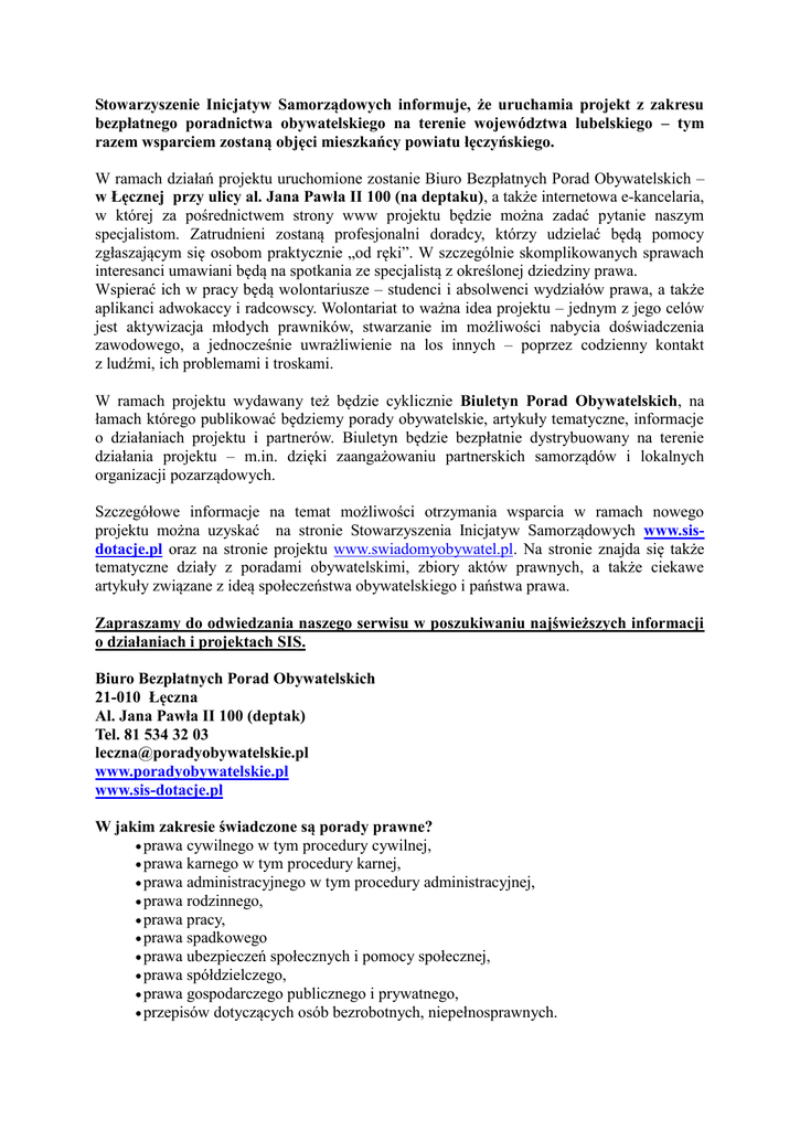 Stowarzyszenie Inicjatyw Samorządowych informuje, że uruchamia projekt z zakresu bezpłatnego poradnictwa obywatelskiego na terenie województwa lubelskiego – tym razem wsparciem zostaną objęci mieszkańcy powiatu łęczyńskiego. W ramach działań projektu uruchomione zostanie Biuro Bezpłatnych Porad Obywatelskich – w Łęcznej przy ulicy al. Jana Pawła II 100 (na deptaku), a także internetowa e-kancelaria, w której za pośrednictwem strony www projektu będzie można zadać pytanie naszym specjalistom. Zatrudnieni zostaną profesjonalni doradcy, którzy udzielać będą pomocy zgłaszającym się osobom praktycznie „od ręki”. W szczególnie skomplikowanych sprawach interesanci umawiani będą na spotkania ze specjalistą z określonej dziedziny prawa. Wspierać ich w pracy będą wolontariusze – studenci i absolwenci wydziałów prawa, a także aplikanci adwokaccy i radcowscy. Wolontariat to ważna idea projektu – jednym z jego celów jest aktywizacja młodych prawników, stwarzanie im możliwości nabycia doświadczenia zawodowego, a jednocześnie uwrażliwienie na los innych – poprzez codzienny kontakt z ludźmi, ich problemami i troskami. W ramach projektu wydawany też będzie cyklicznie Biuletyn Porad Obywatelskich, na łamach którego publikować będziemy porady obywatelskie, artykuły tematyczne, informacje o działaniach projektu i partnerów. Biuletyn będzie bezpłatnie dystrybuowany na terenie działania projektu – m.in. dzięki zaangażowaniu partnerskich samorządów i lokalnych organizacji pozarządowych. Szczegółowe informacje na temat możliwości otrzymania wsparcia w ramach nowego projektu można uzyskać na stronie Stowarzyszenia Inicjatyw Samorządowych www.sisdotacje.pl oraz na stronie projektu www.swiadomyobywatel.pl. Na stronie znajda się także tematyczne działy z poradami obywatelskimi, zbiory aktów prawnych, a także ciekawe artykuły związane z ideą społeczeństwa obywatelskiego i państwa prawa. Zapraszamy do odwiedzania naszego serwisu w poszukiwaniu najświeższych informacji o działaniach i projektach SIS. Biuro Bezpłatnych Porad Obywatelskich 21-010 Łęczna Al. Jana Pawła II 100 (deptak) Tel. 81 534 32 03 [email protected] www.poradyobywatelskie.pl www.sis-dotacje.pl W jakim zakresie świadczone są porady prawne? prawa cywilnego w tym procedury cywilnej, prawa karnego w tym procedury karnej, prawa administracyjnego w tym procedury administracyjnej, prawa rodzinnego, prawa pracy, prawa spadkowego prawa ubezpieczeń społecznych i pomocy społecznej, prawa spółdzielczego, prawa gospodarczego publicznego i prywatnego, przepisów dotyczących osób bezrobotnych, niepełnosprawnych.