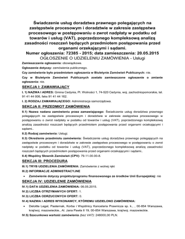 Świadczenie usług doradztwa prawnego polegających na zastępstwie procesowym i doradztwie w zakresie zastępstwa procesowego w postępowaniu o zwrot nadpłaty w podatku od towarów i usług (VAT), poprzedzonego kompleksową analizą zasadności roszczeń będących przedmiotem postępowania przed organami orzekającymi i sądami. Numer ogłoszenia: 72385 - 2015; data zamieszczenia: 20.05.2015 OGŁOSZENIE O UDZIELENIU ZAMÓWIENIA - Usługi Zamieszczanie ogłoszenia: obowiązkowe. Ogłoszenie dotyczy: zamówienia publicznego. Czy zamówienie było przedmiotem ogłoszenia w Biuletynie Zamówień Publicznych: nie. Czy w Biuletynie Zamówień Publicznych zostało zamieszczone ogłoszenie o zmianie ogłoszenia: nie. SEKCJA I: ZAMAWIAJĄCY I. 1) NAZWA I ADRES: Gmina Cedynia, Pl. Wolności 1, 74-520 Cedynia, woj. zachodniopomorskie, tel. 91 41 44 006, faks 91 41 44 162. I. 2) RODZAJ ZAMAWIAJĄCEGO: Administracja samorządowa. SEKCJA II: PRZEDMIOT ZAMÓWIENIA II.1) Nazwa nadana zamówieniu przez zamawiającego: Świadczenie usług doradztwa prawnego polegających na zastępstwie procesowym i doradztwie w zakresie zastępstwa procesowego w postępowaniu o zwrot nadpłaty w podatku od towarów i usług (VAT), poprzedzonego kompleksową analizą zasadności roszczeń będących przedmiotem postępowania przed organami orzekającymi i sądami.. II.2) Rodzaj zamówienia: Usługi. II.3) Określenie przedmiotu zamówienia: Świadczenie usług doradztwa prawnego polegających na zastępstwie procesowym i doradztwie w zakresie zastępstwa procesowego w postępowaniu o zwrot nadpłaty w podatku od towarów i usług (VAT), poprzedzonego kompleksową analizą zasadności roszczeń będących przedmiotem postępowania przed organami orzekającymi i sądami.. II.4) Wspólny Słownik Zamówień (CPV): 79.11.00.00-8. SEKCJA III: PROCEDURA III.1) TRYB UDZIELENIA ZAMÓWIENIA: Zamówienie z wolnej ręki III.2) INFORMACJE ADMINISTRACYJNE Zamówienie dotyczy projektu/programu finansowanego ze środków Unii Europejskiej: nie SEKCJA IV: UDZIELENIE ZAMÓWIENIA IV.1) DATA UDZIELENIA ZAMÓWIENIA: 06.05.2015. IV.2) LICZBA OTRZYMANYCH OFERT: 1. IV.3) LICZBA ODRZUCONYCH OFERT: 0. IV.4) NAZWA I ADRES WYKONAWCY, KTÓREMU UDZIELONO ZAMÓWIENIA: Deloitte Legal, Pasternak, Korba i Wspólnicy Kancelaria Prawnicza sp. k., , 00-854 Warszawa, kraj/woj. mazowieckie., Al. Jana Pawła II 19, 00-854 Warszawa, kraj/woj. mazowieckie. IV.5) Szacunkowa wartość zamówienia (bez VAT): 248000,00 PLN. IV.6) INFORMACJA O CENIE WYBRANEJ OFERTY ORAZ O OFERTACH Z NAJNIŻSZĄ I NAJWYŻSZĄ CENĄ Cena wybranej oferty: 305040,00 Oferta z najniższą ceną: 305040,00 / Oferta z najwyższą ceną: 305040,00 Waluta: PLN. ZAŁĄCZNIK I Uzasadnienie udzielenia zamówienia w trybie negocjacji bez ogłoszenia, zamówienia z wolnej ręki albo zapytania o cenę 1. Podstawa prawna Postępowanie prowadzone jest w trybie zamówienie z wolnej ręki na podstawie art. 5 ust. 1b ustawy z dnia 29 stycznia 2004r. - Prawo zamówień publicznych. 2. Uzasadnienia wyboru trybu Należy podać uzasadnienie faktyczne i prawne wyboru trybu oraz wyjaśnić, dlaczego udzielenie zamówienia jest zgodne z przepisami. Usługi prawnicze na mocy Rozporządzenia Prezesa Rady Ministrów z dnia 28.01.2010 r. w sprawie wykazu usług o charakterze priorytetowym i niepriorytetowym (Dz.U. z dnia 28.01.2010r.) zostały zaliczone do usług o charakterze niepriorytetowym, do których odnoszą się szczególne, sformułowane w art. 5 ustawy Prawo zamówień publicznych zasady wyboru trybu zamówienia z wolnej ręki, bez konieczności wykazania istnienia wyrażonych w art. 67 ust. 1 przesłanek. Zgodnie z art. 5.1.b. ustawy Prawo zamówień publicznych, w przypadku zamówień, których przedmiotem są usługi prawnicze, polegające na wykonywaniu zastępstwa procesowego przed sądami, trybunałami lub innymi organami orzekającymi lub doradztwie prawnym w zakresie zastępstwa procesowego, lub jeżeli wymaga tego ochrona ważnych praw lub interesów Skarbu Państwa, nie stosuje się przepisów ustawy dotyczących przesłanek wyboru trybu negocjacji bez ogłoszenia oraz przesłanek wyboru trybu zamówienia z wolnej ręki. Powyższe oznacza możliwość zastosowania tych trybów zgodnie z wyborem Zamawiającego, bez konieczności wykazywania zarówno przesłanek określonych w art. 62. ust. 1 i art. 67 ust. 1 ustawy Pzp, jak również szczegółowego uzasadniania dla zastosowania takiego trybu na mocy art. 5.1.b. ustawy Pzp. Zamawiający zdecydował się udzielić zamówienia firmie Deloitte Legal, Pasternak, Korba i Wspólnicy Kancelaria Prawnicza sp. k. ze względu na fakt, że specyfika usługi wymaga wiedzy szczególnej i oparta jest na właściwości wykonawcy. Kancelaria specjalizuje się w szczególności w szeroko pojętym prawie podatkowym, a prawnicy Kancelarii dysponują doświadczeniem zawodowym w tym zakresie, co gwarantuje wysoką jakość świadczonych usług oraz efektywność podejmowanych działań. Burmistrz Cedyni mgr Gabriela Kotowicz