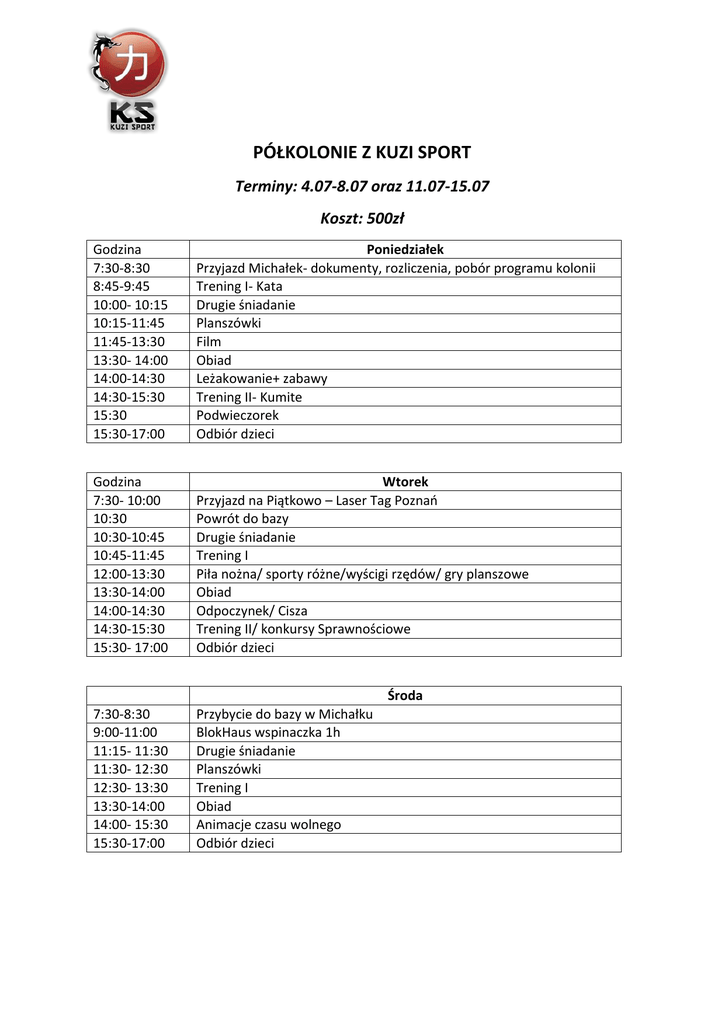 PÓŁKOLONIE Z KUZI SPORT Terminy: 4.07-8.07 oraz 11.07-15.07 Koszt: 500zł Godzina 7:30-8:30 8:45-9:45 10:00- 10:15 10:15-11:45 11:45-13:30 13:30- 14:00 14:00-14:30 14:30-15:30 15:30 15:30-17:00 Poniedziałek Przyjazd Michałek- dokumenty, rozliczenia, pobór programu kolonii Trening I- Kata Drugie śniadanie Planszówki Film Obiad Leżakowanie+ zabawy Trening II- Kumite Podwieczorek Odbiór dzieci Godzina 7:30- 10:00 10:30 10:30-10:45 10:45-11:45 12:00-13:30 13:30-14:00 14:00-14:30 14:30-15:30 15:30- 17:00 Wtorek Przyjazd na Piątkowo – Laser Tag Poznań Powrót do bazy Drugie śniadanie Trening I Piła nożna/ sporty różne/wyścigi rzędów/ gry planszowe Obiad Odpoczynek/ Cisza Trening II/ konkursy Sprawnościowe Odbiór dzieci Środa 7:30-8:30 9:00-11:00 11:15- 11:30 11:30- 12:30 12:30- 13:30 13:30-14:00 14:00- 15:30 15:30-17:00 Przybycie do bazy w Michałku BlokHaus wspinaczka 1h Drugie śniadanie Planszówki Trening I Obiad Animacje czasu wolnego Odbiór dzieci 7:30-8:30 8:30-9:15 9:15-9:30 9:30-10:30 10:30- 11:30 11:45- 13:15 13:30-14:00 14:00-14:30 14:30-15:30 15:30-17:00 Czwartek Przybycie do bazy w Michałku Aero Box/ Zumba Drugie śniadanie Zabawy pamięciowe + Improwizacje ”Whose Line i sit anyway” Trening I Pączkownia pomysłów- historia Obiad Odpoczynek+ projekcja filmów z zawodów Tor przeszkód Odbiór dzieci Piątek 7:30-8:30 8:30-9:30 9:45- 10:00 10:00-10:45 10:45- 12:45 12:45-13:30 13:30-14:00 14:00-14:30 14:30- 15:30 15:30- 17:00 Przybycie do bazy w Michałku Trening I Drugie śniadanie Wyjście na termy Basen Termy Maltańskie Powrót do Bazy Obiad Chwila dla reporterów Trening podsumowujący- rozdanie dyplomów, zdjęć, podziękowania Odbiór dzieci/ Zakończenie półkolonii *Harmonogram może ulec zmianie