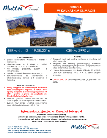 GRUZJA W KAUKASKIM KLIMACIE TERMIN : 12 – 19.08.2016 CENA OBEJMUJE: przelot samolotem: Warszawa – Tibilisi – Warszawa, ubezpieczenie KL i NNW + pakiet rozszerzony o choroby przewlekłe, na miejscu przejazdy busem z klimatyzacją, opiekę przewodnika polskojęzycznego, zakwaterowanie ze śniadaniem i obiadokolacją, pokoje 2-3 osobowe z łazienką CENA: 2990 zł WAŻNE: Paszport musi być ważny minimum 6 miesięcy od daty powrotu. Program jest ramowy (orientacyjny), kolejność realizacji poszczególnych punktów programu może ulec zmianie lub przestawieniu. cena skalkulowana przy kursie USD do 3,9 zł/USD. Jeśli kurs przekroczy 1USD = 4 zł, cena ulegnie zmianie. Cena 2990 zł obowiązuje przy grupie min 16 osób. CENA NIE OBEJMUJE: bilety wstępów do zwiedzanych obiektów oraz zwyczajowe napiwki, a także inne opłaty związane z realizacją programu: 50 USD – płatne u pilota po przylocie do Gruzji. Opłata obligatoryjna wieczór gruziński płatny dodatkowo 20 USD, napoje do kolacji płatne dodatkowo. System tour guide według zamówienia grup płatny dodatkowo – 40 zł / os Zgłoszenia przyjmuje: ks. Krzysztof Zubrzycki lub Matteo Travel kontakt poniżej Zaliczka po zapisaniu się na listę w wysokości 890 zł na niżej podane konto. Paszport musi być ważny minimum 6 miesięcy od daty planowanego powrotu. SPOTKANIE ORGANIZACYJNE W DNIU ……… Biuro Podróży Matteo Travel, tel. +48 504 189 508, pn. - sob. 9:00–17:00 Bank PKO BP SA nr konta 87 1020 4391 0000 6402 0108 7113 e-mail: [email protected], www.matteotravel.pl W KAUKASKIM KLIMACIE 1. DZIEŃ Spotkanie na lotnisku Okęcie w Warszawie o godz. 20:30. Odprawa. Wylot do Tbilisi o godz. 22.30 2. DZIEŃ Lądowanie w Tbilisi 04:05. Całodzienna wycieczka po Tbilisi. Wizyta w katolickim kościele katedralnym pw. Zaśnięcia NMP (Msza św.), w katedrze prawosławnej Sioni, z XI wieku, w kościele katedralnym Apostolskiego Kościoła Ormiańskiego, synagodze żydowskiej i w meczecie muzułmańskim. Wszystkie te budowle sakralne znajdują się wzdłuż ulicy Leselidze i świadczą o wielkiej tolerancji religijnej narodu gruzińskiego. Zwiedzanie Starego Miasta, świątyni Metechi z XII wieku, dzielnicy Abanotubani z główną twierdzą miasta Narikala. Pamiątkowe zdjęcie u pomnika Matki Gruzji. Powrót na kolację i nocleg. 3. DZIEŃ Śniadanie od godz.8.00. Zwiedzanie Mtskhety, dawnej stolicy Gruzji położonej 20 km od Tbilisi. Historycy datują początki miasta na II w. p.n.e. Mtskheta była stolicą gruzińskiego królestwa Iberii w latach 500 p.n.e. - 500 n.e. Tutaj Gruzini przyjęli chrześcijaństwo na początku IV w. Samo miasto oraz zabytki architektoniczne są wpisane na listę dziedzictwa kulturowego UNESCO. W Mtskheta znajduje się katedra Svetitshoveli (życiodajny słup), gdzie złożono Szatę Pana Jezusa. Po oddaniu hołdu tej cudownej relikwii życia i śmierci Chrystusa, spacer do starego, położnego na wzgórzu małego kościółka Sanktuarium Krzyża św. – Dżvari. Wyjazd do Gori. Spotkanie w obozie dla uchodźców z dziećmi, ofiarami wojny rosyjsko- gruzińskiej w 2008 r. Przejazd obok muzeum Stalina (wejście dla chętnych indywidualnie za dodatkową oplatą). Gori jest jego rodzinnym miastem. Zwiedzanie Uplistsikhe z VII w p.Ch - miasta wykutego w skale. Powrót do Tbilisi na obiadokolacje i nocleg. 4. DZIEŃ Po śniadaniu podróż do Kachetii, a dokładnie do Bodbe do grobu św. Nino. Zwiedzamy Sighnaghi, miasta z panoramą na dolinę Alazani oraz Kaukaz Wschodni. Wyjazd do Gurdżiani, zwiedzanie 300letniej piwnicy z winami, degustacja wina z kwewri (amfor zakopanych w ziemi). Dalej przejazd do Cinandali. Zwiedzanie domu - muzeum księży Czawczawadze (XIX w.) Wyjazd do centrum administracyjnego Kachetii – miasta Telavi. Kolacja i nocleg. 5. DZIEŃ Poranne śniadanie i wyprawa w góry Wysokiego Biuro Podróży Matteo Travel, tel. +48 504 189 508, pn. - sob. 9:00–17:00 Bank PKO BP SA nr konta 87 1020 4391 0000 6402 0108 7113 e-mail: [email protected], www.matteotravel.pl Kaukazu. Gruzińską Wojenną Drogę, historyczną drogę wiodącą w góry Kaukazu, jedyną między Morzem Czarnym i Kaspijskim. Po drodze zwiedzamy imponującą twierdzę Ananuri (XVI -XVII w.), a potem jedziemy wzdłuż rzeki Aragavi do miejscowości wypoczynkowej Gudauri. Jedziemy w stronę Kaukazu Środkowego i dojeżdżamy do Kazbegi. Miasto otoczone jest gigantycznymi górami z malowniczym widokiem na jedną z najwyższych gór - Kazbek (5047 m), jedną z sześciu 5000metrowych szczytów Kaukazu. Zgodnie z legendą Prometeusz był przykuty do góry Kazbek. Klimat tego małego kaukaskiego miasteczka górskiego jest niepowtarzalny. Stąd wielu wspinaczy górskich wyrusza na podbój Kaukazu. Powrót do hotelu, kolacja i nocleg 6. DZIEŃ Poranne śniadanie i wizyta w kościele św. Apostołów Piotra i Pawła w Tbilisi, gdzie pracują polscy księża, którzy opowiedzą o trudach pracy wśród Gruzinów. Wyjazd na Mtatsminda (Święta Góra), zwiedzanie Muzeum Narodowego w Tbilisi, spacer po głównej ulicy Shoty Rustaveli, wizyta w nowej katedrze prawosławnej Sameba (Trójcy Św.) Możliwość zrobienia zakupów na tradycyjnym gruzińskim bazarze i na „Suchym Moście”. Wieczorem dla chętnych przejazd do Tbilisi na „wieczór Gruziński”, specjalna kolacja gruzińska w jednej z restauracji. Dla pozostałych kolacja w hotelu. 7. DZIEŃ Po śniadaniu podróż do Imereti. W ciągu wieków Imeretia odgrywała ważną rolę w gruzińskiej historii. Kutaisi , czyli główne miasto regionu a zarazem drugie co wielkości w kraju, okresowo bywało stolicą całej gruzińskiej monarchii. Przez wieki w Kutaisi rezydowali władcy państw obejmujących zachodnie regiony Gruzji. Królewskie czasy zapisały się bogato w miejscowej architekturze. Poza rolą polityczną Imeretia pełniła także funkcję prężnego ośrodka kultury i życia monastycznego. Odwiedzimy najokazalszy kompleks klasztorny z bogatymi freskami w 
