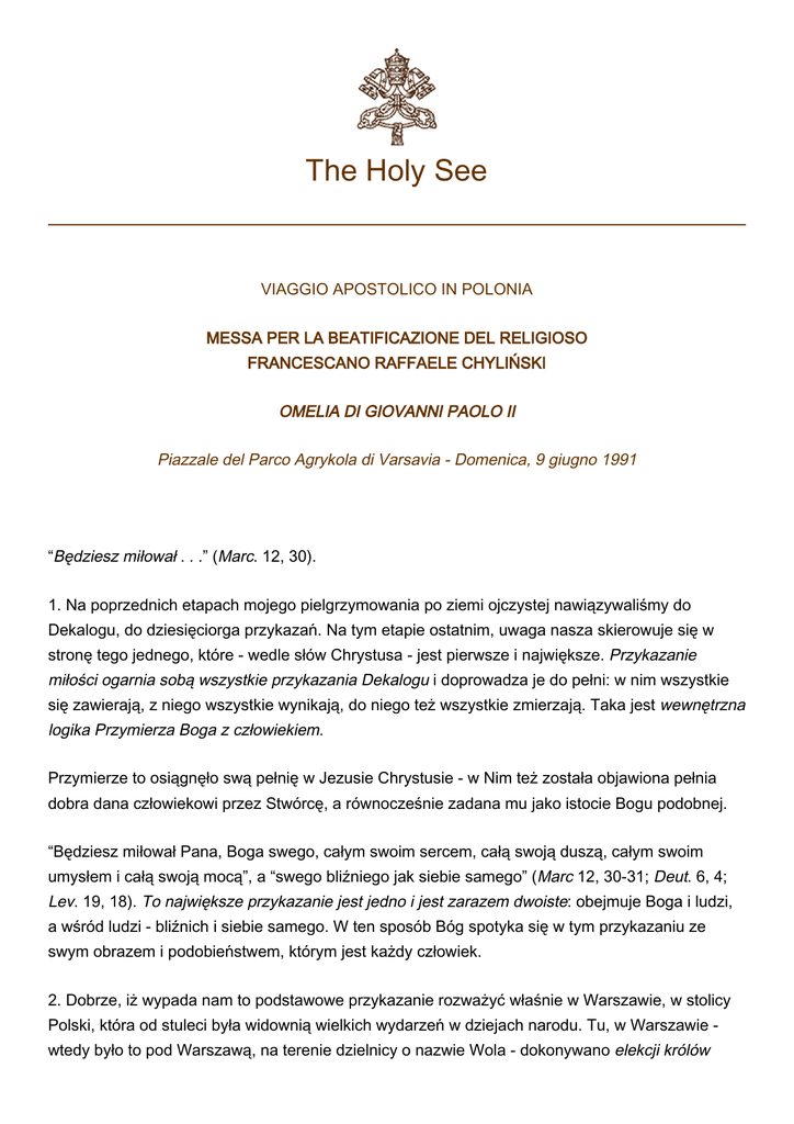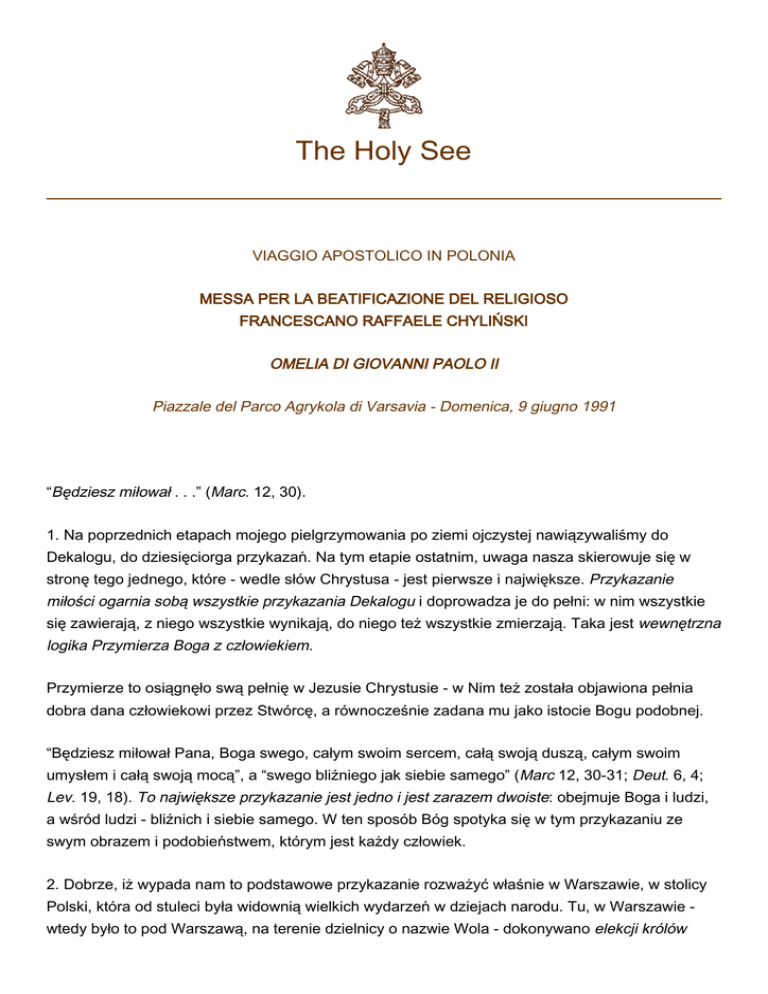 The Holy See VIAGGIO APOSTOLICO IN POLONIA MESSA PER LA BEATIFICAZIONE DEL RELIGIOSO FRANCESCANO RAFFAELE CHYLIŃSKI OMELIA DI GIOVANNI PAOLO II Piazzale del Parco Agrykola di Varsavia - Domenica, 9 giugno 1991 “Będziesz miłował . . .” (Marc. 12, 30). 1. Na poprzednich etapach mojego pielgrzymowania po ziemi ojczystej nawiązywaliśmy do Dekalogu, do dziesięciorga przykazań. Na tym etapie ostatnim, uwaga nasza skierowuje się w stronę tego jednego, które - wedle słów Chrystusa - jest pierwsze i największe. Przykazanie miłości ogarnia sobą wszystkie przykazania Dekalogu i doprowadza je do pełni: w nim wszystkie się zawierają, z niego wszystkie wynikają, do niego też wszystkie zmierzają. Taka jest wewnętrzna logika Przymierza Boga z człowiekiem. Przymierze to osiągnęło swą pełnię w Jezusie Chrystusie - w Nim też została objawiona pełnia dobra dana człowiekowi przez Stwórcę, a równocześnie zadana mu jako istocie Bogu podobnej. “Będziesz miłował Pana, Boga swego, całym swoim sercem, całą swoją duszą, całym swoim umysłem i całą swoją mocą”, a “swego bliźniego jak siebie samego” (Marc 12, 30-31; Deut. 6, 4; Lev. 19, 18). To największe przykazanie jest jedno i jest zarazem dwoiste: obejmuje Boga i ludzi, a wśród ludzi - bliźnich i siebie samego. W ten sposób Bóg spotyka się w tym przykazaniu ze swym obrazem i podobieństwem, którym jest każdy człowiek. 2. Dobrze, iż wypada nam to podstawowe przykazanie rozważyć właśnie w Warszawie, w stolicy Polski, która od stuleci była widownią wielkich wydarzeń w dziejach narodu. Tu, w Warszawie wtedy było to pod Warszawą, na terenie dzielnicy o nazwie Wola - dokonywano elekcji królów 2 polskich. Poprzez elekcje ujawniała się suwerenna wola społeczeństwa; było to społeczeństwo szlacheckie, bo tylko ono miało czynne prawo wyborcze w ówczesnej Rzeczypospolitej. Tak więc poprzez wieki Wola - miejscowość - była sprawdzianem woli narodu, ludzkiej wolnej woli w akcie wyboru i decyzji o zasadniczym znaczeniu dla dobra wspólnego Rzeczypospolitej trzech narodów. Przykazanie miłości ma w Ewangelii także swój wymiar społeczny. Mówi Chrystus: “To jest moje przykazanie, abyście się wzajemnie miłowali”, abyście się społecznie miłowali (Io. 15, 12). W każdym swoim wymiarze przykazanie miłości jest odniesione do ludzkiej woli, która jest wolna. Człowiek, kierując się światłem rozumu, czyli sądem sumienia wybiera, a w ten sposób rozstrzyga i stanowi o sobie. Nadaje kształt swym uczynkom. Przykazanie miłości jest skierowane do wolnej woli, od niej bowiem zależy, czy człowiek nada swym uczynkom, swemu postępowaniu, kształt miłości lub też inny kształt, miłości przeciwny. Może to być kształt egoizmu, kształt obojętności na potrzeby drugiego, obojętności na dobro wspólne. Może to być wreszcie kształt nienawiści czy zdrady - wbrew temu, czego uczy Chrystus: “Miłujcie waszych nieprzyjaciół” (Matth. 5, 44). W ciągu dziejów Warszawa była widownią różnych wyborów i różnych decyzji. W wielu zapewne odzwierciedlała się miłość społeczna, miłość Ojczyzny pośród jej wielorakich potrzeb. Ale było także inaczej. Trzeba nam na tym miejscu rozpamiętywać wielkość woli, ale także i jej małość, samolubstwo i interesowność, sprzedajność wreszcie i podeptanie wspólnej sprawy. 3. Pod koniec I Rzeczypospolitej, a także po jej upadku, właśnie Warszawa stała się widownią odradzania się dojrzałej miłości Ojczyzny. To tutaj, w stolicy, kształtowała się myśl obywatelska i podejmowano odważne działania mające na celu ratowanie zagrożonej Ojczyzny. Szczytowym osiągnięciem tamtego patriotycznego zrywu było, jak wiadomo, uchwalenie Konstytucji 3 maja. Zapłaciła później za to Warszawa pamiętną rzezią swojej prawobrzeżnej dzielnicy, Pragi. Miłość, która jest gotowa nawet oddać życie, nie ginie. Toteż nic dziwnego, że właśnie w Warszawie - kilkaset metrów stąd, pod Belwederem - rozpoczął się następny akt tego heroicznego dramatu Polaków, do którego ich popychała miłość Ojczyzny, mianowicie powstanie listopadowe. Tutaj się ono zaczęło, objęło wprawdzie cały kraj, ale tutaj też się skończyło. Symbolem pozostanie postać generała Sowińskiego - tego weterana walk za Polskę, inwalidy pozbawionego jednej nogi, który na niedalekiej Woli usiłował zagrodzić wrogowi wejście do stolicy i tam oddał życie. “Nie ma większej miłości od tej, gdy ktoś życie swoje oddaje” (Io. 15, 13)- powiedział Chrystus. Chrystus sam jest pierwszym wśród tych, którzy dawali życie: za bliźnich, za sprawę, za ojczyznę. Nie brak w naszych dziejach Jego naśladowców. Jeśli pamiętamy o tej wielkiej daninie krwi, jaką Warszawa tyle razy składała na ołtarzu miłości Ojczyzny, jawi się nam nasza stolica - zwłaszcza w chwilach podniosłych - jako męczeńskie sanktuarium narodu. Męczeńskie sanktuarium narodu - tak nazwał Warszawę Prymas Tysiąclecia. Zauważmy w tym określeniu cały ciężar gatunkowy ewangelicznego świadectwa. Męczennik - 3 martyr - świadek. Świadek miłości, która jest większa od nienawiści. Bo przecież w naszym już stuleciu, podczas powstania warszawskiego, a potem po jego zakończeniu, stolica stała się widownią śmiertelnego zwarcia pomiędzy heroizmem a bestialstwem - tak zatytułował swą powojenną książkę wielki filozof, profesor Uniwersytetu Jagiellońskiego, ks. Konstanty Michalski, więzień Sachsenhausen. To, co wtedy działo się w Warszawie, było jakby ostatnim spiętrzeniem nienawiści, która przez kilka pokoleń starała się zniszczyć, dosłownie zniszczyć nasz naród. I oto ta Warszawa Warszawa elekcji królów polskich, stała się w naszym już stuleciu miejscem innych jeszcze wyborów i rozstrzygnięć: między życiem a śmiercią, między miłością a nienawiścią. Przedziwny ciąg wydarzeń. Zap
