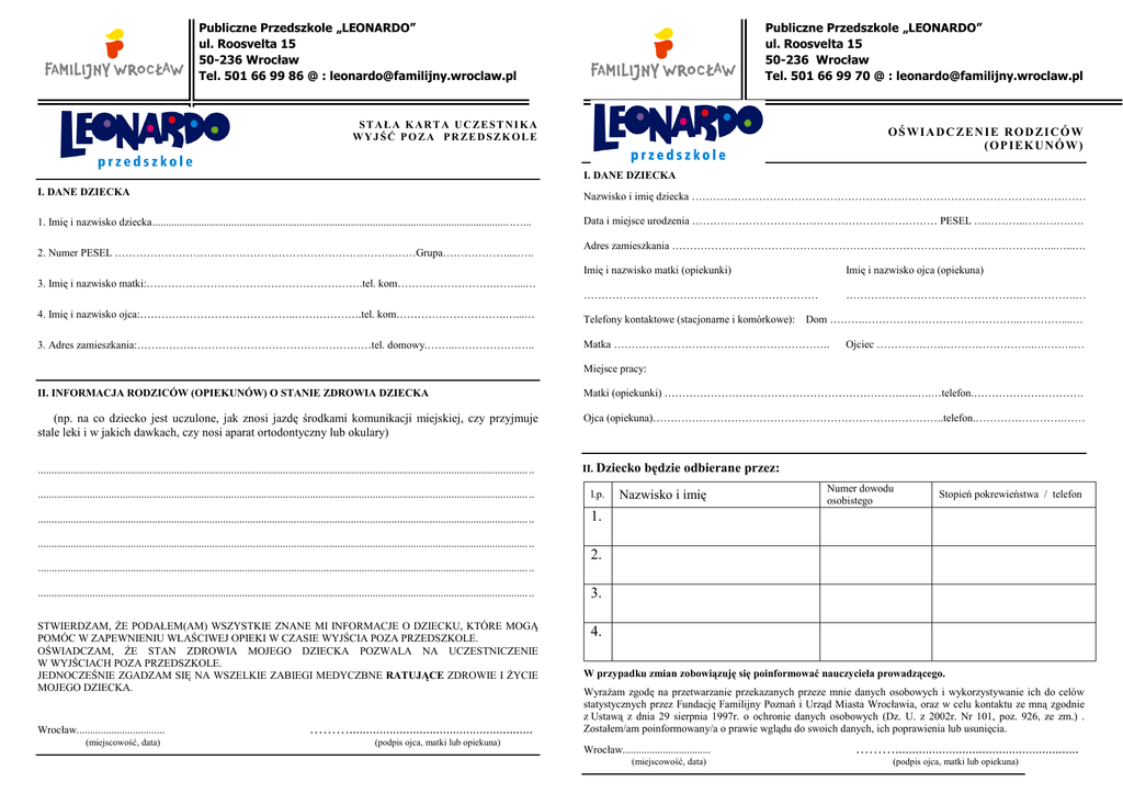 Publiczne Przedszkole „LEONARDO” ul. Roosvelta 15 50-236 Wrocław Tel. 501 66 99 86 @ : [email protected] Publiczne Przedszkole „LEONARDO” ul. Roosvelta 15 50-236 Wrocław Tel. 501 66 99 70 @ : [email protected] STAŁA KARTA UCZESTNIKA WYJ ŚĆ POZA PRZEDSZKOLE OŚWIADCZENIE RODZICÓW (OPIEKUNÓW) I. DANE DZIECKA I. DANE DZIECKA Nazwisko i imię dziecka ………………………………………………………………………………………………… 1. Imię i nazwisko dziecka ................................................................................................................................... .…... Data i miejsce urodzenia …………………………………………………………… PESEL ….………..………….…. 2. Numer PESEL …………………………………………………………………….……Grupa………………....….. Adres zamieszkania …………………………………………………………………………….………………...…..…. Imię i nazwisko matki (opiekunki) Imię i nazwisko ojca (opiekuna) ………………………………………………………… ………………………………………….…………….… 3. Imię i nazwisko matki:…………………………………………………….tel. kom……………………….……...… 4. Imię i nazwisko ojca:……………………………………..……………….tel. kom………………………….…...… Telefony kontaktowe (stacjonarne i komórkowe): 3. Adres zamieszkania:…………………………………………………………tel. domowy.……..………………….. Matka ……………………………………………………. Dom ……….……………………………………..…………....… Ojciec ……………….……………………..….……..… Miejsce pracy: II. INFORMACJA RODZICÓW (OPIEKUNÓW) O STANIE ZDROWIA DZIECKA Matki (opiekunki) ………………………………………………………….…..….…telefon.…………………………. (np. na co dziecko jest uczulone, jak znosi jazdę środkami komunikacji miejskiej, czy przyjmuje stale leki i w jakich dawkach, czy nosi aparat ortodontyczny lub okulary) Ojca (opiekuna)……………………………………………………………………….telefon.…………………….…… .................................................................................................................................................................................... .. II. Dziecko .................................................................................................................................................................................... .. l.p. .................................................................................................................................................................................... .. 1. .................................................................................................................................................................................... .. będzie odbierane przez: Nazwisko i imię Numer dowodu osobistego Stopień pokrewieństwa / telefon 2. .................................................................................................................................................................................... .. .................................................................................................................................................................................... .. 3. STWIERDZAM, ŻE PODAŁEM(AM) WSZYSTKIE ZNANE MI INFORMACJE O DZIECKU, KTÓRE MOGĄ POMÓC W ZAPEWNIENIU WŁAŚCIWEJ OPIEKI W CZASIE WYJŚCIA POZA PRZEDSZKOLE. OŚWIADCZAM, ŻE STAN ZDROWIA MOJEGO DZIECKA POZWALA NA UCZESTNICZENIE W WYJŚCIACH POZA PRZEDSZKOLE. JEDNOCZEŚNIE ZGADZAM SIĘ NA WSZELKIE ZABIEGI MEDYCZBNE RATUJĄCE ZDROWIE I ŻYCIE MOJEGO DZIECKA. 4. Wrocław................................. (miejscowość, data) ………....................................................... (podpis ojca, matki lub opiekuna) W przypadku zmian zobowiązuję się poinformować nauczyciela prowadzącego. Wyrażam zgodę na przetwarzanie przekazanych przeze mnie danych osobowych i wykorzystywanie ich do celów statystycznych przez Fundację Familijny Poznań i Urząd Miasta Wrocławia, oraz w celu kontaktu ze mną zgodnie z Ustawą z dnia 29 sierpnia 1997r. o ochronie danych osobowych (Dz. U. z 2002r. Nr 101, poz. 926, ze zm.) . Zostałem/am poinformowany/a o prawie wglądu do swoich danych, ich poprawienia lub usunięcia. Wrocław................................. (miejscowość, data) ………....................................................... (podpis ojca, matki lub opiekuna)