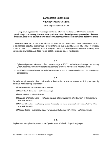 ZARZĄDZENIE NR 389/2016 PREZYDENTA MIASTA KIELCE z dnia 26 października 2016 r. w sprawie ogłoszenia otwartego konkursu ofert na realizację w 2017 roku zadania publicznego pod nazwą „Prowadzenie punktów nieodpłatnej pomocy prawnej na obszarze Miasta Kielce" oraz powołania Komisji Konkursowej w celu zaopiniowania złożonych ofert Na podstawie art. 4 ust. 1 pkt 1b, art. 13 i art. 15 ust. 2a ustawy z dnia 24 kwietnia 2003 r. o działalności pożytku publicznego i o wolontariacie (Dz.U. z 2016 r. poz. 239 i 395), w związku z art. 11 ust. 1 i 2 ustawy z dnia 5 sierpnia 2015 r. o nieodpłatnej pomocy prawnej oraz edukacji prawnej (Dz.U. z 2015 r. poz. 1255), zarządza się, co następuje: § 1. 1. Ogłasza się otwarty konkurs ofert na realizację w 2017 r. zadania publicznego pod nazwą „Prowadzenie punktów nieodpłatnej pomocy prawnej na obszarze Miasta Kielce”. 2. Treść ogłoszenia o konkursie, o którym mowa w ust. 1 stanowi załącznik do niniejszego zarządzenia. § 2. W celu zaopiniowania ofert złożonych w konkursie, o którym mowa w § 1 powołuje się Komisję Konkursową w składzie: 1) Iwona Franki - przewodnicząca komisji; 2) Maria Lech-Bielecka - członek komisji; 3) Agata Wijas - członek komisji; 4) Brygida Wolniakowska – wskazana przez Stowarzyszenie „Pro Civitas” w Piekoszowie – członek komisji; 5) Michał Heinrich – wskazany przez Fundację na rzecz promocji zdrowia „Puls” z Kielc – członek komisji; 6) Marcin Syska – wskazany przez Fundację „Edu Sentencja” z Kielc – członek komisji. § 3. Wykonanie zarządzenia powierza się Dyrektorowi Wydziału Organizacyjnego. Id: 34D0F8D7-1E60-42E9-8727-463687B0B306. Przyjety Strona 1 § 4. Zarządzenie wchodzi w życie z dniem podpisania. Id: 34D0F8D7-1E60-42E9-8727-463687B0B306. Przyjety Strona 2 Załącznik do Zarządzenia Nr 389/2016 Prezydenta Miasta Kielce z dnia 26 października 2016 r. OGŁOSZENIE na podstawie art. 4 ust. 1 pkt 1b i art. 13 ustawy z dnia 24 kwietnia 2003 r. o działalności pożytku publicznego i o wolontariacie (Dz.U. z 2016 r. poz. 239 i 395) w związku z art. 11 ust. 1 i 2 ustawy z dnia 5 sierpnia 2015 r. o nieodpłatnej pomocy prawnej oraz edukacji prawnej (Dz.U. z 2015 r. poz. 1255) PREZYDENT MIASTA KIELCE OGŁASZA OTWARTY KONKURS OFERT na realizację w 2017 roku zadania publicznego pod nazwą „Prowadzenie punktów nieodpłatnej pomocy prawnej na obszarze miasta Kielce” DZ.I RODZAJ ZADANIA ORAZ WYSOKOŚĆ DOTACJI: 1. Nazwa zadania: „Prowadzenie punktów nieodpłatnej pomocy prawnej na obszarze Miasta Kielce”, zwanego dalej „zadaniem” , zgodnie z wymaganiami ustawy z dnia 5 sierpnia 2015 r. o nieodpłatnej pomocy prawnej oraz edukacji prawnej (Dz.U. z 2015 r. poz. 1255). 2. Na realizację zadania planuje się przeznaczyć kwotę 242.903,52 zł (słownie złotych: dwieście czterdzieści dwa tysiące dziewięćset trzy złote 52/100) na prowadzenie 4 punktów nieodpłatnej pomocy prawnej, pod warunkiem otrzymania dotacji z budżetu państwa. 3. Wysokość dotacji związana z realizacją zadania przez jeden punkt wynosi 60.725,88 zł (słownie złotych: sześćdziesiąt tysięcy siedemset dwadzieścia pięć 88/100), płatna w równych, miesięcznych ratach, z przeznaczeniem na wynagrodzenia z tytułu umów, o których mowa w art. 6 i art. 11 ust. 3 ustawy z dnia 5 sierpnia 2015 r. o nieodpłatnej pomocy prawnej oraz edukacji prawnej (Dz.U. z 2015 r. poz. 1255) oraz na inne koszty merytoryczne (np. zakup materiałów biurowych) i koszty obsługi zadania związane wyłącznie z realizacją zadania (koszty związane z obsługą i administracją realizowanego zadania, związane z wykonywaniem działań o charakterze administracyjnym, nadzorczym i kontrolnym, w tym obsługę finansową i prawną projektu np. koszty wynagrodzenia koordynatora zadania, obsługę księgową zadania). 4. Zadanie zostanie powierzone organizacji(-om) pozarządowej(-ym), prowadzącej(-ym) działalność pożytku publicznego, o której(-ych) mowa w art. 3 ust. 2 ustawy z dnia 24 kwietnia 2003 r. o działalności pożytku publicznego i o wolontariacie (Dz.U. z 2016 r. poz. 239 i 395), zwaną(-ymi) dalej „organizacją(-ami) pozarządową(-ymi)”, która(-e) w wyniku oceny przez Komisję Konkursową złożonych ofert, według kryteriów określonych w dziale V ust. 1 ogłoszenia otrzyma(-ją) największą liczbę punktów i jej/ ich rekomendacja zostanie przyjęta przez Prezydenta Miasta Kielce. 5. Zadania z zakresu udzielania nieodpłatnej pomocy prawnej w 2015 roku nie były realizowane, w 2016 r. na realizację zadania przeznacza się dotację w wysokości 239.784,00 zł. Id: 34D0F8D7-1E60-42E9-8727-463687B0B306. Przyjety Strona 3 DZ. II TERMIN I MIEJSCE REALIZACJI ZADANIA: 1. Termin realizacji zadania: od dnia 1 stycznia 2017 roku do dnia 31 grudnia 2017 roku. 2. Miejsce realizacji zadania: zadanie będzie realizowane na obszarze miasta Kielce w następujących punktach: a) ul. Młoda 28 – dwa punkty (Punkt Nr 5 i Punkt Nr 6) usytuowane w jednym lokalu; b) ul. Miodowa 7 – dwa punkty (Punkt Nr 7 i Punkt Nr 8) usytuowane w jednym lokalu. 3. W lokalach wymienionych w ust. 2 zapewnione zostaną: 1) podstawowe meble biurowe (zamykana szafa, biurko, krzesła); 2) dostęp do sieci energetycznej, telefonicznej (w tym aparat telefoniczny wraz z przyporządkowanym numerem) i teleinformatycznej wraz z dostępem do internetu oraz komputer, drukarka, skaner; 3) właściwe warunki oczekiwania osób chcących uzyskać nieodpłatną pomoc prawną oraz dostęp do lokalu osobom niepełnosprawnym. DZ. III PODMIOTY UPRAWNIONE DO ZŁOŻENIA OFERTY: 1. Podmiotem uprawnionym do złożenia oferty jest organizacja pozarządowa, w zakresie, o którym mowa w art. 4 ust. 1 pkt 1b ustawy z dnia 24 kwietnia 2003 roku o działalności pożytku publicznego i o wolontariacie, spełniająca łącznie następujące warunki: 1) posiada co najmniej dwuletnie doświadczenie w wykonywaniu zadań wiążących 