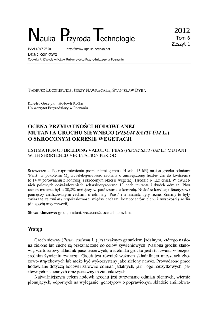 Nauka Przyroda Technologie ISSN 1897-7820 http://www.npt.up-poznan.net 2012 Tom 6 Zeszyt 1 Dział: Rolnictwo Copyright ©Wydawnictwo Uniwersytetu Przyrodniczego w Poznaniu TADEUSZ ŁUCZKIEWICZ, JERZY NAWRACAŁA, STANISŁAW DYBA Katedra Genetyki i Hodowli Roślin Uniwersytet Przyrodniczy w Poznaniu OCENA PRZYDATNOŚCI HODOWLANEJ MUTANTA GROCHU SIEWNEGO (PISUM SATIVUM L.) O SKRÓCONYM OKRESIE WEGETACJI ESTIMATION OF BREEDING VALUE OF PEAS (PISUM SATIVUM L.) MUTANT WITH SHORTENED VEGETATION PERIOD Streszczenie. Po napromienieniu promieniami gamma (dawka 15 kR) nasion grochu odmiany ‘Piast’ w pokoleniu M2 wyselekcjonowano mutanta o zmniejszonej liczbie dni do kwitnienia (o 14 w porównaniu z kontrolą) i skróconym okresie wegetacji (średnio o 12,5 dnia). W dwuletnich polowych doświadczeniach scharakteryzowano 13 cech mutanta i dwóch odmian. Plon nasion mutanta był o 38,8% mniejszy w porównaniu z kontrolą. Niektóre korelacje fenotypowe pomiędzy analizowanymi cechami u odmiany ‘Piast’ i u mutanta były różne. Zmiany te były związane ze zmianą współzależności między cechami komponentów plonu i wysokością roślin (długością międzywęźli). Słowa kluczowe: groch, mutant, wczesność, ocena hodowlana Wstęp Groch siewny (Pisum sativum L.) jest ważnym gatunkiem jadalnym, którego nasiona zielone lub suche są przeznaczone do celów żywieniowych. Nasiona grochu stanowią wartościowy składnik pasz treściwych, a zielonka grochu jest stosowana w bezpośrednim żywieniu zwierząt. Groch jest również ważnym składnikiem mieszanek zbożowo-strączkowych lub może być wykorzystany jako zielony nawóz. Prowadzone prace hodowlane dotyczą hodowli zarówno odmian jadalnych, jak i ogólnoużytkowych, pastewnych nasiennych oraz pastewnych zielonkowych. Najważniejszym celem hodowli grochu jest otrzymanie odmian plennych, wiernie plonujących, odpornych na wyleganie, genotypów o poprawionym składzie aminokwa- 2 Łuczkiewicz T., Nawracała J., Dyba S., 2012. Ocena przydatności hodowlanej mutanta grochu siewnego (Pisum sativum L.) o skróconym okresie wegetacji. Nauka Przyr. Technol. 6, 1, #5. sowym nasion. Ważnym kierunkiem hodowli jest otrzymanie odmian o zróżnicowanej długości okresu wegetacji, szczególnie dotyczy to odmian przeznaczonych na zbiór na zielone nasiona (groszek mrożony, konserwowy). Wczesność odmian grochu przy jednocześnie niezbyt zmniejszonym plonie nasion jest istotną sprawą w hodowli tego gatunku. W pracach genetycznych i hodowlanych ważną rolę odgrywa indukowanie mutacji genowych. Ma ono duże znaczenie zarówno praktyczne, jak i teoretyczne. W aspekcie teoretycznym nowe mutacje umożliwiają jeszcze lepsze poznanie genetyki tego modelowego (w badaniach genetycznych) gatunku. W aspekcie praktycznym mutacje indukowane mogą poszerzyć istniejącą zmienność genetyczną, a niekiedy otrzymane mutanty mogą być bezpośrednio wykorzystane w praktyce hodowlanej, stanowiąc nową odmianę. Najczęściej jednak mutanty służą jako wartościowy materiał wyjściowy w hodowli rekombinacyjnej. Wykorzystanie fizycznych i chemicznych czynników mutagennych umożliwiło otrzymanie genotypów grochu lepiej plonujących, różniących się pod względem cech kwiatu i długości okresu wegetacji, odporności na mączniaka i większej zawartości białka. W końcu lat sześćdziesiątych ubiegłego wieku uzyskano w Katedrze Genetyki i Hodowli Roślin Akademii Rolniczej w Poznaniu mutanta grochu typu afila. Powstał on po poddaniu nasion grochu działaniu promieniowania Roentgena dawką 15 kR. Mutant afila (genotyp af/af – chromosom 1) charakteryzuje się zamianą listków grochu w wąsy, co powoduje zwiększoną odporność roślin na wyleganie. Stojące, połączone wąsami czepnymi rośliny tworzą zbity łan. Strąki w takim łanie utrzymują się ponad powierzchnią gleby, co zabezpiecza je przed gniciem i osypywaniem. Prace hodowlane nad tym mutantem doprowadziły do otrzymania wielu odmian krajowych i zagranicznych gatunku. Pierwsze zagraniczne odmiany wykorzystujące tę mutację powstały w roku 1978 w Anglii (odmiana ‘Filby’). W Polsce wyhodowano szereg odmian tego typu m.in. odmianę ‘Piast’, z której otrzymano w KGiHR mutanta o krótszym okresie wegetacji. Mutanty wcześniejsze grochu znajdowano często, np. GOTTSCHALK (1970) otrzymał linię mutacyjną zakwitającą i dojrzewającą o 10 dni wcześniej od genotypu wyjściowego. Celem przeprowadzonych badań była analiza biometryczna i ocena przydatności hodowlanej mutanta grochu siewnego otrzymanego w pokoleniu M2 po napromieniowaniu nasion odmiany ‘Piast’ promieniami γ. Materiał i metody Wyprowadzenie linii mutacyjnej Materiałem wyjściowym do indukowania mutacji była polska odmiana grochu siewnego ‘Piast’. Jest to odmiana typu afila wpisana do rejestru odmian w 1995 roku, przydatna do uprawy na zbiór suchych nasion z przeznaczeniem do konsumpcji i na paszę. Zakwita dość wcześnie, ma średnią długość okresu wegetacji (LISTA... 1995). W 1999 roku nasiona spoczynkowe tej odmiany zostały napromieniowane promieniami γ ze źródła 60Co dawką 15 kR. Pokolenie M1 wysiano na powierzchni około 0,2 ha. Z każdej rośliny pokolenia M1 zebrano po jednym-dwa nasiona i wysiano łącznie 3 Łuczkiewicz T., Nawracała J., Dyba S., 2012. Ocena przydatności hodowlanej mutanta grochu siewnego (Pisum sativum L.) o skróconym okresie wegetacji. Nauka Przyr. Technol. 6, 1, #5. w 2000 roku jako pokolenie M2 na podobnej jak w poprzednim roku powierzchni. Spośród roślin pokolenia M2 wybrano te, które odbiegały fenotypowo od odmiany wyjściowej ‘Piast’. Jedna z wyselekcjonowanych roślin charakteryzowała się wyraźnie skróconym okresem od wschodów do początku kwitnienia. Rozmnożenie otrzymanego mutanta przeprowadzono w warunkach polowych i szklarniowych w okresie obejmującym lata 2001-2003. Wyprowadzoną w ten sposób linię mutacyjną oznaczono symbo