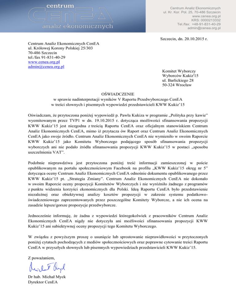 Centrum Analiz Ekonomicznych ul. Kr. Kor. Pol. 25, 70-486 Szczecin www.cenea.org.pl KRS: 0000213332 Tel./fax: +48-91-831-40-29 [email protected] Szczecin, dn. 20.10.2015 r. Centrum Analiz Ekonomicznych CenEA ul. Królowej Korony Polskiej 25/303 70-486 Szczecin tel./fax 91-831-40-29 www.cenea.org.pl [email protected] Komitet Wyborczy Wyborców Kukiz'15 ul. Barlickiego 28 50-324 Wrocław OŚWIADCZENIE w sprawie nadinterpretacji wyników V Raportu Przedwyborczego CenEA w treści słownych i pisemnych wypowiedzi przedstawicieli KWW Kukiz’15 Oświadczam, że przytoczona poniżej wypowiedź p. Pawła Kukiza w programie „Polityka przy kawie” wyemitowanym przez TVP1 w dn. 19.10.2015 r. dotycząca możliwości sfinansowania propozycji KWW Kukiz’15 jest niezgodna z treścią Raportu CenEA oraz oficjalnym stanowiskiem Centrum Analiz Ekonomicznych CenEA, mimo iż przytacza ów Raport oraz Centrum Analiz Ekonomicznych CenEA jako swoje źródło. Centrum Analiz Ekonomicznych CenEA nie wymieniło w swoim Raporcie KWW Kukiz’15 jako Komitetu Wyborczego podającego sposób sfinansowania propozycji wyborczych ani nie podało źródła sfinansowania propozycji KWW Kukiz’15 w postaci „sposobu uszczelnienia VAT”. Podobnie nieprawdziwa jest przytoczona poniżej treść informacji zamieszczonej w poście opublikowanym na portalu społecznościowym Facebook na profilu „KWW Kukiz’15 okręg nr 5” dotycząca oceny Centrum Analiz Ekonomicznych CenEA odnośnie dokumentu opublikowanego przez KWW Kukiz’15 pt. „Strategia Zmiany”. Centrum Analiz Ekonomicznych CenEA nie dokonało w swoim Raporcie oceny propozycji Komitetów Wyborczych i nie wyróżniło żadnego z programów z punktu widzenia korzyści ekonomicznych dla Polski. Ideą Raportu CenEA było przedstawienie niezależnej oraz obiektywnej analizy kosztów propozycji w zakresie systemu podatkowoświadczeniowego zaprezentowanych przez poszczególne Komitety Wyborcze, a nie ich ocena na zasadzie lepsze/gorsze propozycje przedwyborcze. Jednocześnie informuję, że żadna z wypowiedzi któregokolwiek z pracowników Centrum Analiz Ekonomicznych CenEA nigdy nie dotyczyła ani możliwości sfinansowania propozycji KWW Kukiz’15 ani subiektywnej oceny propozycji tego Komitetu Wyborczego. W związku z powyższym proszę o usunięcie lub sprostowanie nieprawidłowości w przytoczonych poniżej cytatach pochodzących z mediów społecznościowych oraz poprawne cytowanie treści Raportu CenEA w przyszłych słownych lub pisemnych wypowiedziach przedstawicieli KWW Kukiz’15. Z poważaniem, Dr hab. Michał Myck Dyrektor CenEA Kopia listu wysłana drogą elektroniczną na adres: [email protected] Treść wypowiedzi p. Pawła Kukiza w programie TVP1 „Polityka przy kawie” w dn. 19.10.2015 r., stanowiąca jednocześnie cytat z informacji opublikowanej na portalu społecznościowym Facebook w dn. 18.10.2015 r. o godz. 10:16 na profilu „Paweł Kukiz” (https://www.facebook.com/kukizpawel): „(…) Według Centrum Analiz Ekonomicznych CenEA tylko ruch Kukiz’15 w swojej „Strategii Zmiany” ma ujęte skąd pozyskać pieniądze i wymienia w niej między innymi sposób uszczelnienia VAT na sposób portugalski. CenEA nie analizowała programu Platformy Obywatelskiej, bo nadal nie ma szczegółów najważniejszej propozycji Platformy, czyli podatku powszechnego. W przypadku oferty wyborczej Pawła Kukiza zyskują wszyscy: w gospodarstwach biednych i nieco bardziej zamożnych o od 3,8 do 6,5 proc., a dochody bogatych i bardzo bogatych wzrosłyby o ok. 11 proc. (…)” Cytat informacji opublikowanej na portalu społecznościowym Facebook w dn. 18.10.2015 r. o godz. 23:51 na profilu „KWW Kukiz'15 okręg nr 5” (https://www.facebook.com/tnkreferendum?fref=nf): „(…) Centrum Analiz Ekonomicznych oceniło Strategię Zmiany jako najlepszą propozycję ekonomiczną dla Polski spośród wszystkich ugrupowań startujących w wyborach parlamentarnych. (…)”