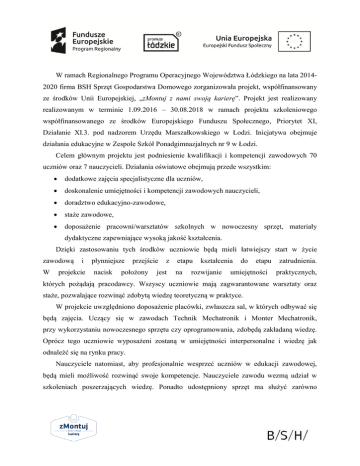 W ramach Regionalnego Programu Operacyjnego Województwa Łódzkiego na lata 20142020 firma BSH Sprzęt Gospodarstwa Domowego zorganizowała projekt, współfinansowany ze środków Unii Europejskiej, „zMontuj z nami swoją karierę”. Projekt jest realizowany realizowanym w terminie 1.09.2016 – 30.08.2018 w ramach projektu szkoleniowego współfinansowanego ze środków Europejskiego Funduszu Społecznego, Priorytet XI, Działanie XI.3. pod nadzorem Urzędu Marszałkowskiego w Łodzi. Inicjatywa obejmuje działania edukacyjne w Zespole Szkół Ponadgimnazjalnych nr 9 w Łodzi. Celem głównym projektu jest podniesienie kwalifikacji i kompetencji zawodowych 70 uczniów oraz 7 nauczycieli. Działania oświatowe obejmują przede wszystkim: dodatkowe zajęcia specjalistyczne dla uczniów, doskonalenie umiejętności i kompetencji zawodowych nauczycieli, doradztwo edukacyjno-zawodowe, staże zawodowe, doposażenie pracowni/warsztatów szkolnych w nowoczesny sprzęt, materiały dydaktyczne zapewniające wysoką jakość kształcenia. Dzięki zastosowaniu tych środków uczniowie będą mieli łatwiejszy start w życie zawodową W i projekcie płynniejsze nacisk przejście położony z jest etapu na kształcenia rozwijanie do etapu umiejętności zatrudnienia. praktycznych, których pożądają pracodawcy. Wszyscy uczniowie mają zagwarantowane warsztaty oraz staże, pozwalające rozwinąć zdobytą wiedzę teoretyczną w praktyce. W projekcie uwzględniono doposażenie placówki, zwłaszcza sal, w których odbywać się będą zajęcia. Uczący się w zawodach Technik Mechatronik i Monter Mechatronik, przy wykorzystaniu nowoczesnego sprzętu czy oprogramowania, zdobędą zakładaną wiedzę. Oprócz tego uczniowie wyposażeni zostaną w umiejętności interpersonalne i wiedzę jak odnaleźć się na rynku pracy. Nauczyciele natomiast, aby profesjonalnie wesprzeć uczniów w edukacji zawodowej, będą mieli możliwość rozwinąć swoje kompetencje. Nauczyciele zawodu wezmą udział w szkoleniach poszerzających wiedzę. Ponadto udostępniony sprzęt ma służyć zarówno uczniom jak i ich nauczycielom. Wszystkie te działania mają za zadanie sprostać oczekiwaniom stawianym kandydatom na rynku pracy. Zakładane rezultaty obejmują przede wszystkim wzrost kompetencji zawodowych z uwzględnieniem także umiejętności cyfrowych. Kwalifikacje będą potwierdzone wystawionymi świadectwami. Wzmocni się sytuacja uczestników projektu na rynku pracy. Dzięki posiadaniu cenionych i wymaganych umiejętności, potwierdzonych stażami odbytymi u pracodawcy, zwiększą swoje szanse na znalezienie zatrudnienia po zakończeniu szkoły.