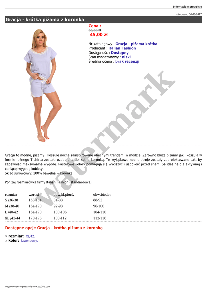 Informacje o produkcie Utworzono 08-03-2017 Gracja - krótka piżama z koronką Cena : 55,00 zł 45,00 zł er m ar k Nr katalogowy : Gracja - piżama krótka Producent : Italian Fashion Dostępność : Dostępny Stan magazynowy : niski Średnia ocena : brak recenzji at Gracja to modne, piżamy i koszule nocne zainspirowane obecnymi trendami w modzie. Zarówno bluza piżamy jak i koszula w formie luźnego T-shirtu została ozdobiona delikatną koronką. Te wyjątkowe nocne stroje zostały zaprojektowane tak, by zapewniać maksymalną wygodę. Pastelowe kolory pomagają się wyciszyć i uspokoić przed snem. Są idealne dla aktywnej i ceniącej wygodę kobiety. Skład surowcowy: 100% bawełna + koronka. Poniżej rozmiarówka firmy Italian Fashion (standardowa): wzrost obw.kl.pierś. obw.bioder S /36-38 158-164 84-88 88-92 M /38-40 164-170 92-98 96-100 L /40-42 164-170 100-106 104-110 XL /42-44 170-176 108-112 112-116 w rozmiar Dostępne opcje Gracja - krótka piżama z koronką » rozmiar: XL/42. » kolor: lawendowy. Wygenerowano w programie www.oscGold.com
