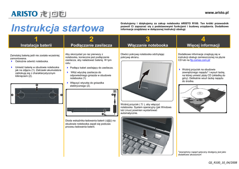 www.aristo.pl Instrukcja startowa tartowa Gratulujemy i dziękujemy za zakup notebooka ARISTO R100. Ten krótki przewodnik pozwoli Ci zapoznać się z podstawowymi funkcjami i budową budow urządzenia. Dodatkowe informacje znajdziesz w dołączonej instrukcji obsługi. obsługi 1 2 3 4 Instalacja baterii Podłączanie ączanie zasilacza Włączanie notebooka Więcej informacji Zainstaluj baterię jeśli nie została wcześniej zamontowana. OstroŜnie odwróć notebooka. Aby skorzystaćć po raz pierwszy z notebooka,, konieczne jest podł podłączenie zasilacza, aby naładowa naładować baterię. W tym celu: Umieść baterię w obudowie notebooka Podłącz cz kabel zasilaj zasilający do zasilacza. jak na zdjęciu (1). Zatrzaski akumulatora zablokują się z charakterystycznym kliknięciem (2). Otwórz pokrywę notebooka odchylając pokrywę ekranu. Dodatkowe informacje znajdują się w instrukcji obsługi zamieszczonej na płycie CD lub na ftp.comes.com.pl/ Wciśnij przycisk na obudowie WłóŜ wtyczkęę zasilacza do zewnętrznego napędu* i wysuń tackę, na której umieść płytę CD (okładką do góry). Delikatnie wsuń tackę napędu do środka. odpowiedniego gniazda w obudowie notebooka (1) Włączyć wtyczkę do gniazdka elektrycznego (2). Wciśnij przycisk ( ), aby włączyć notebooka. System operacyjny (jak Windows lub Linux) powinien wystartować automatycznie. Dioda wskaźnika nika ładowania baterii ( ) na obudowie notebooka zapali si się podczas procesu ładowania baterii. *zewnętrzny napęd optyczny dostępny jest jako dodatkowe akcesorium QS_R100_10_04/2008 www.aristo.pl 11 Port VGA 12 Włącznik RF 1 2 3 4 5 6 7 8 9 13 Port USB 14 Czytnik kart pamięci Ekran LCD Klawisze szybkiego dostępu Wskaźniki statusu Włącznik Czytnik linii papilarnych Klawiatura Touchpad Czytnik kart Smart Card Wskaźniki statusu 10 Mikrofon 15 Wyjście Audio-out 16 Wejście mikrofonu 17 Porty USB 18 Slot PCMCIA 19 Złącze sieciowe (RJ-45) 20 Złącze modemowe (RJ-11) QS_R100_10_04/2008