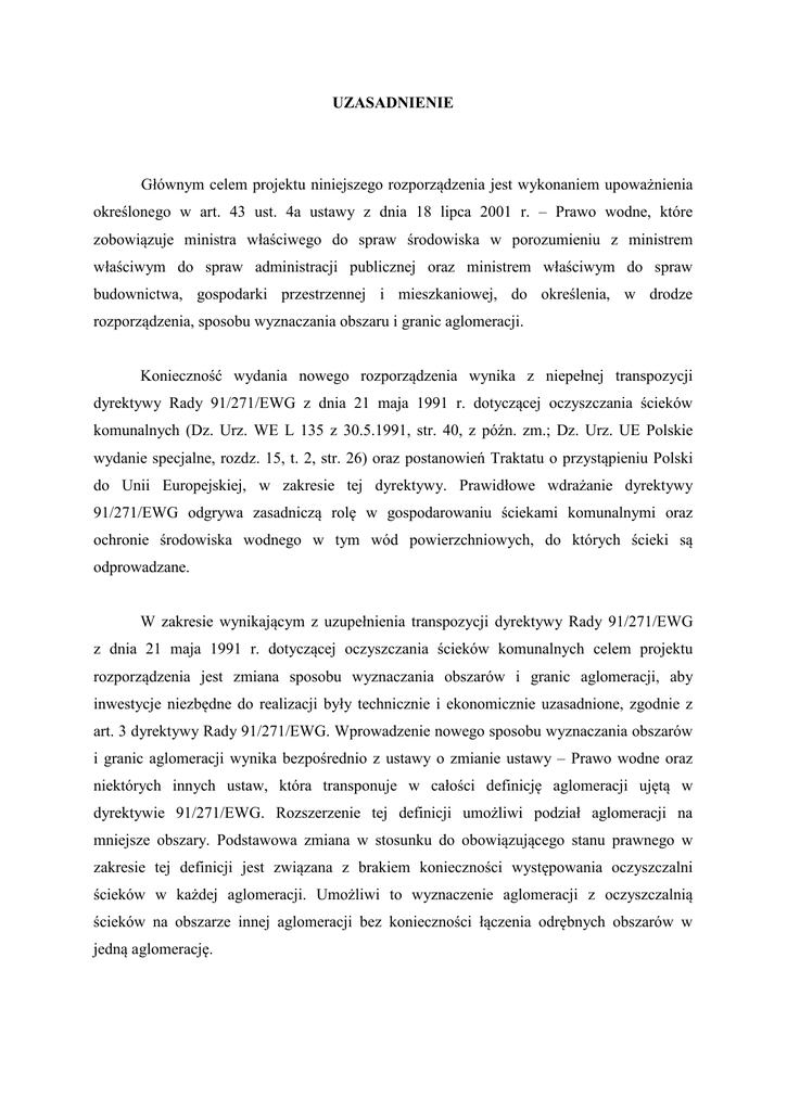 UZASADNIENIE Głównym celem projektu niniejszego rozporządzenia jest wykonaniem upoważnienia określonego w art. 43 ust. 4a ustawy z dnia 18 lipca 2001 r. – Prawo wodne, które zobowiązuje ministra właściwego do spraw środowiska w porozumieniu z ministrem właściwym do spraw administracji publicznej oraz ministrem właściwym do spraw budownictwa, gospodarki przestrzennej i mieszkaniowej, do określenia, w drodze rozporządzenia, sposobu wyznaczania obszaru i granic aglomeracji. Konieczność wydania nowego rozporządzenia wynika z niepełnej transpozycji dyrektywy Rady 91/271/EWG z dnia 21 maja 1991 r. dotyczącej oczyszczania ścieków komunalnych (Dz. Urz. WE L 135 z 30.5.1991, str. 40, z późn. zm.; Dz. Urz. UE Polskie wydanie specjalne, rozdz. 15, t. 2, str. 26) oraz postanowień Traktatu o przystąpieniu Polski do Unii Europejskiej, w zakresie tej dyrektywy. Prawidłowe wdrażanie dyrektywy 91/271/EWG odgrywa zasadniczą rolę w gospodarowaniu ściekami komunalnymi oraz ochronie środowiska wodnego w tym wód powierzchniowych, do których ścieki są odprowadzane. W zakresie wynikającym z uzupełnienia transpozycji dyrektywy Rady 91/271/EWG z dnia 21 maja 1991 r. dotyczącej oczyszczania ścieków komunalnych celem projektu rozporządzenia jest zmiana sposobu wyznaczania obszarów i granic aglomeracji, aby inwestycje niezbędne do realizacji były technicznie i ekonomicznie uzasadnione, zgodnie z art. 3 dyrektywy Rady 91/271/EWG. Wprowadzenie nowego sposobu wyznaczania obszarów i granic aglomeracji wynika bezpośrednio z ustawy o zmianie ustawy – Prawo wodne oraz niektórych innych ustaw, która transponuje w całości definicję aglomeracji ujętą w dyrektywie 91/271/EWG. Rozszerzenie tej definicji umożliwi podział aglomeracji na mniejsze obszary. Podstawowa zmiana w stosunku do obowiązującego stanu prawnego w zakresie tej definicji jest związana z brakiem konieczności występowania oczyszczalni ścieków w każdej aglomeracji. Umożliwi to wyznaczenie aglomeracji z oczyszczalnią ścieków na obszarze innej aglomeracji bez konieczności łączenia odrębnych obszarów w jedną aglomerację. Projekt rozporządzenia ma bezpośredni wpływ na kształt i formę Krajowego programu oczyszczania ścieków komunalnych, określonego w art. 43 ustawy – Prawo wodne. Spowoduje to bezpośrednio zmniejszenie liczby przedsięwzięć polegających na budowie oczyszczalni ścieków, a co za tym idzie zmianę kosztów realizacji całego Programu. W przypadku pozostawienia regulacji prawnych tego rozporządzenia w obecnym kształcie skutkować to będzie brakiem prawidłowej transpozycji, a co za tym idzie błędnym wdrażaniem dyrektywy 91/271/EWG w Polsce, w wyniku czego Komisja Europejska może wystosować do Trybunału Sprawiedliwości wniosek przeciwko Polsce o naruszenie prawa unijnego. W konsekwencji może to doprowadzić do wyciagnięcia wobec Polski sankcji karnych w postaci ryczałtu bądź kary pieniężnej. Może to mieć tym samym negatywny wpływ na zatwierdzenie projektów współfinansowanych ze środków unijnych, a nawet skutkować wstrzymaniem wypłaty środków unijnych w sektorze gospodarki wodnościekowej (w przypadku wszczęcia przez Komisję Europejską procedury o naruszenie prawa unijnego). Projekt rozporządzenia uwzględnia wymagania dyrektywy Rady 91/271/EWG z dnia 21 maja 1991 r. dotyczącej oczyszczania ścieków komunalnych w zakresie sposobu wyznaczania obszaru i granic aglomeracji. Projekt rozporządzenia, zgodnie z rozporządzeniem Rady Ministrów z dnia 23 grudnia 2002 r. w sprawie sposobu funkcjonowania krajowego systemu notyfikacji norm i aktów prawnych (Dz. U. Nr 239, poz. 2039 oraz z 2004 r. Nr 65, poz. 597), nie wymaga notyfikacji. Projekt rozporządzenia, zgodnie z art. 5 ustawy z dnia 7 lipca 2005 r. o działalności lobbingowej w procesie stanowienia prawa (Dz. U. Nr 169, poz. 1414, z późn. zm.) został zamieszczony w Biuletynie Informacji Publicznej Rządowego Centrum Legislacji. Projekt rozporządzenia jest zgodny z prawem Unii Europejskiej.