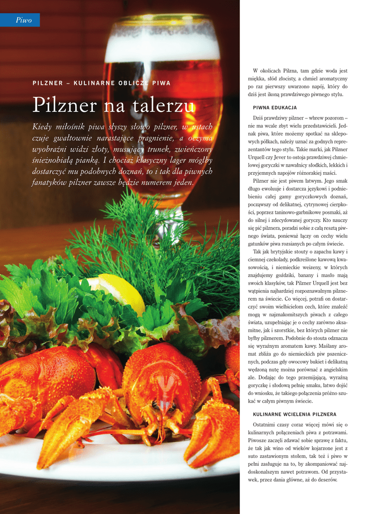 Piwo PILZNER – KULINARNE OBLICZE PIWA Pilzner na talerzu Kiedy mi∏oÊnik piwa s∏yszy s∏owo pilzner, w ustach czuje gwa∏townie narastajàce pragnienie, a oczyma wyobraêni widzi z∏oty, musujàcy trunek, zwieƒczony Ênie˝nobia∏à piankà. I chocia˝ klasyczny lager móg∏by dostarczyç mu podobnych doznaƒ, to i tak dla piwnych fanatyków pilzner zawsze b´dzie numerem jeden. W okolicach Pilzna, tam gdzie woda jest mi´kka, s∏ód z∏ocisty, a chmiel aromatyczny po raz pierwszy uwarzono napój, który do dziÊ jest ikonà prawdziwego piwnego stylu. PIWNA EDUKACJA DziÊ prawdziwy pilzner – wbrew pozorom – nie ma wcale zbyt wielu przedstawicieli. Jednak piwa, które mo˝emy spotkaç na sklepowych pó∏kach, nale˝y uznaç za godnych reprezentantów tego stylu. Takie marki, jak Pilzner Urquell czy Jever to ostoja prawdziwej chmielowej goryczki w nawa∏nicy s∏odkich, lekkich i przyjemnych napojów ró˝norakiej maÊci. Pilzner nie jest piwem ∏atwym. Jego smak d∏ugo ewoluuje i dostarcza j´zykowi i podniebieniu ca∏ej gamy goryczkowych doznaƒ, poczàwszy od delikatnej, cytrynowej cierpkoÊci, poprzez taninowo-garbnikowe posmaki, a˝ do silnej i zdecydowanej goryczy. Kto nauczy si´ piç pilznera, poradzi sobie z ca∏à resztà piwnego Êwiata, poniewa˝ ∏àczy on cechy wielu gatunków piwa rozsianych po ca∏ym Êwiecie. Tak jak brytyjskie stouty o zapachu kawy i ciemnej czekolady, podkreÊlone kawowà kwasowoÊcià, i niemieckie weizeny, w których znajdujemy goêdziki, banany i mas∏o majà swoich klasyków, tak Pilzner Urquell jest bez wàtpienia najbardziej rozpoznawalnym pilznerem na Êwiecie. Co wi´cej, potrafi on dostarczyç swoim wielbicielom cech, które znaleêç mogà w najznakomitszych piwach z ca∏ego Êwiata, uzupe∏niajàc je o cechy zarówno aksamitne, jak i szorstkie, bez których pilzner nie by∏by pilznerem. Podobnie do stouta odznacza si´ wyraênym aromatem kawy. MaÊlany aromat zbli˝a go do niemieckich piw pszenicznych, podczas gdy owocowy bukiet i delikatnà w´dzonà nut´ mo˝na porównaç z angielskim ale. Dodajàc do tego przemijajàcà, wyraênà goryczk´ i s∏odowà pe∏ni´ smaku, ∏atwo dojÊç do wniosku, ˝e takiego po∏àczenia pró˝no szukaç w ca∏ym piwnym Êwiecie. KULINARNE WCIELENIA PILZNERA Ostatnimi czasy coraz wi´cej mówi si´ o kulinarnych po∏àczeniach piwa z potrawami. Piwosze zacz´li zdawaç sobie spraw´ z faktu, ˝e tak jak wino od wieków kojarzone jest z suto zastawionym sto∏em, tak te˝ i piwo w pe∏ni zas∏uguje na to, by akompaniowaç najdoskonalszym nawet potrawom. Od przystawek, przez dania g∏ówne, a˝ do deserów. 20 Piwo Pilzner nie jest piwem ∏atwym – jego smak d∏ugo ewoluuje i dostarcza nam ca∏ej gamy goryczkowych doznaƒ. Dzi´ki z∏o˝onoÊci cech pilzner – jak ˝adne inne piwo na Êwiecie – nadaje si´ do akompaniowania potrawom, zarówno tym prostym, jak i bardziej wysublimowanym. Podzia∏ cech pilznera na strony: s∏odkà – mleko, miód, mas∏o, biszkopty, karmel oraz gorzkà – chmiel, zio∏a, przypalenie, goryczka, sprawia, ˝e gatunek ten idealnie komponuje si´ zarówno z potrawami, gdzie skrobia, czyli cukry grajà pierwsze skrzypce, jak i z tymi, gdzie goryczka (wàtróbki, oliwki, zio∏a, pieprz) jest dominujàcym smakiem. Wyraêna goryczka chmielowa doskonale oczyszcza j´zyk, dzi´ki czemu piwo jest doskona∏ym przerywnikiem pomi´dzy k´sami potrawy. Zawarty w nim chmiel to nic innego jak rodzaj zio∏a, które pobudza apetyt, co wskazuje nam pilznera jako Êwietny aperitif. Aby jednak poprawnie dobraç pilznera do potrawy, musimy zdaç sobie spraw´ z faktu, w jaki sposób nasze zmys∏y odbierajà i przetwarzajà bodêce sensoryczne. Co powoduje, ˝e coÊ nam smakuje bàdê nie? Tak wi´c pierwszy zawsze jest wzrok. Nie od dziÊ wiadomo, ˝e jemy tak˝e oczyma. Widok atrakcyjnej potrawy pobudza apetyt tak samo, jak z∏ote, perlàce piwo zwieƒczone czapà Ênie˝nobia∏ej piany generuje silne pragnienie. Warto o tym pami´taç, serwujàc pilznera do jedzenia. Idealnie smakujàca zupa z muli z jajkami przepiórki, która – niestety – odznacza si´ ma∏o atrakcyjnym, szarym kolo- rem zniweczyç mo˝e prób´ podkreÊlenia przepi´knej barwy, klarownoÊci i iskry piwa. Potrawy i alkohole muszà byç spójne wizualnie, tote˝ nie od rzeczy b´dzie podanie pilznera w towarzystwie kremowej zupy z grzybów leÊnych, zwieƒczonej dekoracjà ze Êmietany i odrobinà Êwie˝ej naci pietruszki. Kolejnym zmys∏em pe∏niàcym istotnà rol´ w rejestrowaniu otaczajàcej nas rzeczywistoÊci jest s∏uch. Zastanówmy si´ przez chwil´, co powoduje, ˝e chrupanie wszelakich kruchych przekàsek tak mocno zwiàzane jest z piwem? Odpowiedê jest banalnie prosta, w∏aÊnie dêwi´k tego˝ chrupania…Ten, kto mia∏ okazj´ w absolutnej ciszy ws∏uchaç si´ kiedyÊ w rytua∏ nalewania piwa, z pewnoÊcià mimowolnie zarejestrowa∏ kilka dêwi´ków. Otwieranie piwa, nalewanie i szum wytworzonej piany, której drobne p´cherzyki, p´kajàc tworzà jednolity, perlisty dêwi´k. Dêwi´k, który tak naprawd´ jest istotnà funkcjà orzeêwiajàcà piwa. ˚eby jeszcze mocniej podkreÊliç „dêwi´kowe” walory piwa, warto podaç do niego chrupiàce, kukurydziane tortille, mocno okraszone paprykowym sosem. B´dzie to symfonia zarówno dla ucha, jak i podniebienia. Idàc dalej, docieramy do smaku i w´chu, i tu iloÊç po∏àczeƒ jest w zasadzie nieskoƒczona. Podwaliny sztuki kulinarnej opierajà si´ na dwóch fundamentalnych zjawiskach – synergii i kontraÊcie. Znajàc je, mo˝emy dobieraç setki odwa˝nych po∏àczeƒ, cieszàc j´zyk ka˝dym z nich. Pilzner to przede wszystkim goryczka. Goryczka, do której trzeba dorosnàç. Tak jak uczymy si´ piç whisky, jeÊç oliwki i owoce morza, tak te˝ musimy zaprzyjaêniç si´ z wytrawnym smakiem, który otwiera nam drzwi do wielu wytrawnych po∏àczeƒ. Serwujàc pilznera do potraw zawieraj