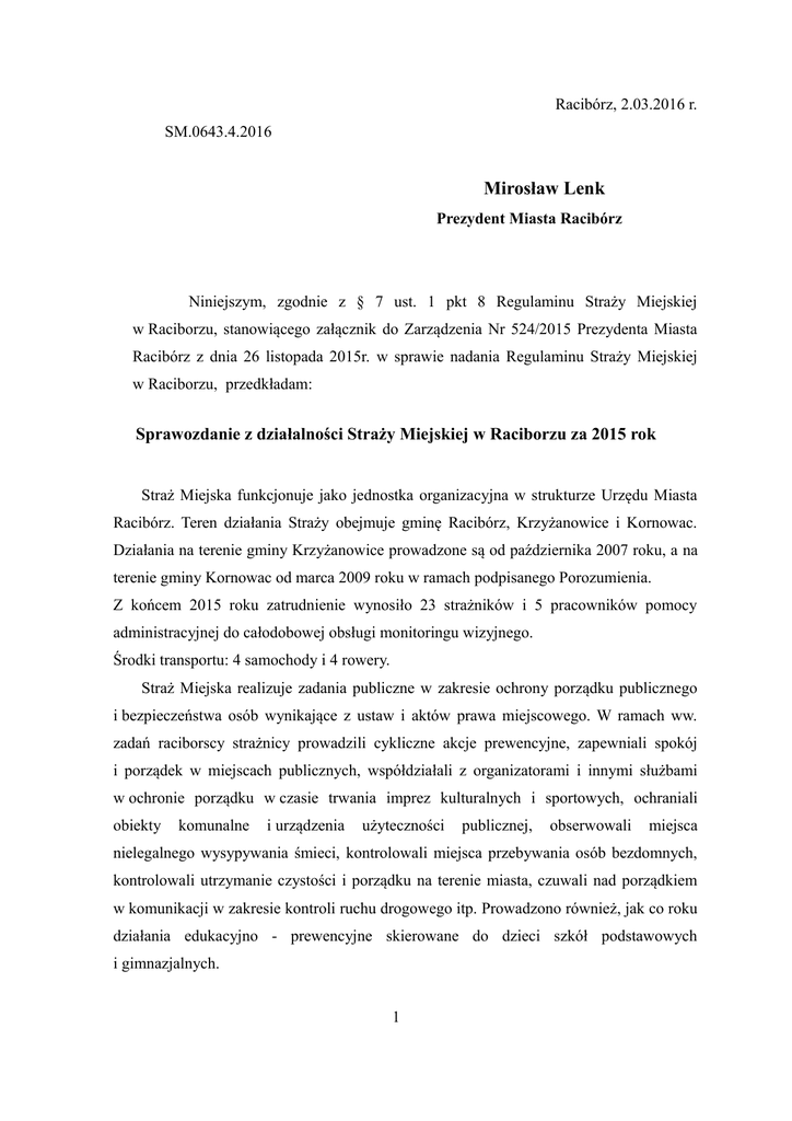 Racibórz, 2.03.2016 r. SM.0643.4.2016 Mirosław Lenk Prezydent Miasta Racibórz Niniejszym, zgodnie z § 7 ust. 1 pkt 8 Regulaminu Straży Miejskiej w Raciborzu, stanowiącego załącznik do Zarządzenia Nr 524/2015 Prezydenta Miasta Racibórz z dnia 26 listopada 2015r. w sprawie nadania Regulaminu Straży Miejskiej w Raciborzu, przedkładam: Sprawozdanie z działalności Straży Miejskiej w Raciborzu za 2015 rok Straż Miejska funkcjonuje jako jednostka organizacyjna w strukturze Urzędu Miasta Racibórz. Teren działania Straży obejmuje gminę Racibórz, Krzyżanowice i Kornowac. Działania na terenie gminy Krzyżanowice prowadzone są od października 2007 roku, a na terenie gminy Kornowac od marca 2009 roku w ramach podpisanego Porozumienia. Z końcem 2015 roku zatrudnienie wynosiło 23 strażników i 5 pracowników pomocy administracyjnej do całodobowej obsługi monitoringu wizyjnego. Środki transportu: 4 samochody i 4 rowery. Straż Miejska realizuje zadania publiczne w zakresie ochrony porządku publicznego i bezpieczeństwa osób wynikające z ustaw i aktów prawa miejscowego. W ramach ww. zadań raciborscy strażnicy prowadzili cykliczne akcje prewencyjne, zapewniali spokój i porządek w miejscach publicznych, współdziałali z organizatorami i innymi służbami w ochronie porządku w czasie trwania imprez kulturalnych i sportowych, ochraniali obiekty komunalne i urządzenia użyteczności publicznej, obserwowali miejsca nielegalnego wysypywania śmieci, kontrolowali miejsca przebywania osób bezdomnych, kontrolowali utrzymanie czystości i porządku na terenie miasta, czuwali nad porządkiem w komunikacji w zakresie kontroli ruchu drogowego itp. Prowadzono również, jak co roku działania edukacyjno - prewencyjne skierowane do dzieci szkół podstawowych i gimnazjalnych. 1 I. Niektóre z ważniejszych działań obrazujących pracę raciborskiej straży miejskiej: 1. Dyżurni straży przyjęli 2.065 interwencji zgłoszonych przez mieszkańców i administracje dotyczące m.in. zakłócania spokoju i porządku publicznego, zabezpieczenia miejsc niebezpiecznych, spożywania alkoholu i palenia tytoniu w miejscach objętych zakazem, zanieczyszczania miejsc publicznych, przebywania osób bezdomnych w klatkach schodowych i śmietnikach, braku nadzoru nad psami, spalania odpadów w piecach domowych, spalania pozostałości roślinnych, uszkadzania roślinności, nie wywiązywania się właścicieli nieruchomości z obowiązku utrzymania czystości i porządku, nieprawidłowego parkowania pojazdów w tym utrudniania poruszania się pieszym. Ponadto na prośbę dyżurnego Policji podjęto 38 interwencji w zakresie bezpieczeństwa i porządkowi w komunikacji. 2. Przyjęto 121 zgłoszeń dotyczących spalania odpadów w piecach domowych (65 zgłoszeń) oraz na terenach otwartych (54 zgłoszenia). Zgłaszający w rozmowie z dyżurnym twierdzili, że czują zapach palonego plastiku bądź spalanych śmieci oraz widzą duże ilości wydobywającego się dymu z kominów lub terenu nieruchomości. W wyniku przeprowadzonych kontroli ujawniono 47 nieprawidłowości, za które w 10 przypadkach nałożono mandaty karne, a w 37 przypadkach zastosowano pouczenia. 3. Z uwagi na występujący w sezonie grzewczym problem tzw. niskiej emisji, spowodowany m.in. spalaniem odpadów, zintensyfikowano od miesiąca listopada działania kontrolne w poszczególnych dzielnicach miasta. Działania odbywały się w godzinach porannych i popołudniowych i miały na celu ujawnianie sprawców spalania odpadów w piecach grzewczych. W wyniku prowadzonych działań w jednym przypadku zastosowano pouczenie. Natomiast za spalanie odpadów na terenach otwartych nałożono 1 mandat karny i zastosowano 6 pouczeń. Ponadto w czasie prowadzonych działań rozmawiano z właścicielami nieruchomości m.in. o prawidłowej eksploatacji pieców i metodach spalania opału, które mają wpływ na obniżenie zanieczyszczenia powietrza. Wręczano również ilustrowane informatory „Racibórz – nie dla niskiej emisji”. 4. Z uwagi na powtarzające się zgłoszenia mieszkańców budynków wielorodzinnych przy ul. Ogrodowej – Pracy dot. uciążliwości związanych z zadymianiem okolicy spowodowanym wydobywającym się dymem z kominów pobliskiej nieruchomości, podjęto stosowne działania. Strażnicy miejscy ustalili, że na ww. nieruchomości 2 funkcjonuje 8 podmiotów gospodarczych, które korzystają z własnych instalacji grzewczych. Ponadto strażnicy podejmowali również interwencje mieszkańców dotyczące zanieczyszczania pobliskich terenów sadzami wydobywającymi się z jednego z kominów na terenie ww. nieruchomości. O powyższych uciążliwościach i dokonanych ustaleniach zgodnie z kompetencjami powiadomiono pisemnie Wojewódzki Inspektorat Ochrony Środowiska w Katowicach. W odpowiedzi Inspektorat poinformował, że planuje w roku bieżącym przeprowadzenie kontroli 4 podmiotów, a pozostałe 4 podmioty powinny zostać skontrolowane przez kompetentnych pracowników Urzędu Miasta i Starostwa. Początkiem miesiąca lutego br. odbyła się kontrola ww. podmiotów gospodarczych przez pracowników Starostwa Powiatowego i nieprawidłowości Urzędu w Miasta zakresie oraz strażników użytkowania miejskich. pomieszczenia Stwierdzono kotłowni oraz nieprawidłowej gospodarki odpadami, polegającej na nie prowadzeniu selektywnej zbiórki odpadów i nie pozbywaniu się odpadów zgodnie ze złożoną deklaracją. Za ujawnione wykroczenie nałożono mandat karny. 5. Podjęto 32 interwencje dot. zdarzeń z udziałem zwierząt dziko żyjących (sarny, zające, kaczki, konie, szerszenie, ptaki, wąż, bóbr, dzik, szop, jeż,), które pojawiały się w pobliżu siedzib ludzkich, bądź były to zwierzęta ranne lub martwe leżące w obrębie drogi. Strażnicy zabezpieczali teren, na którym znajdowały się zwierzęta, celem wyeliminowania zagrożenia dla ludzi lub w ruchu drogowym, a w przypadku zwierząt rannych powiadam
