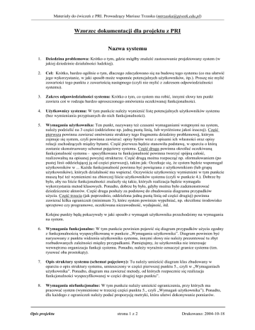 Materiały do ćwiczeń z PRI. Prowadzący Mariusz Trzaska ([email protected]) Wzorzec dokumentacji dla projektu z PRI Nazwa systemu 1. Dziedzina problemowa: Krótko o tym, gdzie mógłby znaleźć zastosowanie projektowany system (w jakiej dziedzinie działalności ludzkiej). 2. Cel: Krótko, bardzo ogólnie o tym, dlaczego zdecydowano się na budowę tego systemu (co ma ułatwić jego wykorzystanie, w jaki sposób może wspomóc potencjalnych użytkowników, itp.). Proszę nie mylić zawartości tego punktu z zawartością następnego (czyli nie mylić z zakresem odpowiedzialności systemu). 3. Zakres odpowiedzialności systemu: Krótko o tym, co system ma robić, innymi słowy ten punkt zawiera coś w rodzaju bardzo uproszczonego omówienia oczekiwanej funkcjonalności. 4. Użytkownicy systemu: W tym punkcie należy wymienić listę potencjalnych użytkowników systemu (bez wymieniania przypisanych do nich funkcjonalności). 5. Wymagania użytkownika: Ten punkt, nazywany też czasami wymaganiami wstępnymi na system, należy podzielić na 3 części (oddzielone np. jedną pustą linią, lub wyróżnione jakoś inaczej). Część pierwsza powinna zawierać omówienie struktury tego fragmentu dziedziny problemowej, którym zajmuje się system, czyli powinna zawierać: opisy bytów wraz z opisami ich własności oraz opisy relacji zachodzących między bytami. Część pierwsza będzie stanowiła podstawę, w oparciu o którą zostanie skonstruowany schemat pojęciowy systemu. Część druga powinna określać oczekiwaną funkcjonalność systemu - specyfikowana tu funkcjonalność powinna tworzyć spójną całość, realizowalną na opisanej powyżej strukturze. Część drugą można rozpocząć np. sformułowaniem (po pustej linii oddzielającej ją od części pierwszej), takim jak: Oczekuje się, że system będzie wspomagał użytkowników w ... Każda funkcjonalność powinna być powiązana z użytkownikiem (lub grupą użytkowników), których działalność ma wspierać. Oczywiście użytkownicy wymienieni w tym punkcie muszą być też wymienieni na zbiorczej liście użytkowników systemu (czyli w punkcie 4.). Dobrze by było, aby na liście funkcjonalności znalazły się takie, których realizacja będzie wymagała wykorzystania metod klasowych. Ponadto, dobrze by było, gdyby można było zademonstrować dziedziczenie aktorów. Część druga posłuży za podstawę do zbudowania diagramu przypadków użycia. Część trzecia (jak poprzednio, oddzielona jedną pustą linią od części drugiej) powinna zawierać kilka ograniczeń (minimum 3), które system powinien wypełniać, np. określone środowisko sprzętowe czy programowe, oczekiwana niezawodność, wydajność, itd. Kolejne punkty będą pokazywały w jaki sposób z wymagań użytkownika przechodzimy na wymagania na system. 6. Wymagania funkcjonalne: W tym punkcie powinien pojawić się diagram przypadków użycia zgodny z funkcjonalnością wyspecyfikowaną w punkcie „Wymagania użytkownika”. Diagram powinien być narysowany z punktu widzenia użytkownika systemu, innymi słowy nie należy prezentować tu zbyt rozbudowanych zależności między przypadkami. Pamiętajmy, że użytkownika nie interesuje wewnętrzna organizacja funkcji systemu. Ponadto, należy wyraźnie oznaczyć granice systemu (tzn. rysować oba prostokąty). 7. Opis struktury systemu (schemat pojęciowy): Tu należy umieścić diagram klas zbudowany w oparciu o opis struktury systemu, umieszczony w części pierwszej punktu 5., czyli w „Wymaganiach użytkownika”. Ponadto, diagram ma zawierać metody, od których rozpocznie się realizacja funkcjonalności wyspecyfikowanej w części drugiej tego punktu”. 8. Wymagania niefunkcjonalne: W tym punkcie należy umieścić ograniczenia, przy których ma pracować system (wymienione w trzeciej części punktu 5., czyli „Wymagań użytkownika”). Ponadto, dla każdego z ograniczeń należy podać propozycję metryki, która ułatwi dokonywanie pomiarów. Opis projektu strona 1 z 2 Drukowano: 2004-10-18 Materiały do ćwiczeń z PRI. Prowadzący Mariusz Trzaska ([email protected]) 9. Opis przyszłej ewolucji systemu: Krótko o tym, czy planujemy w przyszłości rozbudowę systemu i jeśli tak, to jakich jego elementów miałaby dotyczyć. 10. Słownik: Ta pozycja zawiera definicje pojęć z dziedziny problemowej. Uwaga: Przestrzegamy, przed kopiowaniem projektów. O ile zostanie wykryte wykorzystanie cudzego projektu (innymi słowy, posiadamy już taki projekt w naszej bazie projektów), konsekwencje mogą być poważne, aż do niezaliczenia przedmiotu włącznie. Opis projektu strona 2 z 2 Drukowano: 2004-10-18