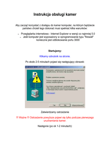 Instrukcja obsługi kamer Aby zacząć korzystać z dostępu do kamer komputer, na którym będziecie państwo chcieli tego dokonać musi spełniać kilka warunków: • Przeglądarka internetowa - Internet Explorer w wersji co najmniej 5.0 • Jeśli komputer jest wyposażony w oprogramowanie typu "firewall" konieczne jest odblokowanie portu 3000 Startujemy: Klikamy odnośnik na stronie. Po około 2-5 minutach pojawi się następujący obrazek: Zatwierdzamy ostrzeżenie !!! Ważne !!! Ostrzeżenie powyższe pojawi się tylko podczas pierwszego uruchamiania kamer. Następnie (po ok 1-2 minutach): W sekcji logowania wpisujemy odpowiednio nazwę uzytkownika i poniżej hasło: A następnie klikamy w przycisk LOG IN Po chwili pokażą nam się aktywne kamery. Ponieważ kamer jest w tej chwili 6 to wygodnie jest sobie powiększyć zakres poprzez kliknięcie na ikonie Aby powiększyć dowolny obraz z kamery wystarczy dwukrotnie kliknąc na jej obszarze Dodatkowe ustawienia przeglądarki Internet Explorer (zastosować, gdy występują problemy z pobraniem formantu ActiveX): Po uruchomieniu przeglądarki klikamy Narzędzia -> Opcje internetowe... W oknie, które pojawi się zaznaczamy zakładkę Zabezpieczenia a następnie klikamy przycisk Poziom niestandardowy... W polu Resetuj do: wybieramy opcję Niski, a następnie klikamy przycisk Resetuj i zatwierdzamy wybór. Aby ponowić próbę pobierania formantu ActiveX do obsługi kamer należy zamknąć i ponownie otworzyć przeglądarkę, a następnie przejść do początku instrukcji.
