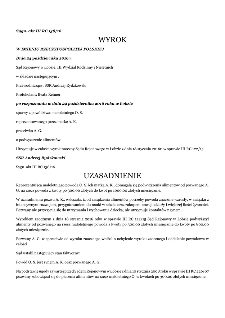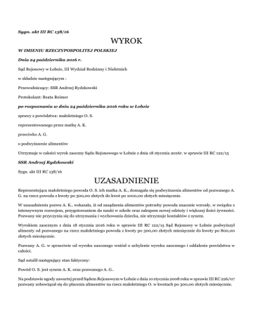 Sygn. akt III RC 138/16 WYROK W IMIENIU RZECZYPOSPOLITEJ POLSKIEJ Dnia 24 października 2016 r. Sąd Rejonowy w Łobzie, III Wydział Rodzinny i Nieletnich w składzie następującym : Przewodniczący: SSR Andrzej Rydzkowski Protokolant: Beata Reimer po rozpoznaniu w dniu 24 października 2016 roku w Łobzie sprawy z powództwa: małoletniego O. S. reprezentowanego przez matkę A. K. przeciwko A. G. o podwyższenie alimentów Utrzymuje w całości wyrok zaoczny Sądu Rejonowego w Łobzie z dnia 18 stycznia 2016r. w sprawie III RC 122/15 SSR Andrzej Rydzkowski Sygn. akt III RC 138/16 UZASADNIENIE Reprezentująca małoletniego powoda O. S. ich matka A. K., domagała się podwyższenia alimentów od pozwanego A. G. na rzecz powoda z kwoty po 300,00 złotych do kwot po 1000,00 złotych miesięcznie. W uzasadnieniu pozwu A. K., wskazała, iż od zasądzenia alimentów potrzeby powoda znacznie wzrosły, w związku z intensywnym rozwojem, przygotowaniem do nauki w szkole oraz zakupem nowej odzieży i większej ilości żywności. Pozwany nie przyczynia się do utrzymania i wychowania dziecka, nie utrzymuje kontaktów z synem. Wyrokiem zaocznym z dnia 18 stycznia 2016 roku w sprawie III RC 122/15 Sąd Rejonowy w Łobzie podwyższył alimenty od pozwanego na rzecz małoletniego powoda z kwoty po 300,00 złotych miesięcznie do kwoty po 800,00 złotych miesięcznie. Pozwany A. G. w sprzeciwie od wyroku zaocznego wniósł o uchylenie wyroku zaocznego i oddalenie powództwa w całości. Sąd ustalił następujący stan faktyczny: Powód O. S. jest synem A. K. oraz pozwanego A. G.. Na podstawie ugody zawartej przed Sądem Rejonowym w Łobzie z dnia 10 stycznia 2008 roku w sprawie III RC 226/07 pozwany zobowiązał się do płacenia alimentów na rzecz małoletniego O. w kwotach po 300,00 złotych miesięcznie. Małoletni O. S. miał wówczas kilka miesięcy. Nie chorował przewlekle. Zamieszkiwał z matką u jej rodziców, którzy pokrywali koszty mieszkania. Żywność dla syna jego matka przygotowywała samodzielnie. Na pieluchy i mleko wydawała 300,00 złotych miesięcznie. Matka powoda nie pracowała. Pozwany A. G. pracował wówczas jako kierowca zarabiał okoo 1.500,00 złotych miesięcznie. Nie chorował przewlekle. Żona pozwanego nie pracowała. Pozwany mieszkał z żoną w jej domku jednorodzinnym. Koszty jego utrzymania to 800,00 złotych miesięcznie. (Dowód: akt sprawy III RC 226/07). W dniu 19 sierpnia 2016 roku matka małoletniego powoda wystąpiła do Sądu Rejonowego w Łobzie z przedmiotowym pozwem domagając się podwyższenia alimentów od pozwanego A. G. na rzecz powoda z kwoty po 300,00 złotych do kwot po 1000,00 złotych miesięcznie. W dacie orzekania małoletni O. miał 8 lat. Nie chorował przewlekle, Mieszkał z matką, jej z mężem i przyrodnią siostrą. Chodził do niemieckiej szkoły. Za dodatkowe zajęcia jego matka płaciła 60,00 EUR miesięcznie, były to zajęcia ogólnosportowe. Raz na rok płaciła 60,00 EUR za podręczniki i ćwiczenia. Matka powoda pracowała w domu opieki społecznej, zarabiając 1200,00 EUR netto miesięcznie. Spłacała kredyt samochodowy po 100,00 EUR miesięcznie. Mąż A. K. był chory, nie mógł pracować. Był na komisji lekarskiej. Matka powoda dorabiała dodatkowo 400,00 EUR miesięcznie.. Dostawała 360,00 EUR zasiłku na dzieci miesięcznie. Wynajmowała z mężem mieszkanie.. Czynsz z mediami wynosił około 700,00 EUR miesięcznie. Na córkę otrzymywała 250,00 złotych alimentów, które płacił jej ojciec. Powód nie miał żadnego majątku. Pozwany A. G. w dacie orzekania miał 53 lata. Nie chorował przewlekle. Z zawodu był rolnikiem. Oprócz powoda nie miał innych dzieci na utrzymaniu. Pracował jako kierowca w transporcie krajowym i międzynarodowym. Zarabiał 2.000,00 złotych brutto miesięcznie, dodatkowo otrzymywał tytułem delegacji 1.200,00-1.300,00 złotych miesięcznie. Mieszkał z żoną w dwupokojowym mieszkaniu żony. Utrzymanie mieszkania wynosiło pozwanego około 300,00 złotych miesięcznie w sezonie letnim, zimą dodatkowo koszty ogrzewania gazowego wynosiły 300,00 złotych miesięcznie. Posiadał samochód F. (...) rocznik 2007. Żona pozwanego nie pracowała. Dotychczasowe alimenty płacił regularnie. Pożyczył od mamy i siostry pieniądze na wyższe alimenty i spłacił zadłużenie. Mama pozwanego miała 2.000,00 złotych emerytury. Siostra pracowała na ¼ etatu. Pozwany nie utrzymywał kontaktu z synem. Na koncie oprócz własnych środków których saldo od kwietnia do października 2016 roku wynosiło od 0 do 21.848,85 złotych swoje środki w kwocie 14.427,72 złotych przelała na krótki okres czasu córka pozwanego M. P., które wybrała podczas wakacyjnego pobytu w Polsce. Środki własne pozwanego w tym okresie wynosiły maksymalnie 9.306,38 złotych ( dowód: - zeznania A. K., k.12-13 akt sprawy; - zeznania A. G., k.59-60 akt sprawy; - zeznania świadka, M. P., k.89-90 akt sprawy, - wyciągi bankowe, k. 61-76 akt sprawy, - deklaracja podatkowa, k.77-88 akt sprawy, - zaświadczenie, k. 58 akt sprawy). Sąd zważył, co następuje: Art. 138 k.r.o. stanowi, iż w razie zmiany stosunków można żądać zmiany orzeczenia lub umowy dotyczącej obowiązku alimentacyjnego. Przez zmianę stosunków rozumie się istotne zwiększenie możliwości zarobkowych i majątkowych zobowiązanego do alimentacji, istotne zwiększenie się usprawiedliwionych potrzeb uprawnionego lub istotne zmniejszenie się możliwości zaspokajania potrzeb własnymi siłami. Wynika z tego, że rozstrzygnięcie o żądaniu opartym na art. 138 wymaga, po pierwsze, porównania stanu istniejącego w dacie uprawomocnienia się wyroku zasądzającego alimenty ze stanem istniejącym w dacie orzekania o ich podwyższeniu, po drugie zaś oznacza, że upływ czasu, jaki nastąpił od daty ostatniego wyroku alimentacyjnego do daty orzekania o podwyższeniu alimentów sam w sobie nie może jeszcze przemawiać za zasadnością pow