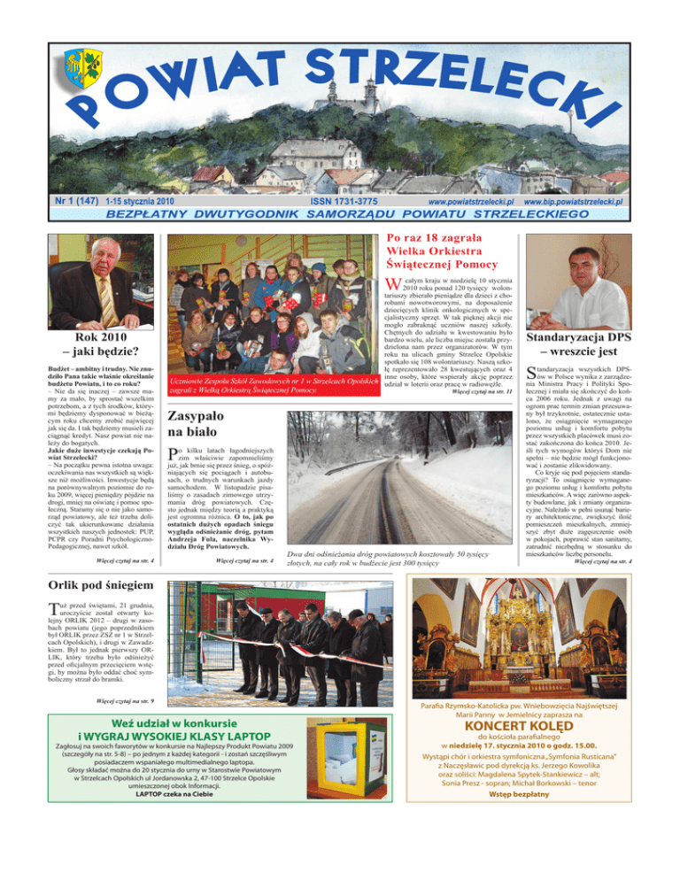 Po raz 18 zagrała Wielka Orkiestra Świątecznej Pomocy W Rok 2010 – jaki będzie? Budżet – ambitny i trudny. Nie znudziło Pana takie właśnie określanie budżetu Powiatu, i to co roku? – Nie da się inaczej – zawsze mamy za mało, by sprostać wszelkim potrzebom, a z tych środków, którymi będziemy dysponować w bieżącym roku chcemy zrobić najwięcej jak się da. I tak będziemy musieli zaciągnąć kredyt. Nasz powiat nie należy do bogatych. Jakie duże inwestycje czekają Powiat Strzelecki? – Na początku pewna istotna uwaga: oczekiwania nas wszystkich są większe niż możliwości. Inwestycje będą na porównywalnym poziomie do roku 2009, więcej pieniędzy pójdzie na drogi, mniej na oświatę i pomoc społeczną. Staramy się o nie jako samorząd powiatowy, ale też trzeba doliczyć tak ukierunkowane działania wszystkich naszych jednostek: PUP, PCPR czy Poradni PsychologicznoPedagogicznej, nawet szkół. Więcej czytaj na str. 4 całym kraju w niedzielę 10 stycznia 2010 roku ponad 120 tysięcy wolontariuszy zbierało pieniądze dla dzieci z chorobami nowotworowymi, na doposażenie dziecięcych klinik onkologicznych w specjalistyczny sprzęt. W tak pięknej akcji nie mogło zabraknąć uczniów naszej szkoły. Chętnych do udziału w kwestowaniu było bardzo wielu, ale liczba miejsc została przydzielona nam przez organizatorów. W tym roku na ulicach gminy Strzelce Opolskie spotkało się 108 wolontariuszy. Naszą szkołę reprezentowało 28 kwestujących oraz 4 inne osoby, które wspierały akcję poprzez Uczniowie Zespołu Szkół Zawodowych nr 1 w Strzelcach Opolskich udział w loterii oraz pracę w radiowęźle. zagrali z Wielką Orkiestrą Świątecznej Pomocy. Więcej czytaj na str. 11 Zasypało na biało o kilku latach łagodniejszych zim właściwie zapomnieliśmy już, jak brnie się przez śnieg, o spóźniających się pociągach i autobusach, o trudnych warunkach jazdy samochodem. W listopadzie pisaliśmy o zasadach zimowego utrzymania dróg powiatowych. Często jednak między teorią a praktyką jest ogromna różnica. O to, jak po ostatnich dużych opadach śniegu wygląda odśnieżanie dróg, pytam Andrzeja Fula, naczelnika Wydziału Dróg Powiatowych. P Więcej czytaj na str. 4 Dwa dni odśnieżania dróg powiatowych kosztowały 50 tysięcy złotych, na cały rok w budżecie jest 300 tysięcy Standaryzacja DPS – wreszcie jest S tandaryzacja wszystkich DPSów w Polsce wynika z zarządzenia Ministra Pracy i Polityki Społecznej i miała się skończyć do końca 2006 roku. Jednak z uwagi na ogrom prac termin zmian przesuwany był trzykrotnie, ostatecznie ustalono, że osiągnięcie wymaganego poziomu usług i komfortu pobytu przez wszystkich placówek musi zostać zakończona do końca 2010. Jeśli tych wymogów któryś Dom nie spełni – nie będzie mógł funkcjonować i zostanie zlikwidowany. Co kryje się pod pojęciem standaryzacji? To osiągnięcie wymaganego poziomu usług i komfortu pobytu mieszkańców. A więc zarówno aspekty budowlane, jak i zmiany organizacyjne. Należało w pełni usunąć bariery architektoniczne, zwiększyć ilość pomieszczeń mieszkalnych, zmniejszyć zbyt duże zagęszczenie osób w pokojach, poprawić stan sanitarny, zatrudnić niezbędną w stosunku do mieszkańców liczbę personelu. Więcej czytaj na str. 4 Orlik pod śniegiem uż przed świętami, 21 grudnia, uroczyście został otwarty kolejny ORLIK 2012 – drugi w zasobach powiatu (jego poprzednikiem był ORLIK przez ZSZ nr 1 w Strzelcach Opolskich), i drugi w Zawadzkiem. Był to jednak pierwszy ORLIK, który trzeba było odśnieżyć przed oficjalnym przecięciem wstęgi, by można było oddać choć symboliczny strzał do bramki. T Więcej czytaj na str. 9 Weź udział w konkursie i WYGRAJ WYSOKIEJ KLASY LAPTOP Zagłosuj na swoich faworytów w konkursie na Najlepszy Produkt Powiatu 2009 (szczegóły na str. 5-8) – po jednym z każdej kategorii - i zostań szczęśliwym posiadaczem wspaniałego multimedialnego laptopa. Głosy składać można do 20 stycznia do urny w Starostwie Powiatowym w Strzelcach Opolskich ul Jordanowska 2, 47-100 Strzelce Opolskie umieszczonej obok Informacji. LAPTOP czeka na Ciebie Parafia Rzymsko-Katolicka pw. Wniebowzięcia Najświętszej Marii Panny w Jemielnicy zaprasza na KONCERT KOLĘD do kościoła parafialnego w niedzielę 17. stycznia 2010 o godz. 15.00. Wystąpi chór i orkiestra symfoniczna „Symfonia Rusticana” z Naczęsławic pod dyrekcją ks. Jerzego Kowolika oraz soliści: Magdalena Spytek-Stankiewicz – alt; Sonia Presz - sopran; Michał Borkowski – tenor Wstęp bezpłatny