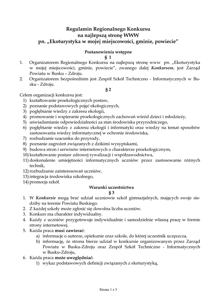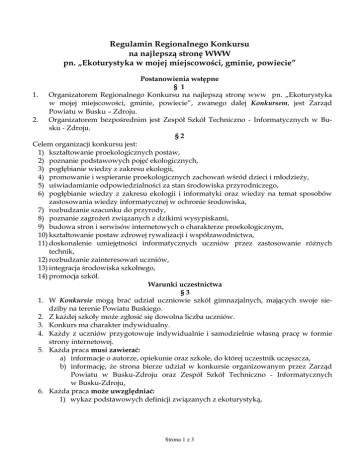 Regulamin Regionalnego Konkursu na najlepszą stronę WWW pn. „Ekoturystyka w mojej miejscowości, gminie, powiecie” Postanowienia wstępne § 1 1. Organizatorem Regionalnego Konkursu na najlepszą stronę www pn. „Ekoturystyka w mojej miejscowości, gminie, powiecie”, zwanego dalej Konkursem, jest Zarząd Powiatu w Busku – Zdroju. 2. Organizatorem bezpośrednim jest Zespół Szkół Techniczno - Informatycznych w Busku - Zdroju. §2 Celem organizacji konkursu jest: 1) kształtowanie proekologicznych postaw, 2) poznanie podstawowych pojęć ekologicznych, 3) pogłębianie wiedzy z zakresu ekologii, 4) promowanie i wspieranie proekologicznych zachowań wśród dzieci i młodzieży, 5) uświadamianie odpowiedzialności za stan środowiska przyrodniczego, 6) pogłębianie wiedzy z zakresu ekologii i informatyki oraz wiedzy na temat sposobów zastosowania wiedzy informatycznej w ochronie środowiska, 7) rozbudzanie szacunku do przyrody, 8) poznanie zagrożeń związanych z dzikimi wysypiskami, 9) budowa stron i serwisów internetowych o charakterze proekologicznym, 10) kształtowanie postaw zdrowej rywalizacji i współzawodnictwa, 11) doskonalenie umiejętności informatycznych uczniów przez zastosowanie różnych technik, 12) rozbudzanie zainteresowań uczniów, 13) integracja środowiska szkolnego, 14) promocja szkół. Warunki uczestnictwa §3 1. W Konkursie mogą brać udział uczniowie szkół gimnazjalnych, mających swoje siedziby na terenie Powiatu Buskiego. 2. Z każdej szkoły może zgłosić się dowolna liczba uczniów. 3. Konkurs ma charakter indywidualny. 4. Każdy z uczniów przygotowuje indywidualnie i samodzielnie własną pracę w formie strony internetowej. 5. Każda praca musi zawierać: a) informacje o autorze, opiekunie oraz szkole, do której uczestnik uczęszcza, b) informację, że strona bierze udział w konkursie organizowanym przez Zarząd Powiatu w Busku-Zdroju oraz Zespół Szkół Techniczno - Informatycznych w Busku-Zdroju, 6. Każda praca może uwzględniać: 1) wykaz podstawowych definicji związanych z ekoturystyką, Strona 1 z 3 2) opis miejsc i terenów (gminnych, powiatowych) związanych z ekoturystyką, miejsc ciekawych, wartych odwiedzenia czyli obszarów atrakcyjnych przyrodniczo i krajobrazowo, tj: ogrody, parki, rezerwaty, pomniki przyrody. 3) galerie tych miejsc, zawierające również ciekawe charakterystyczne kolekcje roślin i zwierząt, 4) mapki terenów o wyjątkowych walorach ekologicznych, 5) wykaz pobliskiej bazy noclegowej, turystycznej i agroturystycznej, 7. Każda praca musi spełniać wymogi Ustawy o prawie autorskim i prawach pokrewnych z dnia 4 lutego 1994r. (Dz. U. Nr 24, poz. 83 z późn. zm.). 8. Opiekunem i koordynatorem prac jest nauczyciel ze szkoły, do której uczęszcza uczestnik konkursu. 9. Zgłoszenia poszczególnych uczestników na czytelnie wypełnionym formularzu, który stanowi załącznik do niniejszego Regulaminu, podpisanym przez opiekuna, należy przesłać faxem, pocztą zwykłą lub elektroniczną ([email protected]) do dnia 29 stycznia 2010r. (karta zgłoszeniowa dostępna jest również pod adresem http://busko.edu.pl). Organizacja konkursu §4 1. Każdy uczestnik Konkursu otrzyma miejsce na serwerze Zespołu Szkół TechnicznoInformatycznych w Busku - Zdroju na stronę konkursową, która będzie na czas przygotowywania zabezpieczona hasłem i zablokowana przed dostępem innych użytkowników internetu. 2. Adres strony konkursowej zostanie podany uczestnikowi w ciągu dwóch tygodni od otrzymania poprawnie wypełnionego formularza zgłoszeniowego, o którym mowa w § 3 ust. 9, jednak nie później niż do dnia 14 lutego 2010r. 3. Czas trwania Konkursu ustala się na okres od stycznia do kwietnia 2010r. 4. Ostateczny termin umieszczenia prac konkursowych na serwerze Zespołu Szkół Techniczno - Informatycznych w Busku-Zdroju mija 19 marca 2010r., po czym dostęp do kont zostanie zablokowany. 5. Prace dostarczone po terminie, o którym mowa w ust. 4, nie będą oceniane. 6. Dla uczestników, którzy wykonali najlepsze prace przewidziane są nagrody indywidualne za zajęcie I, II i III miejsca, z zastrzeżeniem ust. 8 i 10. 7. Dla pozostałych uczestników przewidziane są wyróżnienia. 8. W terminie od 22 marca 2010 r. do 12 kwietnia 2009 r. (3 tygodnie) strony konkursowe będą opublikowane na serwerze Zespołu Szkół Techniczno - Informatycznych w Busku - Zdroju celem przeprowadzenia plebiscytu publiczności i wyłonienia najlepszej pracy według internautów. 9. W terminie, o którym w ust. 8, strony konkursowe nie mogą być modyfikowane. 10. Zwycięzca plebiscytu, o którym mowa w ust. 8, otrzyma nagrodę publiczności. 11. Prace konkursowe oceniane będą przez Komisję Konkursową powołaną przez Dyrektora Zespołu Szkół Techniczno - Informatycznych w Busku-Zdroju. 12. W skład Komisji wejdą między innymi: nauczyciele Zespołu Szkół Techniczno –Informatycznych w Busku - Zdroju, uczniowie Technikum Nr 2 w Zespołu Szkół Techniczno Strona 2 z 3 - Informatycznych (technik informatyk - systemy i sieci komputerowe) oraz przedstawiciele sponsorów. 13. Kryteria oceny prac konkursowych: 1) ocena merytoryczna: a) różnorodność i oryginalność przedstawionego materiału, b) poprawność językowa, c) podanie materiałów źródłowych, 2) ocena techniczna: a) estetyka pracy (grafika, animacje, kolorystyka), b) szybkość ładowania, c) kodowanie polskich znaków, d) możliwość obejrzenia strony na dowolnej przeglądarce i przy różnej rozdzielczości, e) stopień zaawansowania użytych technik, f) samodzielność pracy, g) czytelność pracy, h) łatwość wyszukiwania informacji (mapa strony), §5 1. Uroczyste ogłoszenie wyników i wręczenie nagród planowane jest w kwietniu 2010r. O dokładnym terminie uczestnicy zostaną powiadomieni listownie. 2. Wyniki Konkursu będą opublikowane w lokalnej prasie, na stronie głównej Zespołu Szkół Techniczno - Informatycznych w Busku -