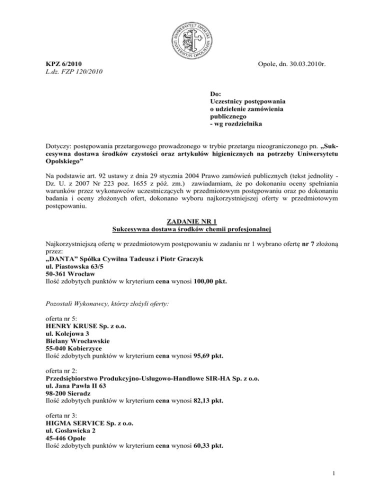 KPZ 6/2010 L.dz. FZP 120/2010 Opole, dn. 30.03.2010r. Do: Uczestnicy postępowania o udzielenie zamówienia publicznego - wg rozdzielnika Dotyczy: postępowania przetargowego prowadzonego w trybie przetargu nieograniczonego pn. „Sukcesywna dostawa środków czystości oraz artykułów higienicznych na potrzeby Uniwersytetu Opolskiego” Na podstawie art. 92 ustawy z dnia 29 stycznia 2004 Prawo zamówień publicznych (tekst jednolity Dz. U. z 2007 Nr 223 poz. 1655 z póź. zm.) zawiadamiam, że po dokonaniu oceny spełniania warunków przez wykonawców uczestniczących w przedmiotowym postępowaniu oraz po dokonaniu badania i oceny złożonych ofert, dokonano wyboru najkorzystniejszej oferty w przedmiotowym postępowaniu. ZADANIE NR 1 Sukcesywna dostawa środków chemii profesjonalnej Najkorzystniejszą ofertę w przedmiotowym postępowaniu w zadaniu nr 1 wybrano ofertę nr 7 złożoną przez: „DANTA” Spółka Cywilna Tadeusz i Piotr Graczyk ul. Piastowska 63/5 50-361 Wrocław Ilość zdobytych punktów w kryterium cena wynosi 100,00 pkt. Pozostali Wykonawcy, którzy złożyli oferty: oferta nr 5: HENRY KRUSE Sp. z o.o. ul. Kolejowa 3 Bielany Wrocławskie 55-040 Kobierzyce Ilość zdobytych punktów w kryterium cena wynosi 95,69 pkt. oferta nr 2: Przedsiębiorstwo Produkcyjno-Usługowo-Handlowe SIR-HA Sp. z o.o. ul. Jana Pawła II 63 98-200 Sieradz Ilość zdobytych punktów w kryterium cena wynosi 82,13 pkt. oferta nr 3: HIGMA SERVICE Sp. z o.o. ul. Gosławicka 2 45-446 Opole Ilość zdobytych punktów w kryterium cena wynosi 60,33 pkt. 1 ZADANIE NR 2 Sukcesywna dostawa środków chemii gospodarczej Najkorzystniejszą ofertę w przedmiotowym postępowaniu w zadaniu nr 2 wybrano ofertę nr 1 złożoną przez: Przedsiębiorstwo Handlowe ADMOR Jerzy Moryto ul. Wierzbicka 58 m.1 26-600 Radom Ilość zdobytych punktów w kryterium cena wynosi 100,00 pkt. Pozostali Wykonawcy, którzy złożyli oferty: oferta nr 7: „DANTA” Spółka Cywilna Tadeusz i Piotr Graczyk ul. Piastowska 63/5 50-361 Wrocław Ilość zdobytych punktów w kryterium cena wynosi 86,81 pkt. oferta nr 8: ARTIM Sp. z o.o. ul. Oleska 121 45-231 Opole Ilość zdobytych punktów w kryterium cena wynosi 65,33 pkt. oferta nr 4: FAZAN Roman Sacha ul. Turkusowa 17/19 43-100 Tychy Ilość zdobytych punktów w kryterium cena wynosi 47,46 pkt. ZADANIE NR 3 Sukcesywna dostawa materiałów eksploatacyjnych do utrzymania czystości Najkorzystniejszą ofertę w przedmiotowym postępowaniu w zadaniu nr 3 wybrano ofertę nr 7 złożoną przez: „DANTA” Spółka Cywilna Tadeusz i Piotr Graczyk ul. Piastowska 63/5 50-361 Wrocław Ilość zdobytych punktów w kryterium cena wynosi 100,00 pkt. Pozostali Wykonawcy, którzy złożyli oferty: oferta nr 1: Przedsiębiorstwo Handlowe ADMOR Jerzy Moryto ul. Wierzbicka 58 m.1 26-600 Radom Ilość zdobytych punktów w kryterium cena wynosi 85,54 pkt. 2 oferta nr 4: FAZAN Roman Sacha ul. Turkusowa 17/19 43-100 Tychy Ilość zdobytych punktów w kryterium cena wynosi 75,13 pkt. ZADANIE NR 4 Sukcesywna dostawa profesjonalnych materiałów eksploatacyjnych do utrzymania czystości Najkorzystniejszą ofertę w przedmiotowym postępowaniu w zadaniu nr 4 wybrano ofertę nr 3 złożoną przez: HIGMA SERVICE Sp. z o.o. ul. Gosławicka 2 45-446 Opole Ilość zdobytych punktów w kryterium cena wynosi 100,00 pkt. Pozostali Wykonawcy, którzy złożyli oferty: oferta nr 6: MERIDA Sp. z o.o. ul. Karkonoska 59 53-015 Wrocław Ilość zdobytych punktów w kryterium cena wynosi 97,81 pkt. oferta nr 2: Przedsiębiorstwo Produkcyjno-Usługowo-Handlowe SIR-HA Sp. z o.o. ul. Jana Pawła II 63 98-200 Sieradz Ilość zdobytych punktów w kryterium cena wynosi 87,48 pkt. ZADANIE NR 5 Sukcesywna dostawa artykułów higienicznych Najkorzystniejszą ofertę w przedmiotowym postępowaniu w zadaniu nr 5 wybrano ofertę nr 6 złożoną przez: MERIDA Sp. z o.o. ul. Karkonoska 59 53-015 Wrocław Ilość zdobytych punktów w kryterium cena wynosi 100,00 pkt. Pozostali Wykonawcy, którzy złożyli oferty: oferta nr 1: Przedsiębiorstwo Handlowe ADMOR Jerzy Moryto ul. Wierzbicka 58 m.1 26-600 Radom Ilość zdobytych punktów w kryterium cena wynosi 83,37 pkt. 3 oferta nr 4: FAZAN Roman Sacha ul. Turkusowa 17/19 43-100 Tychy Ilość zdobytych punktów w kryterium cena wynosi 70,62 pkt. Zamawiający przewiduje zawarcie umowy, w sprawie przedmiotowego postępowania w terminie określonym w art. 94 ust. 2 pkt. 3 lit. a. ustawy. O dokładnym terminie podpisania umowy powiadomimy Wykonawcę, którego oferta została wybrana. KIEROWNIK Działu Zamówień Publicznych mgr Stanisław Piestrak 4