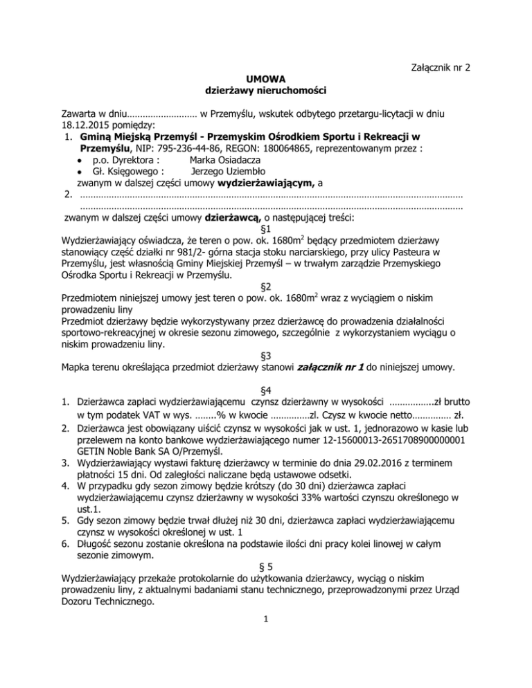 Załącznik nr 2 UMOWA dzierżawy nieruchomości Zawarta w dniu……………………… w Przemyślu, wskutek odbytego przetargu-licytacji w dniu 18.12.2015 pomiędzy: 1. Gminą Miejską Przemyśl - Przemyskim Ośrodkiem Sportu i Rekreacji w Przemyślu, NIP: 795-236-44-86, REGON: 180064865, reprezentowanym przez : p.o. Dyrektora : Marka Osiadacza Gł. Księgowego : Jerzego Uziembło zwanym w dalszej części umowy wydzierżawiającym, a 2. ………………………………………………………………………………………………………………………………… ………………………………………………………………………………………………………………………………… zwanym w dalszej części umowy dzierżawcą, o następującej treści: §1 Wydzierżawiający oświadcza, że teren o pow. ok. 1680m2 będący przedmiotem dzierżawy stanowiący część działki nr 981/2- górna stacja stoku narciarskiego, przy ulicy Pasteura w Przemyślu, jest własnością Gminy Miejskiej Przemyśl – w trwałym zarządzie Przemyskiego Ośrodka Sportu i Rekreacji w Przemyślu. §2 Przedmiotem niniejszej umowy jest teren o pow. ok. 1680m2 wraz z wyciągiem o niskim prowadzeniu liny Przedmiot dzierżawy będzie wykorzystywany przez dzierżawcę do prowadzenia działalności sportowo-rekreacyjnej w okresie sezonu zimowego, szczególnie z wykorzystaniem wyciągu o niskim prowadzeniu liny. §3 Mapka terenu określająca przedmiot dzierżawy stanowi załącznik nr 1 do niniejszej umowy. §4 1. Dzierżawca zapłaci wydzierżawiającemu czynsz dzierżawny w wysokości ……………..zł brutto w tym podatek VAT w wys. ……..% w kwocie ……………zl. Czysz w kwocie netto…………… zł. 2. Dzierżawca jest obowiązany uiścić czynsz w wysokości jak w ust. 1, jednorazowo w kasie lub przelewem na konto bankowe wydzierżawiającego numer 12-15600013-2651708900000001 GETIN Noble Bank SA O/Przemyśl. 3. Wydzierżawiający wystawi fakturę dzierżawcy w terminie do dnia 29.02.2016 z terminem płatności 15 dni. Od zaległości naliczane będą ustawowe odsetki. 4. W przypadku gdy sezon zimowy będzie krótszy (do 30 dni) dzierżawca zapłaci wydzierżawiającemu czynsz dzierżawny w wysokości 33% wartości czynszu określonego w ust.1. 5. Gdy sezon zimowy będzie trwał dłużej niż 30 dni, dzierżawca zapłaci wydzierżawiającemu czynsz w wysokości określonej w ust. 1 6. Długość sezonu zostanie określona na podstawie ilości dni pracy kolei linowej w całym sezonie zimowym. §5 Wydzierżawiający przekaże protokolarnie do użytkowania dzierżawcy, wyciąg o niskim prowadzeniu liny, z aktualnymi badaniami stanu technicznego, przeprowadzonymi przez Urząd Dozoru Technicznego. 1 §6 Dzierżawca zobowiązuje się: 1. utrzymywać przedmiot dzierżawy z należytą starannością oraz wykorzystywać go zgodnie z przeznaczeniem i na cele określone w niniejszej umowie, w tym dokonywać bieżących konserwacji i napraw 2. zwrócić przedmiot dzierżawy wydzierżawiającemu po wygaśnięciu lub rozwiązaniu niniejszej umowy w stanie niepogorszonym, 3. Dzierżawca ponosi odpowiedzialność za bezpieczeństwo osób korzystających z wyciągu , w związku z prowadzoną działalnością §7 1. Zwrot przedmiotu dzierżawy zostanie poprzedzony weryfikacją przez wspólną komisję (złożoną z przedstawicieli wydzierżawiającego i dzierżawcy), stanu technicznego przedmiotu dzierżawy. 2. W przypadku stwierdzenia uszkodzeń przedmiotu dzierżawy nie wynikających z normalnego jego używania – wydzierżawiający obciąży dzierżawcę kwotą stanowiącą równowartość stwierdzonych braków lub zniszczeń. 3. W przypadku rozwiązania niniejszej umowy dzierżawca zobowiązany jest zwrócić wydzierżawiającemu przedmiot dzierżawy w stanie nie pogorszonym 1. 2. §8 Dzierżawca zobowiązuje się do ubezpieczenia przedmiotu dzierżawy od następstw losowych, kradzieży włącznie z ubezpieczeniem OC w związku z prowadzoną przez dzierżawcę działalnością. Dzierżawca zapewni obsługę wyciągu przez osobę posiadającą stosowane uprawnienia. §9 Dzierżawca oświadcza, że zapoznał się ze stanem technicznym przedmiotu dzierżawy i nie wnosi zastrzeżeń. § 10 1. Niniejsza umowa zostaje zawarta na okres sezonu zimowego 2015/2016 (tj od 23.12.2015 do 31.03.2015). 2. W przypadku nie wywiązywania się dzierżawcy z obowiązków określonych w umowie – w tym za nieterminowe uregulowanie czynszu i inne, wydzierżawiający może jednostronnie rozwiązać umowę za 14 dniowym terminem wypowiedzenia – po uprzednim pisemnym wezwaniu do wywiązywania się przez dzierżawcę z obowiązków – które okazało się bezskuteczne. 3. Niniejsza umowa w innych wypadkach może zostać rozwiązana przed okresem na który została zawarta wyłącznie za pisemną zgodą wydzierżawiającego – na zasadzie porozumienia między stronami umowy. § 11 Przedmiot dzierżawy, nie może zostać podnajęty podmiotowi trzeciemu, bez zgody wydzierżawiającego § 12 Przedstawicielem wydzierżawiającego upoważnionym do kontroli przestrzegania warunków umowy i do kontaktu jest pan Paweł Jucha kierownik parku sportowo-rekreacyjnego tel. 667 942 506 2 § 13 Wszelkie zmiany warunków niniejszej umowy wymagają formy pisemnej. § 14 Spory wynikłe pomiędzy stronami niniejszej umowy będą rozstrzygane przez sąd właściwy ze względu na siedzibę wydzierżawiającego. § 15 Umowę sporządzono w 3 jednobrzmiących egzemplarzach, z czego 1 egz. dla dzierżawcy i 2 egz. dla wydzierżawiającego. Wydzierżawiający Dzierżawca Załączniki: 1) Mapka terenu - zał, nr 1 3