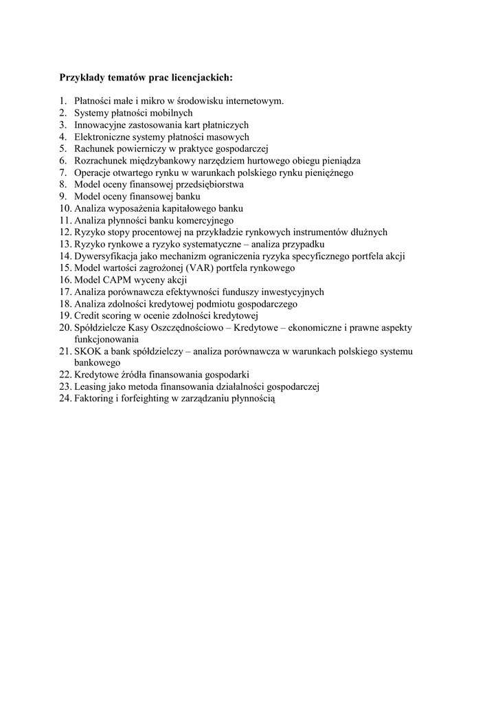 Przykłady tematów prac licencjackich: 1. Płatności małe i mikro w środowisku internetowym. 2. Systemy płatności mobilnych 3. Innowacyjne zastosowania kart płatniczych 4. Elektroniczne systemy płatności masowych 5. Rachunek powierniczy w praktyce gospodarczej 6. Rozrachunek międzybankowy narzędziem hurtowego obiegu pieniądza 7. Operacje otwartego rynku w warunkach polskiego rynku pieniężnego 8. Model oceny finansowej przedsiębiorstwa 9. Model oceny finansowej banku 10. Analiza wyposażenia kapitałowego banku 11. Analiza płynności banku komercyjnego 12. Ryzyko stopy procentowej na przykładzie rynkowych instrumentów dłużnych 13. Ryzyko rynkowe a ryzyko systematyczne – analiza przypadku 14. Dywersyfikacja jako mechanizm ograniczenia ryzyka specyficznego portfela akcji 15. Model wartości zagrożonej (VAR) portfela rynkowego 16. Model CAPM wyceny akcji 17. Analiza porównawcza efektywności funduszy inwestycyjnych 18. Analiza zdolności kredytowej podmiotu gospodarczego 19. Credit scoring w ocenie zdolności kredytowej 20. Spółdzielcze Kasy Oszczędnościowo – Kredytowe – ekonomiczne i prawne aspekty funkcjonowania 21. SKOK a bank spółdzielczy – analiza porównawcza w warunkach polskiego systemu bankowego 22. Kredytowe źródła finansowania gospodarki 23. Leasing jako metoda finansowania działalności gospodarczej 24. Faktoring i forfeighting w zarządzaniu płynnością