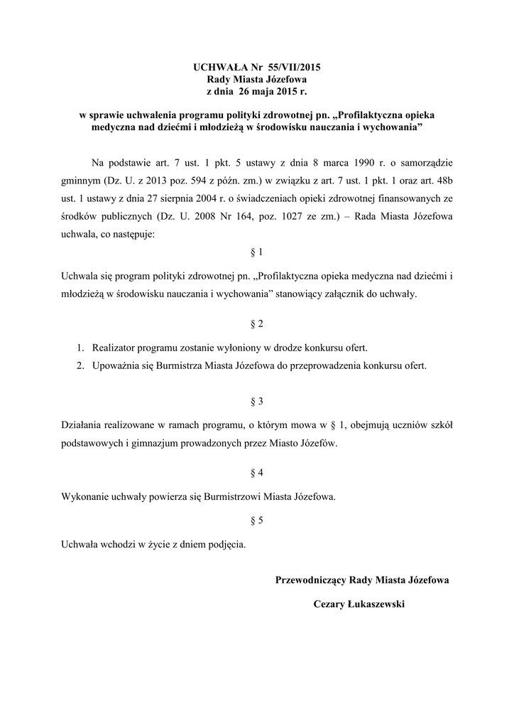 UCHWAŁA Nr 55/VII/2015 Rady Miasta Józefowa z dnia 26 maja 2015 r. w sprawie uchwalenia programu polityki zdrowotnej pn. „Profilaktyczna opieka medyczna nad dziećmi i młodzieżą w środowisku nauczania i wychowania” Na podstawie art. 7 ust. 1 pkt. 5 ustawy z dnia 8 marca 1990 r. o samorządzie gminnym (Dz. U. z 2013 poz. 594 z późn. zm.) w związku z art. 7 ust. 1 pkt. 1 oraz art. 48b ust. 1 ustawy z dnia 27 sierpnia 2004 r. o świadczeniach opieki zdrowotnej finansowanych ze środków publicznych (Dz. U. 2008 Nr 164, poz. 1027 ze zm.) – Rada Miasta Józefowa uchwala, co następuje: §1 Uchwala się program polityki zdrowotnej pn. „Profilaktyczna opieka medyczna nad dziećmi i młodzieżą w środowisku nauczania i wychowania” stanowiący załącznik do uchwały. §2 1. Realizator programu zostanie wyłoniony w drodze konkursu ofert. 2. Upoważnia się Burmistrza Miasta Józefowa do przeprowadzenia konkursu ofert. §3 Działania realizowane w ramach programu, o którym mowa w § 1, obejmują uczniów szkół podstawowych i gimnazjum prowadzonych przez Miasto Józefów. §4 Wykonanie uchwały powierza się Burmistrzowi Miasta Józefowa. §5 Uchwała wchodzi w życie z dniem podjęcia. Przewodniczący Rady Miasta Józefowa Cezary Łukaszewski Uzasadnienie Zdaniem własnym gminy, w zakresie zapewnienia równego dostępu do świadczeń opieki zdrowotnej, jest opracowywanie i realizacja programów polityki zdrowotnej wynikających z rozpoznanych potrzeb zdrowotnych i stanu zdrowia mieszkańców gminy. Niniejsze obowiązki wynikają z art. 7 ust. 1 pkt 5 ustawy z dnia 8 marca 1990 r. o samorządzie gminnym (Dz. U. z 2013 r. poz. 594 j.t.) oraz z art. 7 ust. 1 pkt 1 ustawy z dnia 27 sierpnia 2004 r. o świadczeniach opieki zdrowotnej finansowanych ze środków publicznych (Dz. U. z 2008 r. Nr 164 poz.1027 j. t.) Rada Miasta Józefowa podejmuje działania zmierzające do polepszenia stanu zdrowia mieszkańców, za cel priorytetowy stawiając sobie zdrowie dzieci i młodzieży. Skala problemów zdrowotnych mieszkańców Józefowa podobna jest do sytuacji ogólnokrajowej. Do najczęstszych problemów zaliczyć należy: niekorzystny styl życia (mała aktywność fizyczna, nieprawidłowy sposób odżywiania, palenie tytoniu, brak umiejętności radzenia sobie ze stresem), nowotwory złośliwe, wady postawy, urazy, choroby układu oddechowego i pokarmowego, choroby zakaźne. Opierając się na wytycznych Narodowego Programu Zdrowia na lata 2007-2015 oraz mając na uwadze zgłaszane wnioski, Rada Miasta Józefowa podejmuje uchwałę o wprowadzenie w roku 2015 programu polityki zdrowotnej skierowanego do dzieci i młodzieży, wypełniając wymogi ustawy o samorządzie gminnym oraz ustawy o świadczeniach opieki zdrowotnej finansowanych ze środków publicznych. Przewodniczący Rady Miasta Józefowa Cezary Łukaszewski Załącznik do Uchwały Nr 55/VII/2015 Rady Miasta Józefowa z dnia 26 maja 2015 r. Program polityki zdrowotnej pn. „Profilaktyczna opieka medyczna nad dziećmi i młodzieżą w środowisku nauczania i wychowania” 1. Opis problemu i epidemiologia Uczęszczanie do szkoły obejmuje 2/3 całego wieku rozwojowego człowieka. Jest to okres dynamicznego rozwoju fizycznego i psychospołecznego, w którym ujawnia się lub pogłębia wiele zaburzeń, w tym przede wszystkim: zaburzenia wzroku, słuchu, mowy, układu ruchu, otyłość, problemy okresu dojrzewania, z uwzględnieniem okresu dojrzewania seksualnego. Jest to ponadto okres zwiększonej częstotliwości zachowań ryzykownych dla zdrowia (palenie tytoniu, picie alkoholu, używanie narkotyków, przedwczesna inicjacja seksualna, przemoc), z nielicznymi zachowaniami prozdrowotnymi (m.in. mała aktywność fizyczna, nieprawidłowości w żywieniu). Wszystko to warunkuje zdrowie ludzi w dalszych latach życia i trudno jest potem cokolwiek już zmienić. Z tego powodu populacja dzieci w wieku szkolnym, obok zapewnienia odpowiednich warunków życia, oddziaływań wychowawczych (w tym edukacji zdrowotnej) wymaga zapewnienia profilaktycznej opieki zdrowotnej, obejmującą profilaktykę pierwszo-, drugoi trzeciorzędową oraz promocje zdrowia. Jak pokazują badania ponad 90% polskich dzieci ma uchybienia zdrowotne. Zauważalnym problemem jest np. otyłość i nadwaga, które w przyszłości mogą być powodem schorzeń cywilizacyjnych, jak m.in. cukrzyca, nadciśnienie tętnicze, choroby układu krążenia. Także próchnica zębów jest zmorą wieku rozwojowego. Specjaliści z dziedziny zdrowia publicznego określają obecny stan zdrowia dzieci i młodzieży jako krytyczny. W myśl przepisów ustawy z dnia 7 września 1991 r. o systemie oświaty (Dz. U. z 2004. 256. 2572. j.t.) tworzenie i prowadzenie publicznych szkół podstawowych i gimnazjów należy do zadań własnych gmin. Są one przy tym zobowiązane do zapewnienia warunków sprawowania profilaktycznej opieki zdrowotnej nad uczniami. Według Światowej Organizacji Zdrowia profilaktyczna opieka zdrowotna nad uczniami jest wymieniana jako pierwszy element nowoczesnego programu zdrowia w szkole. Powinny na niego składać się: edukacja i promocja zdrowia, sprzyjające zdrowiu środowisko fizyczne i społeczne szkoły, posiłki szkolne, wychowanie fizyczne i rekreacja, poradnictwo oraz wsparcie w zakresie zdrowia psychicznego. Należy nadmienić, że zdrowie i edukacja są ściśle ze sobą powiązane. Dzieci zdrowe lepiej się uczą, a ludzi o wyższym poziomie wykształcenia charakteryzuje lepszy stan zdrowia. Powszechnie uważa się, że edukacja zdrowotna dzieci i młodzieży w miejscu ich nauki jest najbardziej skuteczną i opłacalną inwestycją w długofalowym programie poprawy zdrowia społeczeństwa. Zgodnie z przepisami prawa, profilaktyczną opiekę zdrowotną nad uczniem sprawują: 1) lekarz POZ sprawujący opiekę zdrowotną nad uczniem na podstawie deklaracji wyboru lekarza POZ - w miejscu określonym umowie o udzielanie świadczeń opieki zdrowotnej; 2) 