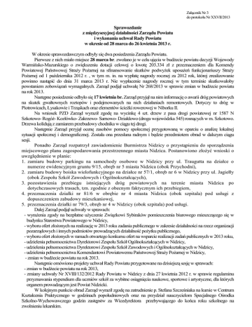 Załącznik Nr 3 do protokołu Nr XXVII/2013 Sprawozdanie z międzysesyjnej działalności Zarządu Powiatu i wykonania uchwał Rady Powiatu w okresie od 28 marca do 26 kwietnia 2013 r. W okresie sprawozdawczym odbyły się dwa posiedzenia Zarządu Powiatu. Pierwsze z nich miało miejsce 28 marca br. zwołano je w celu ujęcia w budżecie powiatu decyzji Wojewody Warmińsko-Mazurskiego o zwiększeniu dotacji celowej o kwotę 203.334 zł z przeznaczeniem dla Komendy Powiatowej Państwowej Straży Pożarnej na sfinansowanie skutków podwyżek uposażeń funkcjonariuszy Straży Pożarnej od 1 października 2012 r. , w tym m. in. na wypłatę nagrody rocznej za 2012 rok, której zrealizowanie powinno nastąpić do dnia 31 marca 2013 r. Nie wypłacenie nagrody rocznej w tym terminie skutkowałoby powstaniem zobowiązań wymagalnych. Zarząd podjął uchwałę Nr 268/2013 w sprawie zmian w budżecie powiatu na rok 2013. Następne posiedzenie odbyło się 17 kwietnia br. Zarząd przyjął na nim informację o awarii dróg powiatowych na skutek gwałtownych roztopów i podejmowanych na nich działaniach remontowych. Dotyczy to dróg w Piotrowicach, Łysakowie i Trząskach oraz elementów ścieżki rowerowej w Niborku II. Na wniosek PZD Zarząd wyraził zgodę na wycinkę 4 szt. drzew z pasa drogi powiatowej nr 1587 N Szkotowo- Rogóż- Kozłówko- Zakrzewo- Sarnowo- Działdowo (droga wojewódzka 545) rosnących w m. Szkotowo. Drzewa kolidują z zamiarem przebudowy chodnika w ciągu tej drogi. Następnie Zarząd przyjął ocenę zasobów pomocy społecznej przygotowaną w oparciu o analizę lokalnej sytuacji społecznej i demograficznej. Została ona przesłana radnym i będzie przedmiotem obrad w dalszym ciągu sesji. Ponadto Zarząd rozpatrzył zawiadomienie Burmistrza Nidzicy o przystąpieniu do sporządzenia miejscowego planu zagospodarowania przestrzennego miasta Nidzica. Postanowiono złożyć wnioski o uwzględnienie w planie: 1. zamiaru budowy parkingu na samochody osobowe w Nidzicy przy ul. Traugutta na działce o numerze ewidencyjnym gruntu 9/15, obręb nr 5 miasta Nidzica (obok Przychodni), 2. zamiaru budowy boiska wielofunkcyjnego na działce nr 57/1, obręb nr 6 w Nidzicy przy ul. Jagiełły (obok Zespołu Szkół Zawodowych i Ogólnokształcących), 3. pozostawienia przebiegu istniejących dróg powiatowych na terenie miasta Nidzica po dotychczasowych trasach, tzn. zgodnie z obecnym faktycznym ich przebiegiem, 4. przeznaczenia działki nr 81/6 w obrębie nr 4 miasta Nidzica (obok szpitala) pod usługi z dopuszczeniem zabudowy mieszkaniowej, 5. przeznaczenia działki nr 79/3, obręb nr 4 w Nidzicy (obok szpitala) pod usługi. Dalej Zarząd podjął uchwały w sprawach: - wyrażenia zgody na bezpłatne użyczenie Związkowi Sybiraków pomieszczenia biurowego mieszczącego się w budynku Starostwa Powiatowego w Nidzicy, - wyboru ofert złożonych na realizację w 2013 roku zadania publicznego w zakresie działalności na rzecz organizacji pozarządowych i innych podmiotów prowadzących działalność pożytku publicznego, - wyboru ofert złożonych w ramach otwartego konkursu ofert na wsparcie realizacji zadań publicznych w 2013 roku, - udzielenia pełnomocnictwa Dyrektorowi Zespołu Szkół Ogólnokształcących w Nidzicy, - udzielenia pełnomocnictwa Dyrektorowi Zespołu Szkół Zawodowych i Ogólnokształcących w Nidzicy, - udzielenia pełnomocnictwa Komendantowi Powiatowemu Państwowej Straży Pożarnej w Nidzicy, - zmian w budżecie powiatu na rok 2013. Następnie omówiono projekty uchwał Rady Powiatu przygotowane na dzisiejszą sesję w sprawach: - zmian w budżecie powiatu na rok 2013, - zmiany uchwały Nr XVIII/132/2012 Rady Powiatu w Nidzicy z dnia 27 kwietnia 2012 r. w sprawie regulaminu przyznawania stypendium dla uczniów szkół za wybitne osiągnięcia naukowe, sportowe i artystyczne, dla których organem prowadzącym jest Powiat Nidzicki. W kolejnym punkcie obrad Zarząd wyraził zgodę na zatrudnienie p. Stefana Szcześniaka na kursie w Centrum Kształcenia Praktycznego w godzinach popołudniowych oraz na przydział nauczycielom Specjalnego Ośrodka Szkolno-Wychowawczego godzin zastępstw za Wicedyrektora przebywającego do końca roku szkolnego na zwolnieniu lekarskim. Zarząd przyjął informację nt. tegorocznej, zmienionej edycji konkursu „Czysta i piękna zagroda - Estetyczna Wieś 2013” i wybrał p. Lecha Brzozowskiego i p. Janusz Kwiatka jako przedstawicieli Zarządu w Komisji Konkursowej. Szczegółowe informacje przekazane były na posiedzeniach komisji. Zarządzeniem Starosty Nr Z/13/2013 z dnia 23 kwietnia 2013 r. powołana została komisja konkursowa w następującym składzie: Przewodniczący – Lech Brzozowski (Wicestarosta) i członkowie: Anna Mróz (Starostwo Powiatowe), Zygmunt Szatkowski (Urząd Miejski), Paweł Oman (Urząd Gminy w Kozłowie), Anna Jacyno (Urząd Gminy w Kozłowie), Janusz Kwiatek (Przedstawiciel Rady Powiatu), Alicja Stelmaszczyk (Starostwo Powiatowe). W tym roku tylko gm. Kozłowo zgłosiła miejscowość do konkursu . O nagrodę walczyć będzie wieś Browina. W dalszej części obrad omówiono sprawy dotyczące gospodarowania nieruchomościami, a mianowicie: - trwa postępowanie w sprawie ustalenia wysokości odszkodowania za grunty położone w obrębie Jabłonka, przeznaczone pod drogę powiatową. Strona postępowania ma zastrzeżenia odnośnie operatu. Zostaną one przekazane rzeczoznawcy; - w Ministerstwie Rolnictwa i Rozwoju Wsi toczy się postępowanie w sprawie stwierdzenia przejęcia z naruszeniem prawa majątku ziemskiego na cele reformy rolnej. W skład majątku wchodzi droga powiatowa. Jeśli stwierdzona zostanie nieważność decyzji, to odszkodowanie wypłacać będzie Skarb Państwa; - trwa postępowanie w sprawie odszkodowania za nieruchomości powiatu przejęte przez Województwo Warmińsko-Mazurskie pod drogę 545. Dotyczy ono gruntów o pow. 11,56 a. W odpowiedzi na nasz wniosek Zarząd Dróg Wojewódz