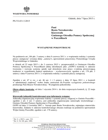 WOJEWODA POMORSKI Gdańsk, dnia 7 lipca 2015 r. PS-VI.431.5.2015 Pani Beata Nowakowska Kierownik Gminnego Ośrodka Pomocy Społecznej w Pszczółkach WYSTĄPIENIE POKONTROLNE Na podstawie art. 186 pkt. 3 ustawy z dnia 9 czerwca 2011 r. o wspieraniu rodziny i systemie pieczy zastępczej1 (zwanej dalej: „ustawą”), upoważnieni pracownicy Pomorskiego Urzędu Wojewódzkiego w Gdańsku: w dniach od 22 maja 2015 r. do 3 czerwca 2015 r. przeprowadzili w Gminnym Ośrodku Pomocy Społecznej w Pszczółkach (dalej określanym jako „GOPS”) kontrolę w zakresie tworzenia i rozwoju systemu opieki nad dzieckiem oraz pracy z rodziną przezywającą trudności w wypełnianiu funkcji opiekuńczo – wychowawczych, zgodnie z art. 176 pkt. 3 ustawy z dnia 9 czerwca 2011 r. o wspieraniu rodziny i systemie pieczy zastępczej. Zgodnie z art. 47 w zw. z art. 46 ust. 1 i 3 ustawy z dnia 15 lipca 2011 r. o kontroli w administracji rządowej2 wobec braku zastrzeżeń do Projektu wystąpienia pokontrolnego przekazuję Pani Beacie Nowakowskiej - Wystąpienie pokontrolne. Okres objęty kontrolą: od dnia 1 stycznia 2014 r. do dnia rozpoczęcia kontroli, tj. 22 maja 2015 r. Kierownik jednostki kontrolowanej oraz informacje wstępne: Jednostką organizacyjną wspierania rodziny i systemu pieczy zstępczej w Gminie Pszczółki zgodnie z art. 2 ust. 3 ustawy, jest jednostka organizacyjna samorządu terytorialnego Gminny Ośrodek Pomocy Społecznej w Pszczółkach. GOPS od dnia 11 kwietnia 2007 r. kieruje pani Beata Nowakowska, zajmująca stanowisko kierownika. Zadania w zakresie kontrolowanego obszaru realizuje na podstawie upoważnień Wójta Gminy Pszczółki, zgodnie z art. 178 ustawy. 1 2 Dz. U. z 2015 r., poz. 332. Dz. U. Nr 185, poz. 1092. WYDZIAŁ POLITYKI SPOLECZNEJ . POMORSKI URZĄD WOJEWÓDZKI W GDAŃSKU ul. Okopowa 21/27, 80-810 Gdańsk, tel.: 58 30 77287, fax: 58 30 77 14 337 www.gdansk.uw.gov.pl, e-mail: [email protected] Ocena skontrolowanej działalności: Po dokonaniu ustaleń na podstawie analizy materiałów źródłowych, przygotowanych zestawień przedstawionych do kontroli oraz rozmów z kierownikiem GOPS oraz asystentem rodziny, działalność Gminnego Ośrodka Pomocy Społecznej w Pszczółkach w zakresie realizacji zadań gminy wynikających z ustawy z dnia 9 czerwca 2011 r. o wspieraniu rodziny i systemie pieczy zastępczej oceniono na poziomie pozytywnym z uchybieniami. Uzasadnienie oceny: I. W zakresie utworzonego i funkcjonującego w Gminie Pszczółki systemu wsparcia i pomocy, skierowanego do rodzin przeżywających trudności w wypełnianiu funkcji opiekuńczo – wychowawczych GOPS w Pszczółkach jest podmiotem, który zgodnie z art. 10 ust. 1 ustawy realizuje zadania gminy w obszarze wspierania rodziny. Funkcjonuje na podstawie obowiązującego, na dzień rozpoczęcia kontroli, Statutu, przyjętego Uchwałą Nr XI/95/11 Rady Gminy Pszczółki z dna 14 grudnia 2011 r. w sprawie zatwierdzenia Statutu Gminnego Ośrodka Pomocy Społecznej w Pszczółkach. Statut został zaktualizowany Uchwałą Nr XXIV/267/13 Rady Gminy Pszczółki z dnia 18 grudnia 2013 r., zmieniającą Uchwałę Nr XI/95/11 z dnia 14 grudnia 2011 r. w sprawie zatwierdzenia Statutu Gminnego Ośrodka Pomocy Społecznej w Pszczółkach. Dokumentem nadającym podstawy funkcjonowania GOPS jest także Regulamin Organizacyjny. Zespołowi kontrolującemu przedstawiono Zarządzenie Nr 9/10 Kierownika Gminnego Ośrodka Pomocy Społecznej w Pszczółkach z dnia 28 grudnia 2010 r. w sprawie Regulaminu Organizacyjnego Gminnego Ośrodka Pomocy Społecznej w Pszczółkach. Regulamin zmieniony został Zarządzeniem Nr 21/11 Kierownika Gminnego Ośrodka Pomocy Społecznej w Pszczółkach z dnia 19 grudnia 2011 r. w sprawie zmiany Zarządzenia Nr 9/10 Kierownika Gminnego Ośrodka Pomocy Społecznej w Pszczółkach z dnia 28 grudnia 2010 r. w sprawie Regulaminu Organizacyjnego Gminnego Ośrodka Pomocy Społecznej w Pszczółkach. Zmiany dotyczyły godzin pracy GOPS w poszczególne dni tygodnia oraz precyzowały wykaz zastępstw na poszczególnych stanowiskach pracy. Po dokonaniu analizy dokumentu ustalono, że zapisy w nim zawarte w żaden sposób nie odnoszą się, zarówno w zakresie podstaw prawa, jak i organizacji, do realizacji obszaru zadań wynikających z ustawy. Stan taki stanowi nieprawidłowość i wymaga niezwłocznej aktualizacji. Za opracowanie i aktualizację do obowiązujących przepisów prawa regulaminu organizacyjnego GOPS, odpowiedzialność ponosi kierownik jednostki. Na podstawie dalszych wyjaśnień kierownika ustalono, że w celu usystematyzowania i usprawnienia podejmowanych działań w zakresie ustawy z dnia 9 czerwca 2011 r. o wspieraniu rodziny i systemie pieczy zastępczej, opracowana została procedura wewnętrzna, przyjęta Zarządzeniem Nr 1/15 Kierownika Gminnego Ośrodka Pomocy Społecznej w Pszczółkach z dnia 15 stycznia 2015 r. w sprawie wprowadzenia procedury postępowania oraz działań podejmowanych na rzecz rodzin objętych wsparciem asystenta rodziny i pracownika socjalnego. W Gminie Pszczółki, w myśl art. 176 pkt. 1 ustawy, opracowany został Gminny Program Wspierania Rodziny na lata 2012 – 2014. Uchwałą Nr XIV/139/12 Rady Gminy Pszczółki z dnia 12 września 2012 r. przyjęty został do realizacji. Do kontroli, przedstawiono roczne sprawozdanie z realizacji zadań gminy w obszarze wspierania rodziny, przygotowane WYDZIAŁ POLITYKI SPOŁECZNEJ. POMORSKI URZĄD WOJEWÓDZKI W GDAŃSKU ul. Okopowa 21/27, 80-810 Gdańsk, tel.: 58 30 77 28, fax: 58 301 43 37 www.gdansk.uw.gov.pl, e-mail: [email protected] i przekazane przez kierownika GOPS Radzie Gminy Pszczółki, zgodnie z art. 179 ustawy. Na podstawie analizy dokumentu ustalono, że w sprawozdaniu nie zawarto jednoznacznego odniesienia do oceny i efektywności budowanego systemu wsparcia rodziny w gminie. W odniesieniu do przedstawionych zestawień liczbowych brak komentarza, nawiązującego do analizy przyczyn zmieniającej się s