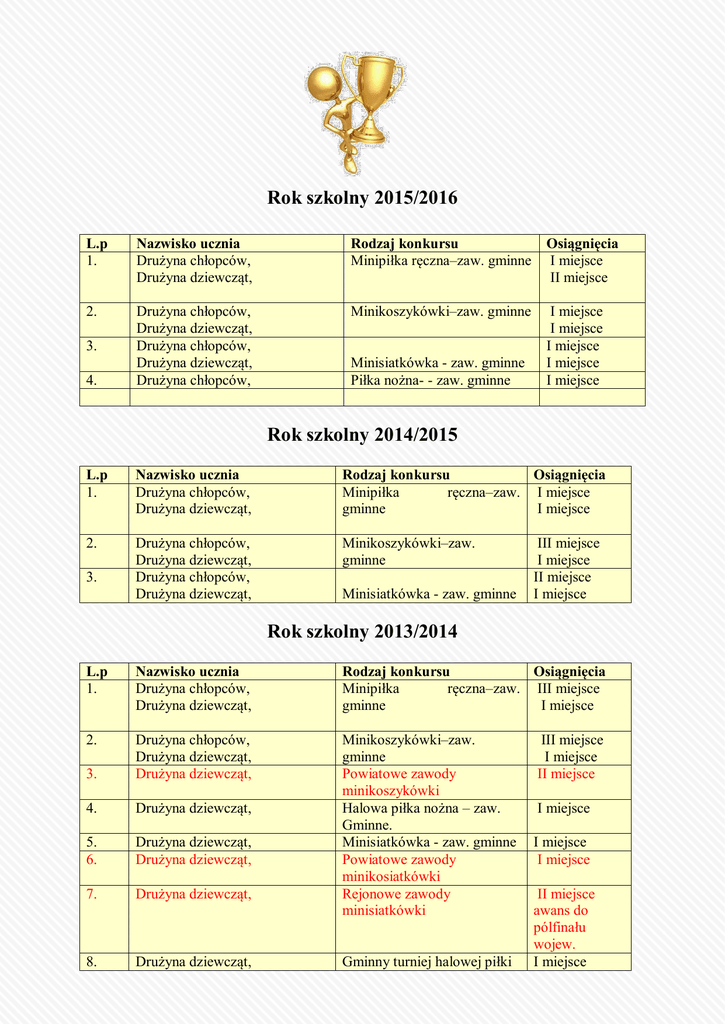 Rok szkolny 2015/2016 L.p 1. Nazwisko ucznia Drużyna chłopców, Drużyna dziewcząt, Rodzaj konkursu Minipiłka ręczna–zaw. gminne Osiągnięcia I miejsce II miejsce 2. Drużyna chłopców, Drużyna dziewcząt, Drużyna chłopców, Drużyna dziewcząt, Drużyna chłopców, Minikoszykówki–zaw. gminne I miejsce I miejsce I miejsce I miejsce I miejsce 3. 4. Minisiatkówka - zaw. gminne Piłka nożna- - zaw. gminne Rok szkolny 2014/2015 L.p 1. Nazwisko ucznia Drużyna chłopców, Drużyna dziewcząt, Rodzaj konkursu Osiągnięcia Minipiłka ręczna–zaw. I miejsce gminne I miejsce 2. Drużyna chłopców, Drużyna dziewcząt, Drużyna chłopców, Drużyna dziewcząt, Minikoszykówki–zaw. gminne 3. Minisiatkówka - zaw. gminne III miejsce I miejsce II miejsce I miejsce Rok szkolny 2013/2014 L.p 1. Nazwisko ucznia Drużyna chłopców, Drużyna dziewcząt, Rodzaj konkursu Osiągnięcia Minipiłka ręczna–zaw. III miejsce gminne I miejsce 2. 3. Drużyna chłopców, Drużyna dziewcząt, Drużyna dziewcząt, 4. Drużyna dziewcząt, 5. 6. Drużyna dziewcząt, Drużyna dziewcząt, 7. Drużyna dziewcząt, Minikoszykówki–zaw. gminne Powiatowe zawody minikoszykówki Halowa piłka nożna – zaw. Gminne. Minisiatkówka - zaw. gminne Powiatowe zawody minikosiatkówki Rejonowe zawody minisiatkówki 8. Drużyna dziewcząt, Gminny turniej halowej piłki III miejsce I miejsce II miejsce I miejsce I miejsce I miejsce II miejsce awans do pólfinału wojew. I miejsce 9. Drużyna dziewcząt, nożnej Półfinałowy turniej minisiatkówki III miejsce Rok szkolny 2012/2013 L.p 1. 2. 3. Nazwisko ucznia Drużyna dziewcząt, Drużyna dziewcząt, Drużyna dziewcząt, 4. Drużyna dziewcząt, Dziewczęta i chłopcy 16 uczestników 5. Drużyna dziewcząt, 4 Chłopcy 5. Dziewczęta Chłopcy Rodzaj konkursu Minipiłka ręczna–zaw. gminne Minikoszykówki–zaw. gminne Minikoszykówki–zaw. powiatowe Minisiatkówka - zaw. gminne Indywidualne biegi przełajowe im I. Łukasiewicza Halowa piłka nożna – zaw. Gminne. Gminny Turniej Ruchu Drogowego Trójbój lekkoatletyczny Osiągnięcia I miejsce I miejsce II miejsce I miejsce I miejsce Paula Wójcik (600 m), III miejsce Aleksandra Nóżka (400 m) IV miejsce DanielGinalski (600 m). Klaudia Wawszczak (400) II miejsce III miejsce drużynowo I miejsce II miejsce Rok szkolny 2011/2012 L.p 1. Nazwisko ucznia Drużyna chłopców, Drużyna dziewcząt, Rodzaj konkursu Minipiłka ręczna–zaw. gminne 2. Drużyna chłopców, Drużyna dziewcząt, Drużyna chłopców, Drużyna dziewcząt, Drużyna chłopców, Dziewczęta i chłopcy 12 uczestników Minikoszykówki–zaw. gminne 3. 4. Osiągnięcia III miejsce I miejsce II miejsce I miejsce Minisiatkówka - zaw. gminne II miejsce II miejsce Piłka nożna 6 osobowa V miejsce Indywidualne biegi przełajowe I miejsce im I. Łukasiewicza Paula Wójcik (600 m), II miejsce Wiktoria Lp 4 Nazwisko ucznia Chłopcy Rodzaj konkursu Gminny Turniej Ruchu Drogowego Leniek (400 m) IV miejsce Patrycja Adamczyk (800 m) Osiągnięcia I miejsce Adrian Dąbrowski II miejsce drużynowo Rok szkolny 2010/2011 Lp Nazwisko ucznia Drużyna chłopców, Drużyna dziewcząt, Rodzaj konkursu Minipiłka ręczna –zaw. gminne Minikoszykówki –zaw. gminne 3. 4. 5. 6. Drużyna chłopców, Drużyna dziewcząt, Drużyna dziewcząt Drużyna dziewcząt Drużyna dziewcząt Drużyna dziewcząt 7. 8. Drużyna dziewcząt Drużyna dziewcząt 1. 2. Osiągnięcia V miejsce I miejsce V miejsce I miejsce Minisiatkówka - zaw. gminne I miejsce Minipiłka ręczna –zaw. powiatowe III miejsce Minikoszykówka–zaw. powiatowe III miejsce Halowa piłka nożna – zawody I miejsce gminne Minisiatkówka – zaw. powiatowe V miejsce Czwórbój lekkoatletyczny – zawody III miejsce gminne Rok szkolny 2009/2010 1 Kurek Patyk, Adamczyk Patrycja, Dąbrowski Adrian, Leniek Patrycja, Ozimina Weronika,Rozmus Damian, Teeninga Oscar, Hejnar Bartosz, Czekaj Agnieszka, Bartosz Krukar, Kamil Dudek,Łukasz Kustroń, Bartosz Ginalski,Natalia Drużba,Ola Pilch, Zborowska Anita Drużyna chłopców, Drużyna dziewcząt, Gminne indywidualne biegi przełajowe miejsca od 6 wzwyż Minipiłka ręczna –zaw. Gminne IV miejsce I miejsce 4 Drużyna chłopców, Drużyna dziewcząt, Drużynowy turniej tenisa stołowego V miejsce III miejsce 5 Drużyna chłopców 6. Drużyna chłopców, Drużyna dziewcząt, Halowy turniej piłki nożnej o Lampę IV miejsce I. Łukasiewicza Minikoszykówki –zaw. gminne I miejsce I miejsce 4 Drużyna chłopców, Drużyna dziewcząt, Minisiatkówka - zaw. Gminne II miejsce II miejsce 5. Drużyna chłopców, Drużyna dziewcząt, Halowy turniej piłki nożnej III miejsce I miejsce 6. 7. Drużyna dziewcząt Dziewczęta i chłopcy 12 uczestników Czwórbój lekkoatletyczny Indywidualne biegi przełajowe im I. Łukasiewicza I miejsce 3 Rok szkolny 2008/2009 Lp Nazwisko ucznia 1 Czekaj Agnieszka, Pęcak Katarzyna, Kondrat Mateusz 2 Pęcak Katarzyna Rodzaj konkursu Gminne indywidualne biegi przełajowe Powiatowe indywidualne biegi przełajowe. Osiągnięcia 1 miejsce zajęła Pęcak Katarzyna, 2 miejsce Czekaj Agnieszka 2 miejsce Kondrat Mateusz awansując do zawodów powiatowych zajęła 4 miejsce 3 Drużyna dziewcząt, Drużyna chłopców, 4 Gminne zawody w czwórboju lekkoatletycznym I miejsce IV miejsce indywidualnie: 2 miejsce Natalia Żychowska, 3 miejsce Natalia Drużba, 2 miejsce Mateusz Kondrat. Indywidualne biegi przełajowe im. Ignacego Łukasiewicza: 1 miejsce Katarzyna Pęcak, 3 miejsce Paulina Pęcak Rok szkolny 2007/2008 Lp Nazwisko ucznia 1 Kubit Aneta, Biały Paweł, Pilch Piotr, Bonczar Kamil, Pęcak Klaudia, Kustroń Łukasz, Pęcak Katarzyna, Wójcik Maciej, Wójcik Aleksandra, Mermon Daniel Rodzaj konkursu Gminne indywidualne biegi przełajowe Osiągnięcia 1 miejsce zajęła Pęcak Katarzyna z kl. IV, awansując do zawodów powiatowych 2 Pęcak Katarzyna Powiatowe indywidualne biegi przełajowe. zajęła 5 miejsce 3 Drużyna chłopców, Drużyna dzie