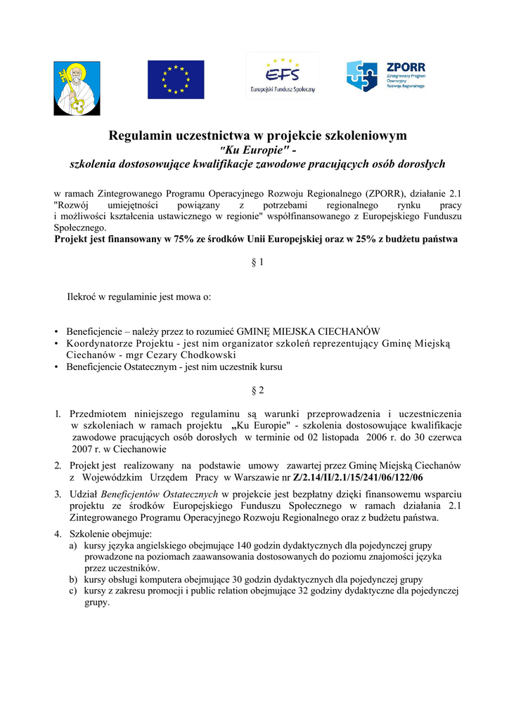 Regulamin uczestnictwa w projekcie szkoleniowym "Ku Europie" - szkolenia dostosowujące kwalifikacje zawodowe pracujących osób dorosłych w ramach Zintegrowanego Programu Operacyjnego Rozwoju Regionalnego (ZPORR), działanie 2.1 "Rozwój umiejętności powiązany z potrzebami regionalnego rynku pracy i możliwości kształcenia ustawicznego w regionie" współfinansowanego z Europejskiego Funduszu Społecznego. Projekt jest finansowany w 75% ze środków Unii Europejskiej oraz w 25% z budżetu państwa §1 Ilekroć w regulaminie jest mowa o: • Beneficjencie – należy przez to rozumieć GMINĘ MIEJSKA CIECHANÓW • Koordynatorze Projektu - jest nim organizator szkoleń reprezentujący Gminę Miejską Ciechanów - mgr Cezary Chodkowski • Beneficjencie Ostatecznym - jest nim uczestnik kursu §2 1. Przedmiotem niniejszego regulaminu są warunki przeprowadzenia i uczestniczenia w szkoleniach w ramach projektu „Ku Europie" - szkolenia dostosowujące kwalifikacje zawodowe pracujących osób dorosłych w terminie od 02 listopada 2006 r. do 30 czerwca 2007 r. w Ciechanowie 2. Projekt jest realizowany na podstawie umowy zawartej przez Gminę Miejską Ciechanów z Wojewódzkim Urzędem Pracy w Warszawie nr Z/2.14/II/2.1/15/241/06/122/06 3. Udział Beneficjentów Ostatecznych w projekcie jest bezpłatny dzięki finansowemu wsparciu projektu ze środków Europejskiego Funduszu Społecznego w ramach działania 2.1 Zintegrowanego Programu Operacyjnego Rozwoju Regionalnego oraz z budżetu państwa. 4. Szkolenie obejmuje: a) kursy języka angielskiego obejmujące 140 godzin dydaktycznych dla pojedynczej grupy prowadzone na poziomach zaawansowania dostosowanych do poziomu znajomości języka przez uczestników. b) kursy obsługi komputera obejmujące 30 godzin dydaktycznych dla pojedynczej grupy c) kursy z zakresu promocji i public relation obejmujące 32 godziny dydaktyczne dla pojedynczej grupy. §3 1. Beneficjentem Ostatecznym może być osoba, która:: a) w chwili dokonania zgłoszenia do udziału w projekcie oraz w dniu podpisania niniejszej umowy był/a i jest zatrudniony/a na umowę o pracę; b) w chwili dokonania zgłoszenia do udziału w projekcie oraz w dniu podpisania niniejszej umowy posiadał/a zameldowanie stałe lub czasowe na terenie Gminy Miejskiej Ciechanów i Gminy Ciechanów; c) posiada wykształcenie co najmniej podstawowe lub gimnazjalne; d) zgłasza z własnej inicjatywy chęć podwyższania lub dostosowywania kwalifikacji zawodowych do potrzeb rynku pracy poza godzinami pracy; przez co spełnia wymogi formalne udziału w projekcie "Ku Europie" - szkolenia dostosowujące kwalifikacje zawodowe pracujących osób dorosłych realizowanym przez Gminę Miejską Ciechanów. 2. Beneficjent Ostateczny jest zobowiązany, w celu udokumentowania spełnienia wymogów formalnych do złożenia następujących dokumentów: a) kserokopię dowodu osobistego; b) zaświadczenie o zameldowaniu, o ile w kserokopii dowodu osobistego brak jest adnotacji o zameldowaniu na terenie Gminy Miejskiej Ciechanów; c) zaświadczenie o zatrudnieniu; d) kserokopię dyplomu/świadectwa określającego poziom wykształcenia lub wypełnione oświadczenie o wykształceniu; e) wypełnioną wstępną deklarację uczestnictwa, zawierającą dane przekazywane do podsystemu monitorowania PEFS. Złożone dokumenty nie podlegają zwrotowi. Z uwagi na konieczność osiągnięcia przez Beneficjenta ( Gminę Miejską Ciechanów) założonych we wniosku wskaźników, Beneficjent zastrzega sobie prawo do podejmowania ostatecznej decyzji w sprawie ustalenia listy słuchaczy przyjętych do poszczególnych grup szkoleniowych. §4 1. Koordynator Projektu zobowiązany jest do: a) opracowania przebiegu szkolenia; b) zapewnienia odpowiedniego zaplecza lokalowego i technicznego, niezbędnego do realizacji projektu; c) zapewnienia wykwalifikowanej kadry dydaktycznej; d) przeprowadzenia szkolenia w liczbie godzin określonych w § 2 pkt 4; e) opracowania i udostępnienia nieodpłatnie materiałów szkoleniowych (w tym podręczników) uczestnikom szkolenia; f) zorganizowania egzaminu końcowego TELC, sprawdzającego stopień opanowania języka angielskiego; g) wydania stosownych dokumentów potwierdzających uczestnictwo w kursie obsługi komputera oraz promocji i public relations. 2. Wykonawca zobowiązuje się dołożyć wszelkich starań w zakresie przeprowadzenia szkolenia, będącego przedmiotem niniejszej umowy. 3. Koordynator Projektu zapewnia zorganizowanie grup dydaktycznych adekwatnych do stopnia znajomości języka przez Beneficjenta Ostatecznego, określonego na podstawie wyniku testu kwalifikacyjnego. §5 1. Beneficjent Ostateczny zobowiązuje się do: a) uczestniczenia we wszystkich zajęciach w czasie trwania szkolenia, potwierdzonego własnoręcznym podpisem na liście obecności; b) przystąpienia do egzaminu końcowego TELC; c) wypełnienia w trakcie trwania projektu ankiet ewaluacyjnych oraz ankiet uzupełniających ( dane przekazywane do podsystemu monitorowania PEFS); d) informowania Koordynatora Projektu w okresie 6 miesięcy od zakończenia kursu o ewentualnych zmianach w stanie zatrudnienia oraz swoim statusie na rynku pracy. 2. Beneficjenci Ostateczni mają prawo do pięciu nieobecności w czasie trwania szkolenia językowego, dwóch nieobecności w przypadku pozostałych szkoleń. Większa liczba nieobecności spowoduje skreślenie z listy uczestnictwa. 3. Nieobecności będę usprawiedliwiane w przypadku: a) przedstawienia zwolnienia lekarskiego; b) wyjazdu na delegację i przedstawienia odpowiedniego dokumentu poświadczającego; 4. W pozostałych przypadkach usprawiedliwienia nieobecności Koordynator Projektu będzie rozpatrywał indywidualnie. 5. Kopie dokumentów poświadczające nieobecność usprawiedliwioną wymienione w punkcie 3 muszą być dostarczone przez Beneficjenta Ostatecznego w terminie do 14 dni od daty zaistnienia zdarzenia. 6. W przypadku rezygnacji z uczestnictwa w kursach po podpisa