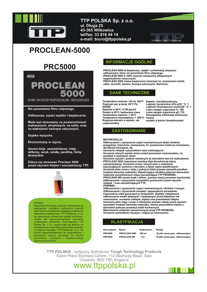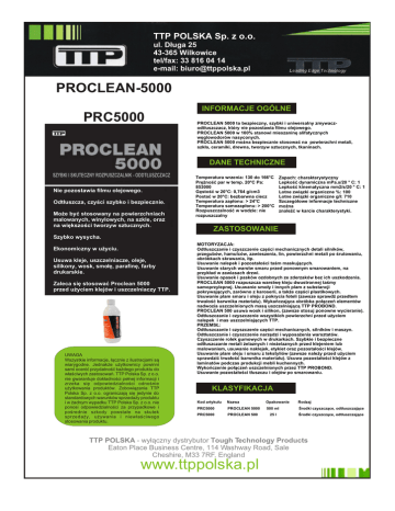 TTP POLSKA Sp. z o.o. ul. D³uga 25 43-365 Wilkowice tel/fax: 33 816 04 14 e-mail: [email protected] PROCLEAN-5000 PRC5000 INFORMACJE OGÓLNE PROCLEAN 5000 to bezpieczny, szybki i uniwersalny zmywaczodt³uszczacz, który nie pozostawia filmu olejowego. PROCLEAN 5000 w 100% stanowi mieszaninê alifatycznych wêglowodorów nasyconych. PROCLEAN 5000 mo¿na bezpiecznie stosowaæ na powierzchni metali, szk³a, ceramiki, drewna, tworzyw sztucznych, tkaninach. DANE TECHNICZNE SUPERSZYBKI KLEJ SZYBKI I SKUTECZNY ROZPUSZCZALNIK - ODDT£USZCZACZ Nie pozostawia filmu olejowego. Odt³uszcza, czyœci szybko i bezpiecznie. Mo¿e byæ stosowany na powierzchniach malowanych, winylowych, na szkle, oraz na wiêkszoœci tworzyw sztucznych. Temperatura wrzenia: 130 do 166°C Prê¿noœæ par w temp. 20°C Pa: 853000 Gêstoœæ w 20°C: 0,764 g/cm3 Postaæ w 20°C: bezbarwna ciecz Temperatura zap³onu: > 24°C Temperatura samozap³onu: > 200°C Rozpuszczalnoœæ w wodzie: nie rozpuszczalny Zapach: charakterystyczny Lepkoœæ dynamiczna mPa.s/20 ° C: 1 Lepkoœæ kinematyczna mm2/s/20 ° C: 1 Lotne zwi¹zki organiczne %: 100 Lotne zwi¹zki organiczne g/l: 710 Szczegó³owe informacje techniczne mo¿na znaleŸæ w karcie charakterystyki. ZASTOSOWANIE Szybko wysycha. Ekonomiczny w u¿yciu. Usuwa kleje, uszczelniacze, oleje, silikony, wosk, smo³ê, parafinê, farby drukarskie. Zaleca siê stosowaæ Proclean 5000 przed u¿yciem klejów i uszczelniaczy TTP. UWAGA Wszystkie informacje, ³¹cznie z ilustracjami s¹ wiarygodne. Jednak¿e u¿ytkownicy powinni sami oceniæ przydatnoœæ ka¿dego produktu do w³aœciwych zastosowañ. TTP Polska Sp. z o.o. nie gwarantuje dok³adnoœci pe³nej informacji i zrzeka siê odpowiedzialnoœci odnoœnie u¿ytkowania produktów. Zobowi¹zania TTP Polska Sp. z o.o. ograniczaj¹ siê jedynie do standardowych warunków sprzeda¿y produktu i w ¿adnym wypadku TTP Polska Sp. z o.o. nie ponosi odpowiedzialnoœci za przypadkowe i poœrednie szkody powsta³e na skutek sprzeda¿y, u¿ywania i niew³aœciwego stosowania produktu. MOTORYZACJA: Odt³uszczanie i czyszczenie czêœci mechanicznych detali silników, przegubów, hamulców, zawieszenia, lin, powierzchni metali po œrutowaniu, obróbkach skrawania, itp. Usuwanie nalepek i pozosta³oœci taœm maskuj¹cych. Usuwanie starych warstw smaru przed ponownym smarowaniem, na przyk³ad w zawiasach drzwi. Usuwanie opasek i pasków ozdobnych ze zderzaków bez ich uszkodzenia. PROCLEAN 5000 rozpuszcza warstwê kleju dwustronnej taœmy samoprzylepnej. Usuwanie smo³y i innych plam z substancji pokrywaj¹cych, zarówno z karoserii, a tak¿e czêœci plastikowych. Usuwanie plam smaru i oleju z pokrycia foteli (zawsze sprawdŸ przedtem trwa³oœæ barwnika materia³u). Wykañczaj¹ca obróbka po³¹czeñ elementów nadwozia uszczelnionych mas¹ uszczelniaj¹c¹ TTP PROBOND. PROCLEAN 500 usuwa wosk i silikon, (zawsze stosuj ponowne wycieranie). Odt³uszczanie i czyszczenie wszystkich powierzchni przed u¿yciem nalepek i mas uszczelniaj¹cych TTP. PRZEMS£: Odt³uszczanie i czyszczenie czêœci mechanicznych, silników i maszyn. Odt³uszczanie i czyszczenie narzêdzi i wyposa¿enia warsztatów. Czyszczenie rolek gumowych w drukarkach. Szybkie i bezpieczne odt³uszczanie metali ¿elaznych i nie¿elaznych przed klejeniem lub malowaniem, usuwanie naklejek, etykiet oraz pozosta³oœci klejów. Usuwanie plam oleju i smaru z tekstyliów (zawsze nale¿y przed u¿yciem sprawdziæ trwa³oœæ barwnika materia³u). Usuwa pozosta³oœci klejów z laminatów podczas produkcji mebli kuchennych. Wykoñczenie po³¹czeñ uszczelnionych przez TTP PROBOND. Usuwanie pozosta³oœci t³uszczu i olejów po smarowaniu. KLASYFIKACJA Kod artyku³u Nazwa Opakowanie PRC5000 PROCLEAN 5000 500 ml Rodzaj Œrodki czyszcz¹ce, odt³uszczaj¹ce PRC5000 PROCLEAN 500 25 l Œrodki czyszcz¹ce, odt³uszczaj¹ce TTP POLSKA - wy³¹czny dystrybutor Tough Technology Products Eaton Place Business Centre, 114 Washway Road, Sale Cheshire, M33 7RF, England www.ttppolska.pl