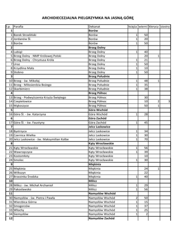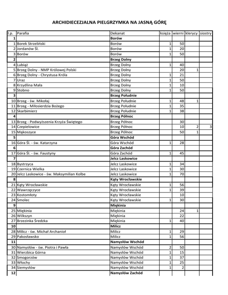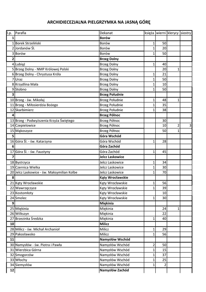 ARCHIDIECEZJALNA PIELGRZYMKA NA JASNĄ GÓRĘ l.p. Parafia 1 1 Borek Strzeliński 2 Jordanów Śl. 3 Borów 2 4 Lubiąż 5 Brzeg Dolny - NMP Królowej Polski 6 Brzeg Dolny - Chrystusa Króla 7 Uraz 8 Krzydlina Mała 9 Stobno 3 10 Brzeg - św. Mikołaj 11 Brzeg - Miłosierdzia Bożego 12 Skarbimierz 4 13 Brzeg - Podwyższenia Krzyża Świętego 14 Czepielowice 15 Mąkoszyce 5 16 Góra Śl. - św. Katarzyna 6 17 Góra Śl. - św. Faustyny 7 18 Bystrzyca 19 Czernica Wielka 20 Jelcz Laskowice - św. Maksymilian Kolbe 8 21 Kąty Wrocławskie 22 Wawrzęczyce 23 Kostomłoty 24 Smolec 9 25 Miękinia 26 Wilkszyn 27 Brzezinka Średzka 10 28 Milicz - św. Michał Archanioł 29 Pakosławsko 11 30 Namysłów - św. Piotra i Pawła 31 Wierzbica Górna 32 Smogorzów 33 Włochy 34 Siemysłów 12 Dekanat Borów Borów Borów Borów Brzeg Dolny Brzeg Dolny Brzeg Dolny Brzeg Dolny Brzeg Dolny Brzeg Dolny Brzeg Dolny Brzeg Południe Brzeg Południe Brzeg Południe Brzeg Południe Brzeg Północ Brzeg Północ Brzeg Północ Brzeg Północ Góra Wschód Góra Wschód Góra Zachód Góra Zachód Jelcz Laskowice Jelcz Laskowice Jelcz Laskowice Jelcz Laskowice Kąty Wrocławskie Kąty Wrocławskie Kąty Wrocławskie Kąty Wrocławskie Kąty Wrocławskie Miękinia Miękinia Miękinia Miękinia Milicz Milicz Milicz Namysłów Wschód Namysłów Wschód Namysłów Wschód Namysłów Wschód Namysłów Wschód Namysłów Wschód Namysłów Zachód księża wierni klerycy siostry 1 1 1 50 20 50 1 1 1 1 1 40 20 21 50 10 50 1 1 1 48 35 38 30 10 50 1 28 1 45 1 1 1 34 30 70 1 1 1 56 39 10 30 1 24 22 40 1 1 29 56 2 1 1 1 1 50 15 37 25 2 1 1 2 1 1 3 35 13 36 37 14 38 39 40 41 15 42 43 44 45 46 16 47 48 49 50 51 52 53 17 54 55 56 57 18 58 19 59 60 61 20 62 63 64 65 21 66 67 68 69 22 70 71 72 73 Namysłów - św. Franciszka i św. Piotra z Ankantary Bierutów Oleśnica - NMP Matki Miłosierdzia Januszkowice Brzezia Łąka Oleśnica - św. Jana Apostoła i Ewangelisty Długołęka Oława - NMP Matki Pocieszenia Domaniów Wierzbno Oława Miłosierdzie Boże Marcinkowice Barłowo Strupina Prusice Pęgów Oborniki Śląskie - NSPJ Oborniki Śląskie - sw. Judy Tadeusza i św. An Radziąc Nasłowice Kierzbice Sobótka - św. Jakub Apostoł Rogów Sobócki Strzelin Podwyższenia Krzyża Świętego Środa Śląska- Podwyższenia Krzyża Świętego Wilczków Malczyce Trzebnica - św. Bartłomieja Ap. I św. Jadwigi Trzebnica - św. Piotra i Pawła Wyskoki Kościoł Zawonia Jutrzyna Brożec Wiązów Jaworów Krzelów Wińsko Smogorzów Wielki Głębowice Namysłów Zachód Oleśnica Wschód Oleśnica Wschód Oleśnica Wschód Oleśnica Zachód Oleśnica Zachód Oleśnica Zachód Oleśnica Zachód Oleśnica Zachód Oława Oława Oława Oława Oława Oława Prusice Prusice Prusice Prusice Prusice Prusice Prusice Prusice Sobótka Sobótka Sobótka Sobótka Sobótka Strzelin Strzelin Środa Śląska Środa Śląska Środa Śląska Środa Śląska Trzebnica Trzebnica Trzebnica Trzebnica Trzebnica Wiązów Wiązów Wiązów Wiązów Wiązów Wołów Wołów Wołów Wołów Wołów 30 1 2 52 57 1 1 1 1 5 56 50 20 1 1 1 50 40 10 52 49 1 1 2 1 1 1 1 40 50 8 35 17 31 10 1 1 1 1 68 30 96 33 1 56 1 1 1 32 30 25 1 1 1 20 15 15 56 1 1 1 1 18 44 54 50 1 1 1 1 65 40 40 15 1 1 1 1 23 74 75 76 24 77 78 25 79 26 80 81 82 27 83 84 85 86 87 28 88 89 90 29 91 92 93 94 95 96 30 97 98 99 31 100 101 102 103 32 104 105 106 107 108 33 109 110 św. Bonifacy św. Jan Chrzcieiel - Katedra Najświętszego Imienia Jezus św. Karola Boromeusza św. Maurycy Tynicec Mały Najświętrzego Zbawiciela św. Stanisława Kostki św. Franciszek z Asyżu NMP Bolesnej Odkupiciela Świata św. Teresa od Dzieciątka Jezus Szewce - św. Anny Wrocław Świniary - św. Jadwiga św. Rodzina św. Małgorzaty św. Faustyna św. Jan Apostoł - Wrocław Zakrzów św. Kazimierza Kiełczów Najświętszego Serca Pana Jezusa św. Jakuba i Krzysztofa Mirków Siechnice - Niepokalanego Serca NMP Jagodno Radwanice św. Jadwiga św. Andrzeja Boboli św. Andrzeja Apostoła NMP Matki Boże Różańcowej św. Wawrzyniec - Wrocław Żerniki Najświętszej Maryi Panny Królowej Pokoju św. Michała Archanioła NMP Nieustającej Pomocy Macierzyńska NMP Ciepłowody Ziębice - św. Jerzego Wrocław - Katedra Wrocław - Katedra Wrocław - Katedra Wrocław - Katedra Wrocław - Śródmieście Wrocław - Śródmieście Wrocław - Śródmieście Wrocław Krzyki Wrocław Krzyki Wrocław Południe Wrocław Południe Wrocław Południe Wrocław Południe Wrocław Północ I Wrocław Północ I Wrocław Północ I Wrocław Północ I Wrocław Północ I Wrocław Północ I Wrocław Północ II Wrocław Północ II Wrocław Północ II Wrocław Północ II Wrocław Północ III Wrocław Północ III Wrocław Północ III Wrocław Północ III Wrocław Północ III Wrocław Północ III Wrocław Północ III Wrocław Wschód Wrocław Wschód Wrocław Wschód Wrocław Wschód Wrocław Zachód (Leśnica) Wrocław Zachód (Leśnica) Wrocław Zachód (Leśnica) Wrocław Zachód (Leśnica) Wrocław Zachód (Leśnica) Wrocław Zachód I Kozanów Wrocław Zachód I Wrocław Zachód I Wrocław Zachód I Wrocław Zachód I Wrocław Zachód I Ziębice Ziębice Ziębice 1 3 1 30 48 35 1 1 2 45 1 9 1 1 1 14 17 52 1 1 1 14 47 35 18 34 1 1 40 24 50 1 1 1 1 1 1 40 27 24 45 50 30 1 3 1 48 47 14 1 1 2 1 150 53 46 50 1 1 1 30 48 50 24 14 1 1 27 42 3 1 1 2 2 2 Księżą Wierni Klerycy Siostry zakonne 30 nowych parafii względem ubiegłego roku 17 parafii obecnych w 2015, a nieobecnych w 2016 102 4001 19 5