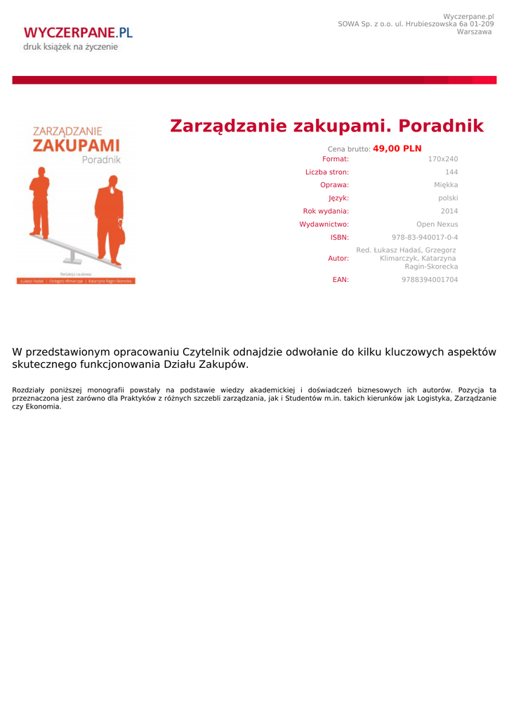 Wyczerpane.pl SOWA Sp. z o.o. ul. Hrubieszowska 6a 01-209 Warszawa Zarządzanie zakupami. Poradnik Cena brutto: Format: 49,00 PLN 170x240 Liczba stron: 144 Oprawa: Miękka Język: polski Rok wydania: 2014 Wydawnictwo: Open Nexus ISBN: 978-83-940017-0-4 Autor: Red. Łukasz Hadaś, Grzegorz Klimarczyk, Katarzyna Ragin-Skorecka EAN: 9788394001704 W przedstawionym opracowaniu Czytelnik odnajdzie odwołanie do kilku kluczowych aspektów skutecznego funkcjonowania Działu Zakupów. Rozdziały poniższej monografii powstały na podstawie wiedzy akademickiej i doświadczeń biznesowych ich autorów. Pozycja ta przeznaczona jest zarówno dla Praktyków z różnych szczebli zarządzania, jak i Studentów m.in. takich kierunków jak Logistyka, Zarządzanie czy Ekonomia.