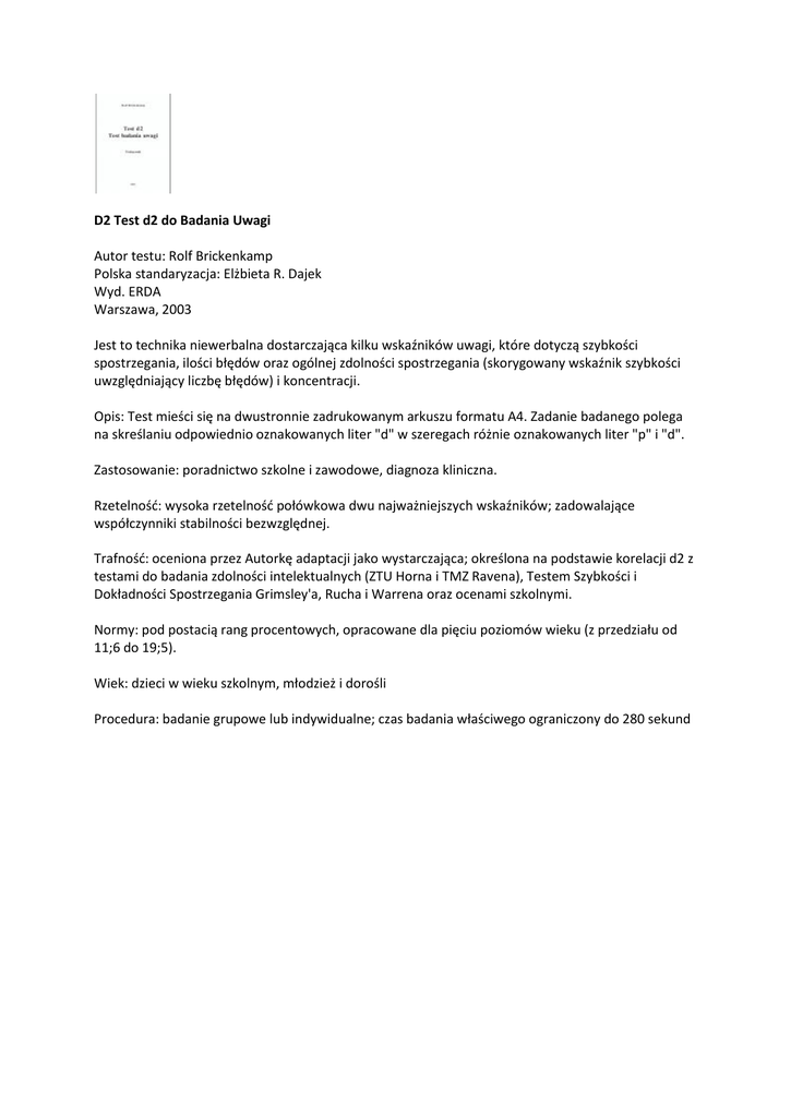 D2 Test d2 do Badania Uwagi Autor testu: Rolf Brickenkamp Polska standaryzacja: Elżbieta R. Dajek Wyd. ERDA Warszawa, 2003 Jest to technika niewerbalna dostarczająca kilku wskaźników uwagi, które dotyczą szybkości spostrzegania, ilości błędów oraz ogólnej zdolności spostrzegania (skorygowany wskaźnik szybkości uwzględniający liczbę błędów) i koncentracji. Opis: Test mieści się na dwustronnie zadrukowanym arkuszu formatu A4. Zadanie badanego polega na skreślaniu odpowiednio oznakowanych liter "d" w szeregach różnie oznakowanych liter "p" i "d". Zastosowanie: poradnictwo szkolne i zawodowe, diagnoza kliniczna. Rzetelność: wysoka rzetelność połówkowa dwu najważniejszych wskaźników; zadowalające współczynniki stabilności bezwzględnej. Trafność: oceniona przez Autorkę adaptacji jako wystarczająca; określona na podstawie korelacji d2 z testami do badania zdolności intelektualnych (ZTU Horna i TMZ Ravena), Testem Szybkości i Dokładności Spostrzegania Grimsley'a, Rucha i Warrena oraz ocenami szkolnymi. Normy: pod postacią rang procentowych, opracowane dla pięciu poziomów wieku (z przedziału od 11;6 do 19;5). Wiek: dzieci w wieku szkolnym, młodzież i dorośli Procedura: badanie grupowe lub indywidualne; czas badania właściwego ograniczony do 280 sekund