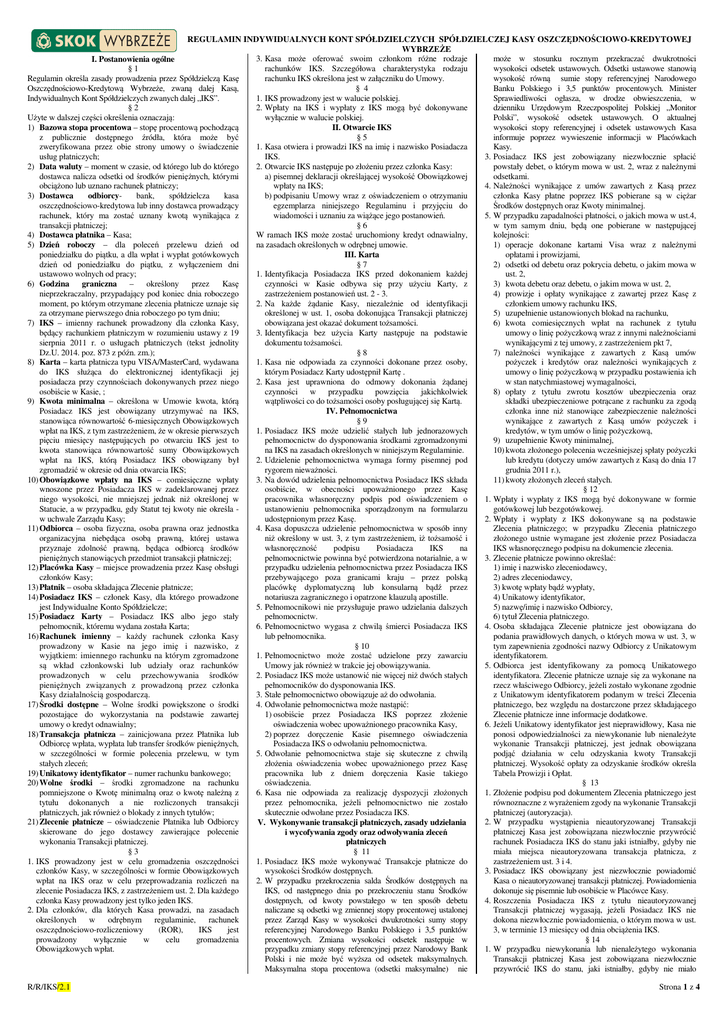 REGULAMIN INDYWIDUALNYCH KONT SPÓŁDZIELCZYCH SPÓŁDZIELCZEJ KASY OSZCZĘDNOŚCIOWO-KREDYTOWEJ WYBRZEŻE 3. Kasa może oferować swoim członkom różne rodzaje może w stosunku rocznym przekraczać dwukrotności I. Postanowienia ogólne §1 rachunków IKS. Szczegółowa charakterystyka rodzaju wysokości odsetek ustawowych. Odsetki ustawowe stanowią Regulamin określa zasady prowadzenia przez Spółdzielczą Kasę rachunku IKS określona jest w załączniku do Umowy. wysokość równą sumie stopy referencyjnej Narodowego Oszczędnościowo-Kredytową Wybrzeże, zwaną dalej Kasą, § 4 Banku Polskiego i 3,5 punktów procentowych. Minister Indywidualnych Kont Spółdzielczych zwanych dalej „IKS”. 1. IKS prowadzony jest w walucie polskiej. Sprawiedliwości ogłasza, w drodze obwieszczenia, w §2 2. Wpłaty na IKS i wypłaty z IKS mogą być dokonywane dzienniku Urzędowym Rzeczpospolitej Polskiej „Monitor Użyte w dalszej części określenia oznaczają: wyłącznie w walucie polskiej. Polski”, wysokość odsetek ustawowych. O aktualnej 1) Bazowa stopa procentowa – stopę procentową pochodzącą wysokości stopy referencyjnej i odsetek ustawowych Kasa II. Otwarcie IKS z publicznie dostępnego źródła, która może być §5 informuje poprzez wywieszenie informacji w Placówkach zweryfikowana przez obie strony umowy o świadczenie 1. Kasa otwiera i prowadzi IKS na imię i nazwisko Posiadacza Kasy. usług płatniczych; IKS. 3. Posiadacz IKS jest zobowiązany niezwłocznie spłacić 2) Data waluty – moment w czasie, od którego lub do którego 2. Otwarcie IKS następuje po złożeniu przez członka Kasy: powstały debet, o którym mowa w ust. 2, wraz z należnymi dostawca nalicza odsetki od środków pieniężnych, którymi a) pisemnej deklaracji określającej wysokość Obowiązkowej odsetkami. obciążono lub uznano rachunek płatniczy; wpłaty na IKS; 4. Należności wynikające z umów zawartych z Kasą przez 3) Dostawca odbiorcybank, spółdzielcza kasa b) podpisaniu Umowy wraz z oświadczeniem o otrzymaniu członka Kasy płatne poprzez IKS pobierane są w ciężar oszczędnościowo-kredytowa lub inny dostawca prowadzący egzemplarza niniejszego Regulaminu i przyjęciu do Środków dostępnych oraz Kwoty minimalnej. rachunek, który ma zostać uznany kwotą wynikająca z wiadomości i uznaniu za wiążące jego postanowień. 5. W przypadku zapadalności płatności, o jakich mowa w ust.4, transakcji płatniczej; §6 w tym samym dniu, będą one pobierane w następującej 4) Dostawca płatnika – Kasa; W ramach IKS może zostać uruchomiony kredyt odnawialny, kolejności: 5) Dzień roboczy – dla poleceń przelewu dzień od na zasadach określonych w odrębnej umowie. 1) operacje dokonane kartami Visa wraz z należnymi poniedziałku do piątku, a dla wpłat i wypłat gotówkowych opłatami i prowizjami, III. Karta dzień od poniedziałku do piątku, z wyłączeniem dni §7 2) odsetki od debetu oraz pokrycia debetu, o jakim mowa w ustawowo wolnych od pracy; 1. Identyfikacja Posiadacza IKS przed dokonaniem każdej ust. 2, 6) Godzina graniczna – określony przez Kasę czynności w Kasie odbywa się przy użyciu Karty, z 3) kwota debetu oraz debetu, o jakim mowa w ust. 2, nieprzekraczalny, przypadający pod koniec dnia roboczego zastrzeżeniem postanowień ust. 2 - 3. 4) prowizje i opłaty wynikające z zawartej przez Kasę z moment, po którym otrzymane zlecenia płatnicze uznaje się 2. Na każde żądanie Kasy, niezależnie od identyfikacji członkiem umowy rachunku IKS, za otrzymane pierwszego dnia roboczego po tym dniu; określonej w ust. 1, osoba dokonująca Transakcji płatniczej 5) uzupełnienie ustanowionych blokad na rachunku, 7) IKS – imienny rachunek prowadzony dla członka Kasy, obowiązana jest okazać dokument tożsamości. 6) kwota comiesięcznych wpłat na rachunek z tytułu będący rachunkiem płatniczym w rozumieniu ustawy z 19 3. Identyfikacja bez użycia Karty następuje na podstawie umowy o linię pożyczkową wraz z innymi należnościami sierpnia 2011 r. o usługach płatniczych (tekst jednolity dokumentu tożsamości. wynikającymi z tej umowy, z zastrzeżeniem pkt 7, Dz.U. 2014. poz. 873 z późn. zm.); §8 7) należności wynikające z zawartych z Kasą umów 8) Karta – karta płatnicza typu VISA/MasterCard, wydawana 1. Kasa nie odpowiada za czynności dokonane przez osoby, pożyczek i kredytów oraz należności wynikających z do IKS służąca do elektronicznej identyfikacji jej którym Posiadacz Karty udostępnił Kartę . umowy o linię pożyczkową w przypadku postawienia ich posiadacza przy czynnościach dokonywanych przez niego 2. Kasa jest uprawniona do odmowy dokonania żądanej w stan natychmiastowej wymagalności, osobiście w Kasie, ; czynności w przypadku powzięcia jakichkolwiek 8) opłaty z tytułu zwrotu kosztów ubezpieczenia oraz 9) Kwota minimalna – określona w Umowie kwota, którą wątpliwości co do tożsamości osoby posługującej się Kartą. składki ubezpieczeniowe potrącane z rachunku za zgodą Posiadacz IKS jest obowiązany utrzymywać na IKS, członka inne niż stanowiące zabezpieczenie należności IV. Pełnomocnictwa stanowiąca równowartość 6-miesięcznych Obowiązkowych §9 wynikające z zawartych z Kasą umów pożyczek i wpłat na IKS, z tym zastrzeżeniem, że w okresie pierwszych 1. Posiadacz IKS może udzielić stałych lub jednorazowych kredytów, w tym umów o linię pożyczkową, pięciu miesięcy następujących po otwarciu IKS jest to pełnomocnictw do dysponowania środkami zgromadzonymi 9) uzupełnienie Kwoty minimalnej, kwota stanowiąca równowartość sumy Obowiązkowych na IKS na zasadach określonych w niniejszym Regulaminie. 10) kwota złożonego polecenia wcześniejszej spłaty pożyczki wpłat na IKS, którą Posiadacz IKS obowiązany był 2. Udzielenie pełnomocnictwa wymaga formy pisemnej pod lub kredytu (dotyczy umów zawartych z Kasą do dnia 17 zgromadzić w okresie od d