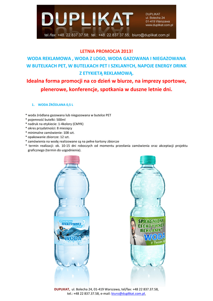 LETNIA PROMOCJA 2013! WODA REKLAMOWA , WODA Z LOGO, WODA GAZOWANA I NIEGAZOWANA W BUTELKACH PET, W BUTELKACH PET I SZKLANYCH, NAPOJE ENERGY DRINK Z ETYKIETĄ REKLAMOWĄ. Idealna forma promocji na co dzień w biurze, na imprezy sportowe, plenerowe, konferencje, spotkania w duszne letnie dni. 1. WODA ŹRÓDLANA 0,5 L * woda źródlana gazowana lub niegazowana w butelce PET * pojemność butelki: 500ml * nadruk na etykiecie: 1-4kolory (CMYK) * okres przydatności: 8 miesięcy * minimalne zamówienie: 108 szt. * opakowanie zbiorcze: 12 szt. * zamówienia na wodę realizowane są na pełne kartony zbiorcze * termin realizacji: ok. 10-15 dni roboczych od momentu przesłania zamówienia oraz akceptacji projektu graficznego (termin do uzgodnienia). DUPLIKAT, ul. Bolecha 24, 01-419 Warszawa, tel/fax: +48 22 837.37.58, tel.: +48 22 837.37.58, e-mail: [email protected]. 2. Woda 0,33 l Butelka: szkło Zawartość: woda gazowana lub niegazowana Pojemność: 0,33 l Znakowanie: etykieta z nadrukiem reklamowym Okres przydatności: 24 miesiące Minimalne zamówienie: 250 szt. ‘ DUPLIKAT, ul. Bolecha 24, 01-419 Warszawa, tel/fax: +48 22 837.37.58, tel.: +48 22 837.37.58, e-mail: [email protected]. 3. Woda 0,3 l Butelka: szkło Zawartość: woda gazowana lub niegazowana Pojemność: 0,3 l Znakowanie: etykieta z nadrukiem reklamowym Okres przydatności: 24 miesiące Minimalne zamówienie: 250 szt. DUPLIKAT, ul. Bolecha 24, 01-419 Warszawa, tel/fax: +48 22 837.37.58, tel.: +48 22 837.37.58, e-mail: [email protected]. 4. ENERGY DRINK Z ETYKIETĄ produkt: gazowany napój energetyzujący, nadruk reklamowy umieszczony na etykiecie wymiary produktu: Ø 53 x 133 mm wymiary etykiety: 121 x 171 mm pojemność: 250 ml okres przydatności: 12 miesięcy minimalne zamówienie: 240 szt. ZAPRASZAMY DO SKŁADANIA ZAPYTAŃ! DUPLIKAT, ul. Bolecha 24, 01-419 Warszawa, tel/fax: +48 22 837.37.58, tel.: +48 22 837.37.58, e-mail: [email protected].