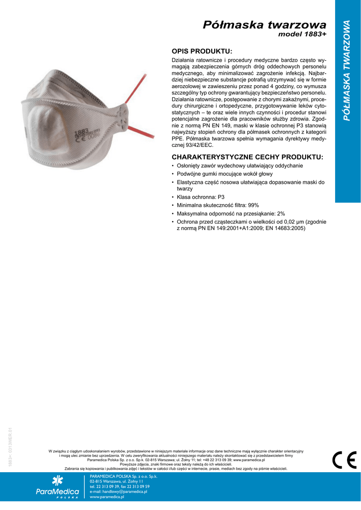model 1883+ OPIS PRODUKTU: Działania ratownicze i procedury medyczne bardzo często wymagają zabezpieczenia górnych dróg oddechowych personelu medycznego, aby minimalizować zagrożenie infekcją. Najbardziej niebezpieczne substancje potrafią utrzymywać się w formie aerozolowej w zawieszeniu przez ponad 4 godziny, co wymusza szczególny typ ochrony gwarantujący bezpieczeństwo personelu. Działania ratownicze, postępowanie z chorymi zakaźnymi, procedury chirurgiczne i ortopedyczne, przygotowywanie leków cytostatycznych – te oraz wiele innych czynności i procedur stanowi potencjalne zagrożenie dla pracowników służby zdrowia. Zgodnie z normą PN EN 149, maski w klasie ochronnej P3 stanowią najwyższy stopień ochrony dla półmasek ochronnych z kategorii PPE. Półmaska twarzowa spełnia wymagania dyrektywy medy cznej 93/42/EEC. CHARAKTERYSTYCZNE CECHY PRODUKTU: • Osłonięty zawór wydechowy ułatwiający oddychanie • Podwójne gumki mocujące wokół głowy • Elastyczna część nosowa ułatwiająca dopasowanie maski do twarzy • Klasa ochronna: P3 • Minimalna skuteczność filtra: 99% • Maksymalna odporność na przesiąkanie: 2% 1883+: 0313WER.01 • Ochrona przed cząsteczkami o wielkości od 0,02 µm (zgodnie z normą PN EN 149:2001+A1:2009; EN 14683:2005) W związku z ciągłym udoskonalaniem wyrobów, przedstawione w niniejszym materiale informacje oraz dane techniczne mają wyłącznie charakter orientacyjny i mogą ulec zmianie bez uprzedzenia. W celu zweryfikowania aktualności niniejszego materiału należy skontaktować się z przedstawicielem firmy Paramedica Polska Sp. z o.o. Sp.k. 02-815 Warszawa; ul. Żołny 11; tel: +48 22 313 09 39; www.paramedica.pl Powyższe zdjęcia, znaki firmowe oraz teksty należą do ich właścicieli. Zabrania się kopiowania i publikowania zdjęć i tekstów w całości i/lub części w internecie, prasie, mediach bez zgody na piśmie właścicieli. PARAMEDICA POLSKA Sp. z o.o. Sp.k. 02-815 Warszawa, ul. Żołny 11 tel. 22 313 09 39, fax 22 313 09 59 e-mail: [email protected] www.paramedica.pl PÓŁMASKA TWARZOWA Półmaska twarzowa