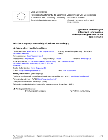 Unia Europejska Publikacja Suplementu do Dziennika Urzędowego Unii Europejskiej 2, rue Mercier, 2985 Luxembourg, Luksemburg Faks: +352 29 29 42 670 E-mail: [email protected] Informacje i formularze on-line: http:// simap.europa.eu Ogłoszenie dodatkowych informacji, informacje o niekompletnej procedurze lub sprostowanie Sekcja I: Instytucja zamawiająca/podmiot zamawiający I.1) Nazwa, adresy i punkty kontaktowe: Oficjalna nazwa: KOSCHEM Spółka z ograniczoną odpowiedzialnością Krajowy numer identyfikacyjny: (jeżeli jest znany) _____ Adres pocztowy: Stare Węgorzynko 8 Miejscowość: Węgorzyno Kod pocztowy: 73-155 Punkt kontaktowy: KOSCHEM Spółka z ograniczoną odpowiedzialnością, Stare Węgorzynko 8, 73-155 Węgorzyno Państwo: Polska (PL) Tel.: +48 608381164 Osoba do kontaktów: Karol Bogusławski E-mail: [email protected] Faks: +48 918865477 Adresy internetowe: (jeżeli dotyczy) Ogólny adres instytucji zamawiającej/ podmiotu zamawiającego: (URL) http://www.koschem.pl/ Adres profilu nabywcy: (URL) http:///www.koschem.pl/ Dostęp elektroniczny do informacji: (URL) _____ Elektroniczne składanie ofert i wniosków o dopuszczenie do udziału: (URL) _____ I.2) Rodzaj zamawiającego: Instytucja zamawiająca Podmiot zamawiający PL Formularz standardowy 14 - Ogłoszenie dodatkowych informacji, informacje o niekompletnej procedurze lub sprostowanie 1/4 Sekcja II: Przedmiot zamówienia II.1.1) Nazwa nadana zamówieniu: Nabycie wtryskarki hybrydowej II.1.2) Krótki opis zamówienia lub zakupu: (podano w pierwotnym ogłoszeniu) Nabycie wtryskarki hybrydowej o sile zamykania 230 ton z elektrycznymi napędami dozowania i układu zamykania oraz wtrysk wspomagany akumulatorem hydraulicznym. II.1.3) Wspólny Słownik Zamówień (CPV) Główny przedmiot Słownik główny 42994000 Słownik uzupełniający(jeżeli dotyczy) PL Formularz standardowy 14 - Ogłoszenie dodatkowych informacji, informacje o niekompletnej procedurze lub sprostowanie 2/4 Sekcja IV: Procedura IV.1)Rodzaj procedury (podano w pierwotnym ogłoszeniu) Otwarta Ograniczona Ograniczona przyspieszona Negocjacyjna Negocjacyjna przyspieszona Dialog konkurencyjny Negocjacyjna z uprzednim ogłoszeniem Negocjacyjna bez uprzedniego ogłoszenia Negocjacyjna z publikacją ogłoszenia o zamówieniu Negocjacyjna bez publikacji ogłoszenia o zamówieniu Udzielenie zamówienia bez uprzedniej publikacji ogłoszenia o zamówieniu w Dzienniku Urzędowym Unii Europejskiej IV.2)Informacje administracyjne IV.2.1)Numer referencyjny: (podano w pierwotnym ogłoszeniu) _____ IV.2.2)Dane referencyjne ogłoszenia w przypadku ogłoszeń przesłanych drogą elektroniczną: Pierwotne ogłoszenie przesłane przez eNotices TED eSender Login: ENOTICES_ECAS_nbogukar Dane referencyjne ogłoszenia: 2016-150100 rok i numer dokumentu IV.2.3)Ogłoszenie, którego dotyczy niniejsza publikacja: Numer ogłoszenia w Dz.U.: 2016/S 227-414100 z dnia: 24/11/2016 (dd/mm/rrrr) IV.2.4)Data wysłania pierwotnego ogłoszenia: 22/11/2016 (dd/mm/rrrr) PL Formularz standardowy 14 - Ogłoszenie dodatkowych informacji, informacje o niekompletnej procedurze lub sprostowanie 3/4 Sekcja VI: Informacje uzupełniające VI.1) Ogłoszenie dotyczy: Procedury niepełnej Sprostowania Informacji dodatkowych VI.2) Informacje na temat niepełnej procedury udzielenia zamówienia: Postępowanie o udzielenie zamówienia zostało przerwane Postępowanie o udzielenie zamówienia uznano za nieskuteczne Zamówienia nie udzielono Zamówienie może być przedmiotem ponownej publikacji VI.3) Informacje do poprawienia lub dodania : VI.3.1) Zmiana oryginalnej informacji podanej przez instytucję zamawiającą Publikacja w witrynie TED niezgodna z oryginalną informacją, przekazaną przez instytucję zamawiającą Oba przypadki VI.3.2) W ogłoszeniu pierwotnym W odpowiedniej dokumentacji przetargowej (więcej informacji w odpowiedniej dokumentacji przetargowej) W obu przypadkach (więcej informacji w odpowiedniej dokumentacji przetargowej) VI.3.3) Tekst, który należy poprawić w pierwotnym ogłoszeniu Miejsce, w którym znajduje się Zamiast: Powinno być: zmieniany tekst: Nabycie wtryskarki hybrydowej o sile Nabycie wtryskarki hybrydowej o sile II.1.5) Krótki opis zamówienia lub zamykania 230 ton z elektrycznymi zamykania 300 ton z elektrycznymi napędami dozowania i układu napędami dozowania i układu zakupu : zamykania oraz wtrysk wspomagany zamykania oraz wtrysk wspomagany akumulatorem hydraulicznym. akumulatorem hydraulicznym. VI.3.4) Daty, które należy poprawić w pierwotnym ogłoszeniu Miejsce, w którym znajdują się Zamiast: zmieniane daty: Powinno być: VI.3.5) Adresy i punkty kontaktowe, które należy poprawić VI.3.6) Tekst, który należy dodać do pierwotnego ogłoszenia Miejsce, w którym należy dodać tekst: Tekst do dodania: VI.4) Inne dodatkowe informacje: _____ VI.5) Data wysłania niniejszego ogłoszenia: 09/12/2016 (dd/mm/rrrr) - ID:2016-158517 PL Formularz standardowy 14 - Ogłoszenie dodatkowych informacji, informacje o niekompletnej procedurze lub sprostowanie 4/4