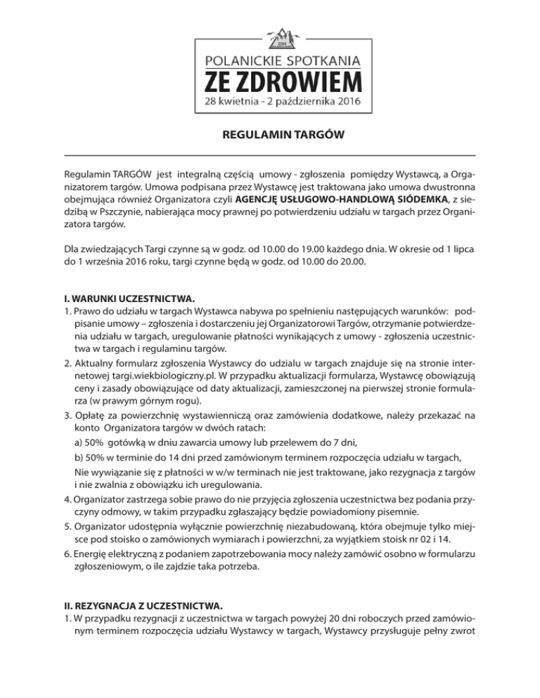 REGULAMIN TARGÓW Regulamin TARGÓW jest integralną częścią umowy - zgłoszenia pomiędzy Wystawcą, a Organizatorem targów. Umowa podpisana przez Wystawcę jest traktowana jako umowa dwustronna obejmująca również Organizatora czyli AGENCJĘ USŁUGOWO-HANDLOWĄ SIÓDEMKA, z siedzibą w Pszczynie, nabierająca mocy prawnej po potwierdzeniu udziału w targach przez Organizatora targów. Dla zwiedzających Targi czynne są w godz. od 10.00 do 19.00 każdego dnia. W okresie od 1 lipca do 1 września 2016 roku, targi czynne będą w godz. od 10.00 do 20.00. I. WARUNKI UCZESTNICTWA. 1. Prawo do udziału w targach Wystawca nabywa po spełnieniu następujących warunków: podpisanie umowy – zgłoszenia i dostarczeniu jej Organizatorowi Targów, otrzymanie potwierdzenia udziału w targach, uregulowanie płatności wynikających z umowy - zgłoszenia uczestnictwa w targach i regulaminu targów. 2. Aktualny formularz zgłoszenia Wystawcy do udzialu w targach znajduje się na stronie internetowej targi.wiekbiologiczny.pl. W przypadku aktualizacji formularza, Wystawcę obowiązują ceny i zasady obowiązujące od daty aktualizacji, zamieszczonej na pierwszej stronie formularza (w prawym górnym rogu). 3. Opłatę za powierzchnię wystawienniczą oraz zamówienia dodatkowe, należy przekazać na konto Organizatora targów w dwóch ratach: a) 50% gotówką w dniu zawarcia umowy lub przelewem do 7 dni, b) 50% w terminie do 14 dni przed zamówionym terminem rozpoczęcia udziału w targach, Nie wywiązanie się z płatności w w/w terminach nie jest traktowane, jako rezygnacja z targów i nie zwalnia z obowiązku ich uregulowania. 4. Organizator zastrzega sobie prawo do nie przyjęcia zgłoszenia uczestnictwa bez podania przyczyny odmowy, w takim przypadku zgłaszający będzie powiadomiony pisemnie. 5. Organizator udostępnia wyłącznie powierzchnię niezabudowaną, która obejmuje tylko miejsce pod stoisko o zamówionych wymiarach i powierzchni, za wyjątkiem stoisk nr 02 i 14. 6. Energię elektryczną z podaniem zapotrzebowania mocy należy zamówić osobno w formularzu zgłoszeniowym, o ile zajdzie taka potrzeba. II. REZYGNACJA Z UCZESTNICTWA. 1. W przypadku rezygnacji z uczestnictwa w targach powyżej 20 dni roboczych przed zamówionym terminem rozpoczęcia udziału Wystawcy w targach, Wystawcy przysługuje pełny zwrot wpłaconych zaliczek na poczet targów. 2. Jeżeli rezygnacja z targów nastąpi na krócej niż 20 dni roboczych przed ustalonym dla Wystawcy terminem wystawy, Wystawca jest zobowiązany do pokrycia pełnej odpłatności za udział w targach wynikającej z umowy – zgłoszenia. 3. Jeżeli Wystawca nie zagospodaruje zamówionego stoiska na czas targów, nie zwalnia go to z obowiązku uiszczenia pełnej odpłatności za stoisko. 4. Rezygnację należy zgłosić pisemnie przy zachowaniu ww. terminów (liczy się data wpływu rezygnacji do Organizatora targów). III. LOKALIZACJA, ZAGOSPODAROWANIE I LIKWIDACJA STOISKA. 1. Wystawca będzie powiadomiony pisemnie lub elektronicznie o lokalizacji stoiska wraz z nadanym numerem stoiska, a także otrzyma dodatkowe informacje organizacyjne. 2. Organizator zastrzega sobie prawo do zmiany lokalizacji stoiska jeżeli z powodów techniczno-organizacyjnych nie będzie możliwe jego zrealizowanie wg wcześniejszych ustaleń (Wystawca będzie powiadomiony o wszelkich zmianach). 3. Wynajęte stoisko przeznaczone jest wyłącznie dla Wystawcy, który dopełnił formalności zgłoszeniowych. Podnajem przydzielonej powierzchni targowej innej firmie nie mającej podpisanej umowy z organizatorem, wymaga zgłoszenia u organizatora i uzyskanie jego akceptacji. 4. Eksponaty wystawiennicze nie mogą być umieszczone w ciągach komunikacyjnych. 5. Zabrania się umieszczania eksponatów oraz materiałów reklamowych w sposób powodujący trwałe uszkodzenia ścian w obiekcie (np. wiercenie, przybijanie gwoździ, mocowanie za pomocą pinesek bądź stosowanie taśm czy folii samoprzylepnych powodujących jakiekolwiek uszkodzenia. W każdym takim przypadku Organizator obciąży Wystawcę dodatkowymi kosztami w wysokości zaistniałych uszkodzeń. 6. Stoiska można urządzać w dniu poprzedzającym termin obowiązujący Wystawcę do udziału w targach w od godz. 20.00 do godz. 21.30, lub w dzień rozpoczęcia od godz. 8.00 do 9.30. Od godz. 10.00 targi udostępnione są dla zwiedzających. 7. Likwidację stoiska oraz wywóz eksponatów należy wykonać w dniu zakończenia udziału w targach, po ich zamknięciu dla zwiedzających. 8. Wystawca jest zobowiązany we własnym zakresie zapewnić ład, porządek i czystość na swoim stoisku. 9. Stoisko winno być przywrócone po zdemontowaniu ekspozycji do stanu pierwotnego i zdane organizatorowi. IV. ZABEZPIECZENIE MIENIA I POSTANOWIENIA KOŃCOWE. 1. Organizator nie ubezpiecza eksponatów na czas transportu, montażu i demontażu ekspozycji oraz w czasie trwania imprezy. 2. Wystawca ubezpiecza eksponaty we własnym zakresie oraz ubezpiecza się od OC na czas transportu, montażu, demontażu stoiska i trwania targów. 3. Organizator zabezpiecza teren targów po zamknięciu imprezy dla zwiedzających każdego dnia, aż do otwarcia w dniu następnym służbami ochrony, za wyjątkiem stoisk usytuowanych poza obiektem targowym. 4. Wystawca jest zobowiązany do zabezpieczenia swoich eksponatów targowych przed uszkodzeniem oraz kradzieżą w czasie godzin udostępnionych dla publiczności, jak również zapewnić obsadę stoiska najpóźniej na 15 minut przed otwarciem targów dla zwiedzających, aż do czasu opuszczenia pawilonu wystawowego przez gości targowych na zakończenie każdego dnia trwania targów. 5. Usługa kolportażu ulotek na targach polega na ich wykładaniu w specjalnych do tego przeznaczonych miejscach na terenie pawilonu. 6. W przypadku okoliczności od niego niezależnych Organizator zastrzega sobie prawo do odwołania, skrócenia, odłożenia lub częściowego zamknięcia imprezy. W takim przy