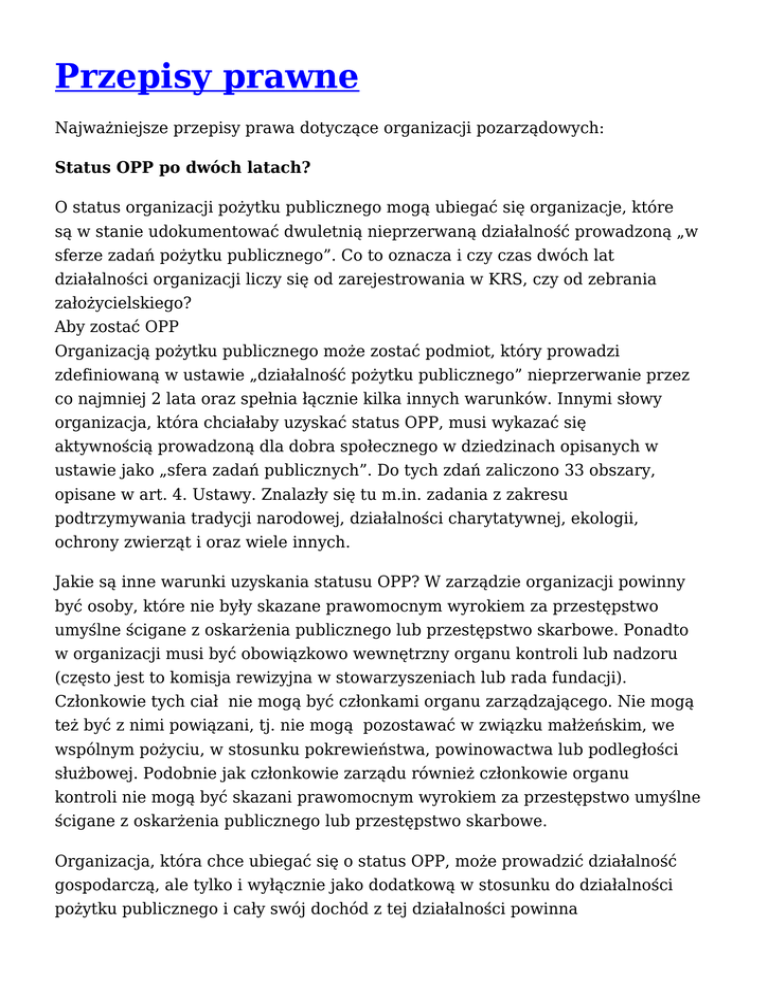 Przepisy prawne Najważniejsze przepisy prawa dotyczące organizacji pozarządowych: Status OPP po dwóch latach? O status organizacji pożytku publicznego mogą ubiegać się organizacje, które są w stanie udokumentować dwuletnią nieprzerwaną działalność prowadzoną „w sferze zadań pożytku publicznego”. Co to oznacza i czy czas dwóch lat działalności organizacji liczy się od zarejestrowania w KRS, czy od zebrania założycielskiego? Aby zostać OPP Organizacją pożytku publicznego może zostać podmiot, który prowadzi zdefiniowaną w ustawie „działalność pożytku publicznego” nieprzerwanie przez co najmniej 2 lata oraz spełnia łącznie kilka innych warunków. Innymi słowy organizacja, która chciałaby uzyskać status OPP, musi wykazać się aktywnością prowadzoną dla dobra społecznego w dziedzinach opisanych w ustawie jako „sfera zadań publicznych”. Do tych zdań zaliczono 33 obszary, opisane w art. 4. Ustawy. Znalazły się tu m.in. zadania z zakresu podtrzymywania tradycji narodowej, działalności charytatywnej, ekologii, ochrony zwierząt i oraz wiele innych. Jakie są inne warunki uzyskania statusu OPP? W zarządzie organizacji powinny być osoby, które nie były skazane prawomocnym wyrokiem za przestępstwo umyślne ścigane z oskarżenia publicznego lub przestępstwo skarbowe. Ponadto w organizacji musi być obowiązkowo wewnętrzny organu kontroli lub nadzoru (często jest to komisja rewizyjna w stowarzyszeniach lub rada fundacji). Członkowie tych ciał nie mogą być członkami organu zarządzającego. Nie mogą też być z nimi powiązani, tj. nie mogą pozostawać w związku małżeńskim, we wspólnym pożyciu, w stosunku pokrewieństwa, powinowactwa lub podległości służbowej. Podobnie jak członkowie zarządu również członkowie organu kontroli nie mogą być skazani prawomocnym wyrokiem za przestępstwo umyślne ścigane z oskarżenia publicznego lub przestępstwo skarbowe. Organizacja, która chce ubiegać się o status OPP, może prowadzić działalność gospodarczą, ale tylko i wyłącznie jako dodatkową w stosunku do działalności pożytku publicznego i cały swój dochód z tej działalności powinna przeznaczać na działalność pożytku publicznego. Dodatkowym wymogiem przy ubieganiu się o status organizacji pożytku publicznego jest obowiązek posiadania w statucie organizacji lub w innym akcie wewnętrznym (na podstawie którego działa organizacja) pewnych zapisów, które będą stanowić zabezpieczenie przed wyprowadzaniem majątku organizacji poza organizację. Zakazy dotyczą m.in. udzielania pożyczek, zaciągania zobowiązań majątkiem organizacji, przekazywania majątku na rzecz innych członków czy wykorzystywania go. Dwa lata Ustawa o pożytku publicznym i o wolontariacie wyraźnie wskazuje, że organizacją OPP może stać się tylko ten podmiot, który jest w stanie wykazać, że przez okres co najmniej dwóch lat prowadził aktywną i nieprzerwaną działalność w sferze zadań pożytku publicznego i na rzecz szerokiego kręgu odbiorców, wyodrębnionych ze względu na różne kryteria. Taki rodzaj działalności organizacja może udowodnić poprzez pokazanie sprawozdań ze swojej działalności. Aby udokumentować działania można dołączyć również np. rekomendacje instytucji, osób, które znają działalność organizacji, a także materiały prasowe. Uwaga! Starając się o status OPP Warto pamiętać, że to nie tylko czas istnienia organizacji się liczy, ważny jest także czas prowadzenia określonych działań. Organizacja może bowiem istnieć dwa lata, ale jeśli nie prowadziła przez ten czas działań, które spełniają ustawowe warunki, może nie uzyskać statusu OPP. Podstawa prawna: Ustawa o działalności pożytku publicznego i wolontariacie z dnia 24 kwietnia 2003 r. (Dz. U. z 2010 r., Nr 234, poz. 1536 z późn. zm.) Nieodpłatne informacje w radio i telewizji Dnia 30 czerwca 2011 r. wejdzie w życie Rozporządzenie Krajowej Rady Radiofonii i Telewizji z dnia 29 kwietnia określające tryb postępowania związanego z nieodpłatnym informowaniem w programach jednostek publicznej radiofonii i telewizji o prowadzonej nieodpłatnej działalności przez organizacje pożytku publicznego. Czytaj więcej http://isap.sejm.gov.pl/DetailsServlet?id=WDU20111090638 Nowe wzory oferty na realizację zadania publicznego W dniu 18 stycznia 2011 r. wchodzi w życie nowy wzór oferty, umowy i sprawozdania z realizacji zadania publicznego określony ROZPORZĄDZENIEM MINISTRA PRACY I POLITYKI SPOŁECZNEJ z dnia 15 grudnia 2010 r. w sprawie wzoru oferty i ramowego wzoru umowy dotyczących realizacji zadania publicznego oraz wzoru sprawozdania z wykonania tego zadania. Czytaj więcej http://wiadomosci.ngo.pl/files/wiadomosci.ngo.pl/public/dokumenty_2009/rozporz adzenie_15_12_2011.pdf ROZPORZĄDZENIE MINISTRA KULTURY I DZIEDZICTWA NARODOWEGO z dnia 15 września 2010 r. w sprawie bezpieczeństwa i higieny pracy przy organizacji i realizacji widowisk (Dz. U. Nr 184 poz.1240). Rozporządzenie określa warunki bezpieczeństwa i higieny pracy przy organizacji, przygotowaniu, realizacji i likwidacji widowiska przez podmiot prowadzący działalność kulturalną, w tym wymagania dotyczące miejsca realizacji widowiska, koncepcji inscenizacyjnej i projektu scenograficznego. Ponadto znajdują sie tam informacje nt. obowiązków organizatora widowiska, obowiązków osób związanych z organizacją, przygotowaniem i realizacją widowiska, a także wymagania dotyczące miejsc realizacji widowiska. Czytaj więcej na www.infor.pl/dziennik-ustaw,rok,2010,num,184/poz,1240 W dniu 28 października 2010 r. Rady Miasta Starogard Gdański podjęła Uchwałę Nr LXIII/555/2010 w sprawie przyjęcia Programu współpracy Gminy Miejskiej Starogard Gdański z organizacjami pozarządowymi i podmiotami, o których mowa w ustawie o działalności pożytku publicznego i o wolontariacie, w 2011 roku. Czytaj więcej http://bi